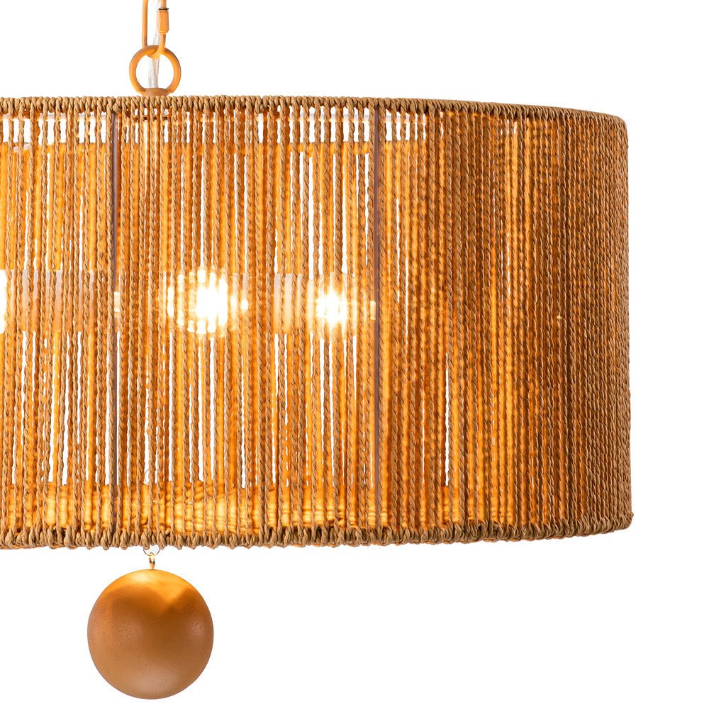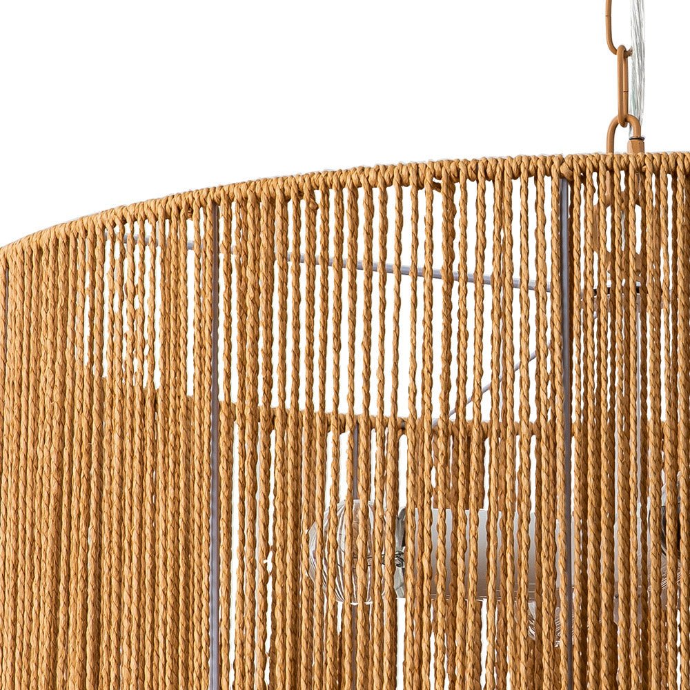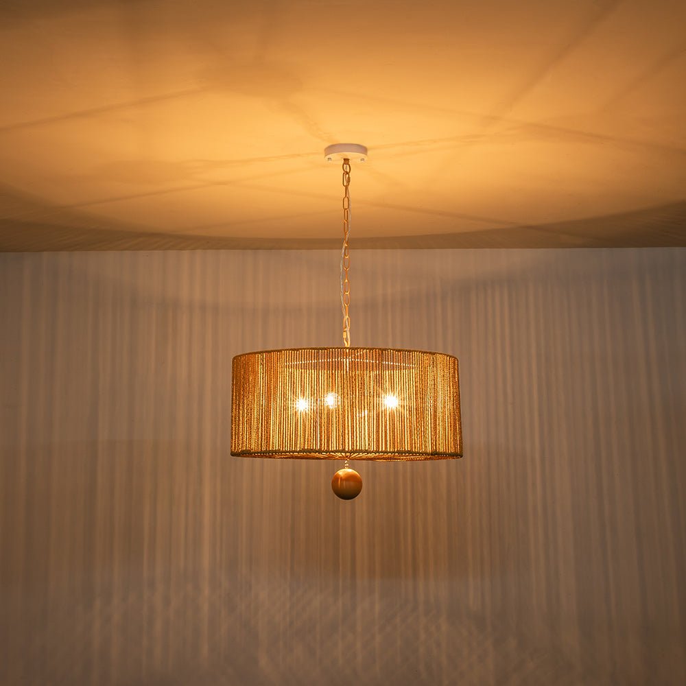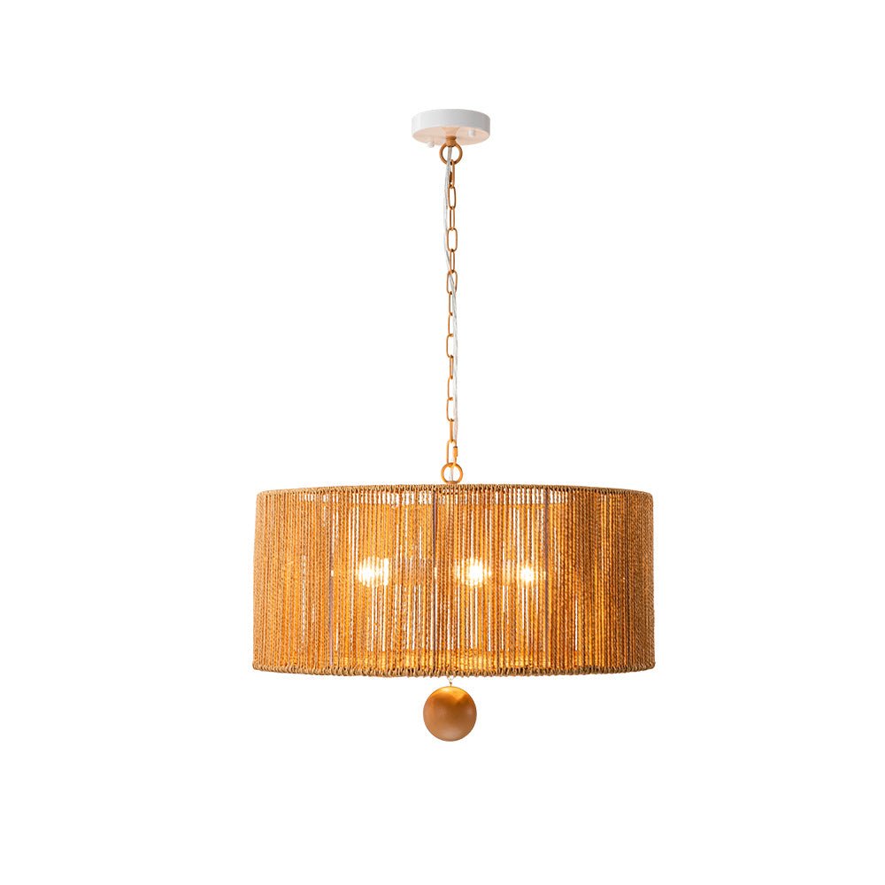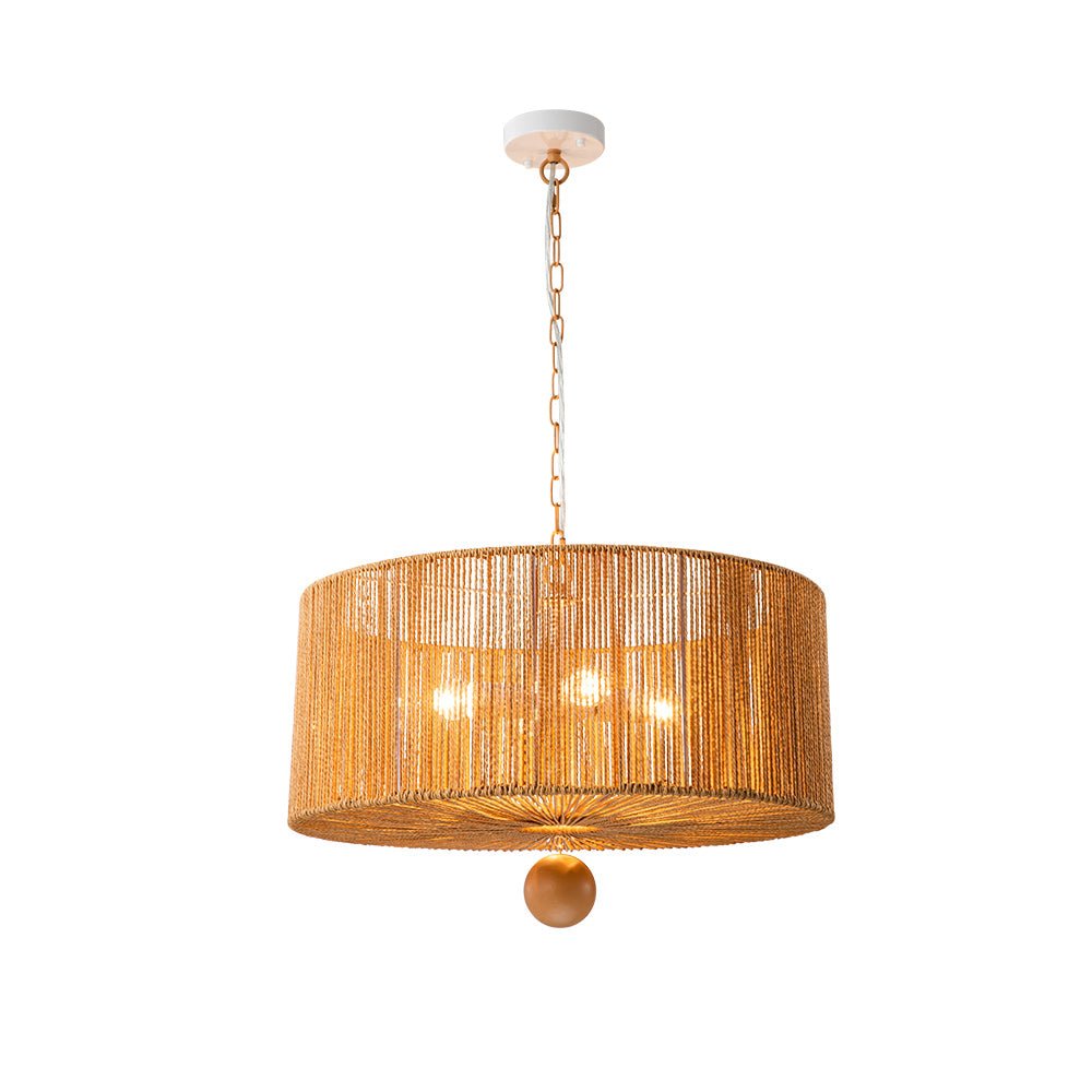 Lisää kotiisi boheemia eleganssia yhdistämällä tämä 4-valaisinköysiriippuvalaisin. Tämä riippuvalaisin, jossa on leveä rumpurunko, joka on kiedottu ruskeilla kudottuilla köysillä, korostaa mitä tahansa ruokailutilaa tai oleskelutilaa tyylikkäällä maalaismaisella ja elegantilla eksoottisella tuulella. Ruskea ketju tarjoaa säädettävän ripustuspituuden harmonisen, maanläheisen sävyn ja vaivattoman, rennon ilmeen saamiseksi. Tämä vintage ruskea köysi leveä rumpuvalaisin tuo mieleen rytminen, saaritunnelma.Tiedot