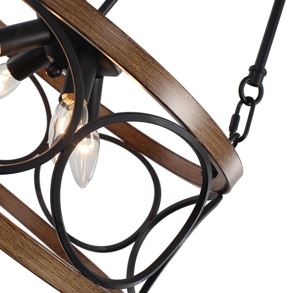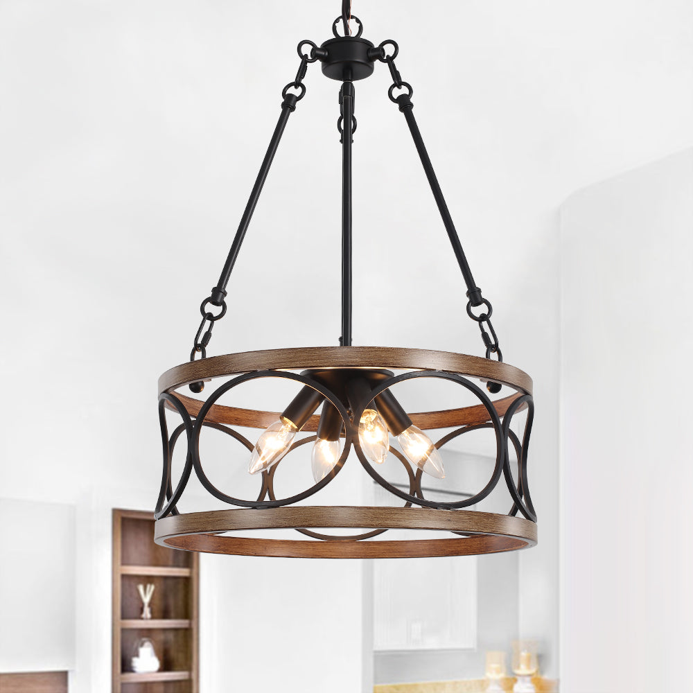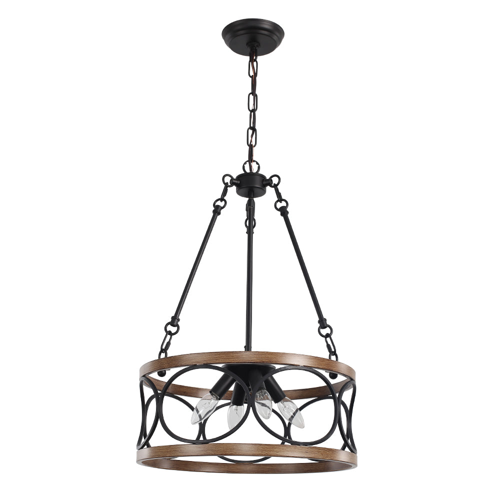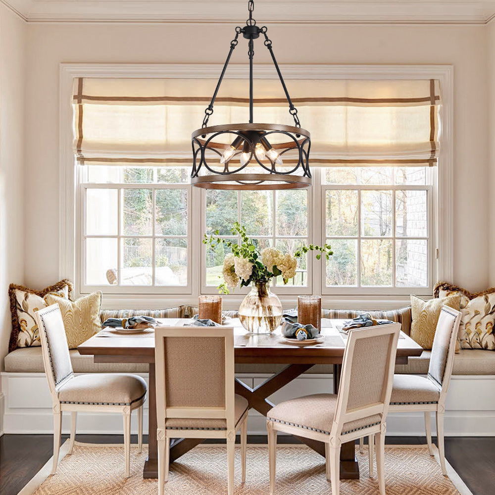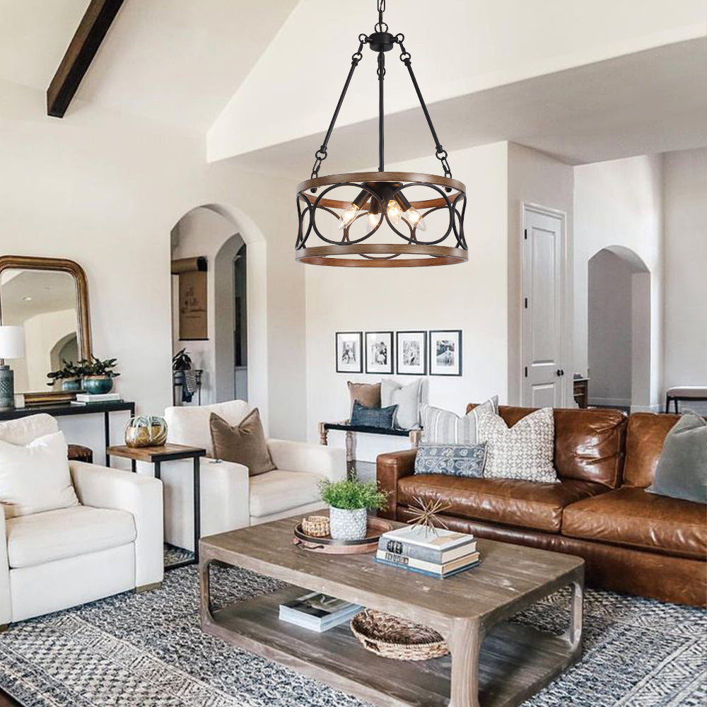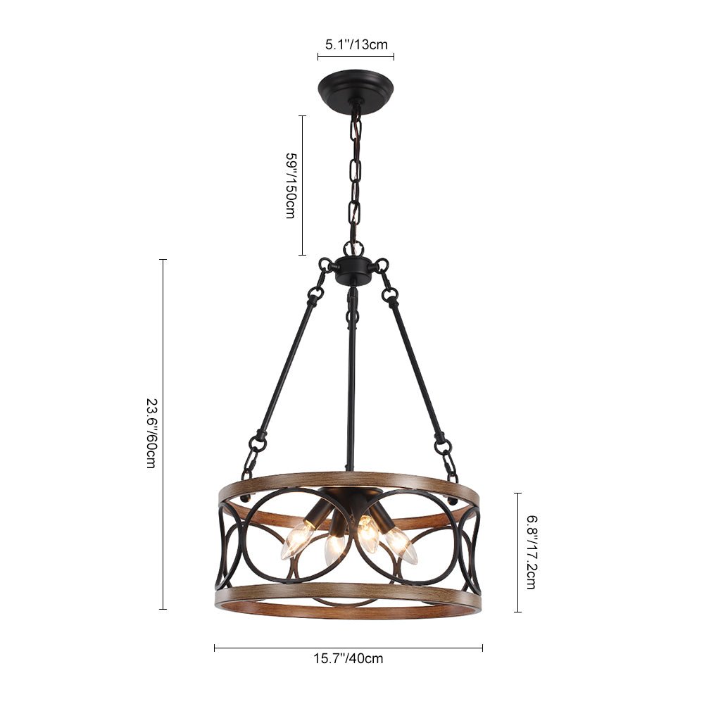Tämä maalaistalon inspiraation jälkeen muokattu avoin rumpukruunu lisää ripaus modernia maalaismaista tunnelmaa mihin tahansa järjestelyyn. Tässä maalaistalon rumpuriipusessa on rumpusiluetti, jonka halkaisija on 16 tuumaa ja korkeus 23,8 tuumaa, ja se esittelee useita pyöreitä metallikuvioita kahden puumaisen vanteen välissä harjakattoisessa kuviossa. Neljä esillä olevaa E12-kantaista polttimoa, joista jokainen on enintään 40 W:n sisällä, valaisee tilaasi runsaasti. Mikä parasta, tämä rumpuvalaisin voi säätää valaistuksen erilaisiin olosuhteisiin, jos asetat himmentimen ja himmennettävät polttimot (molemmat eivät sisälly toimitukseen). Ripustettavan ketjurakenteen ansiosta voit asentaa tämän avoimen rumpukruunun myös kaltevaan kattoon. Tämä maalaistalon rumpuvalaisin on erinomainen sekä tyylin että toimintojen tarjoaja riippumatta siitä, sijoitetaanko se yksittäin eteiseen ja mihin tahansa muuhun oleskelutilaan tai keittiösaarekkeen ja pitkän pöydän yläpuolelle.Detail