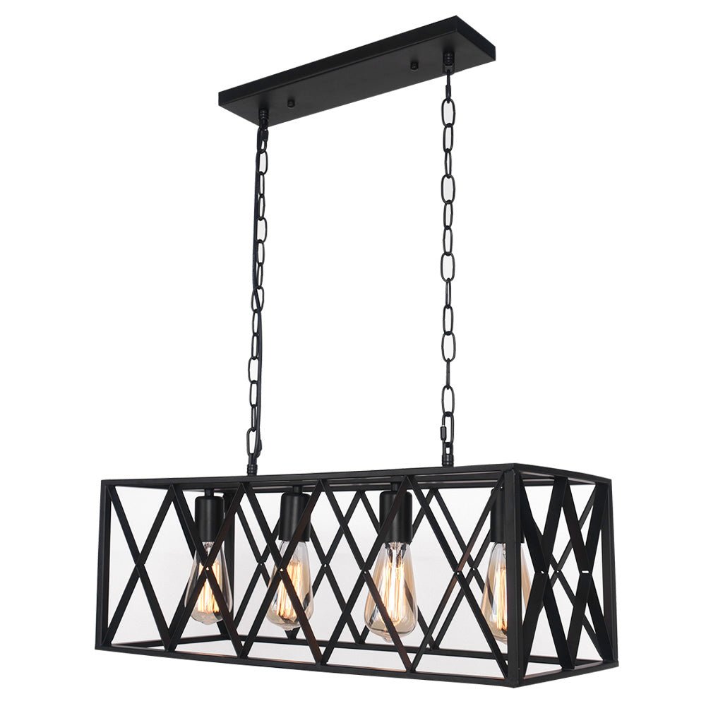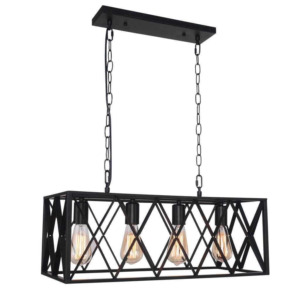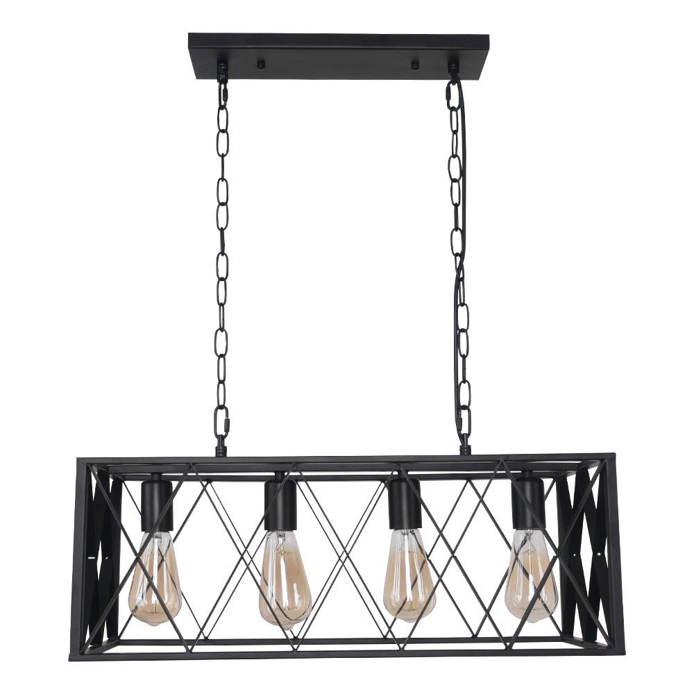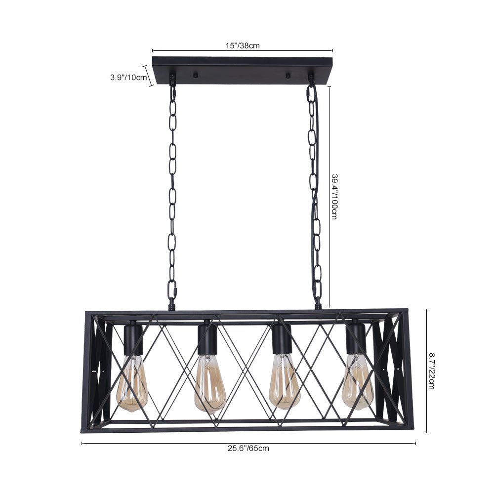 Tämä 4 valon häkkisaarekekruunu saa keittiösaarekkeen ja ruokapöydän laulamaan rohkeasti ja teollisesti. Valmistettu kiinteästä metallista silmiinpistävällä mustalla viimeistelyllä, avoin suorakaiteen muotoinen laatikkokehys, jossa on yksityiskohtainen ristikkäinen muotoilu, antaa terävän komean tunteen. Siististi sisällä kuin kaunis näyttö, neljä E26-pohjaista keskikokoista polttimoa (ei sisällä) valaisevat runsaasti tilaa. Päivitä ruokailualueesi tällä 4-kevytmetallisella suorakaiteen muotoisella keittiösaarekeriipuksella.Tiedot