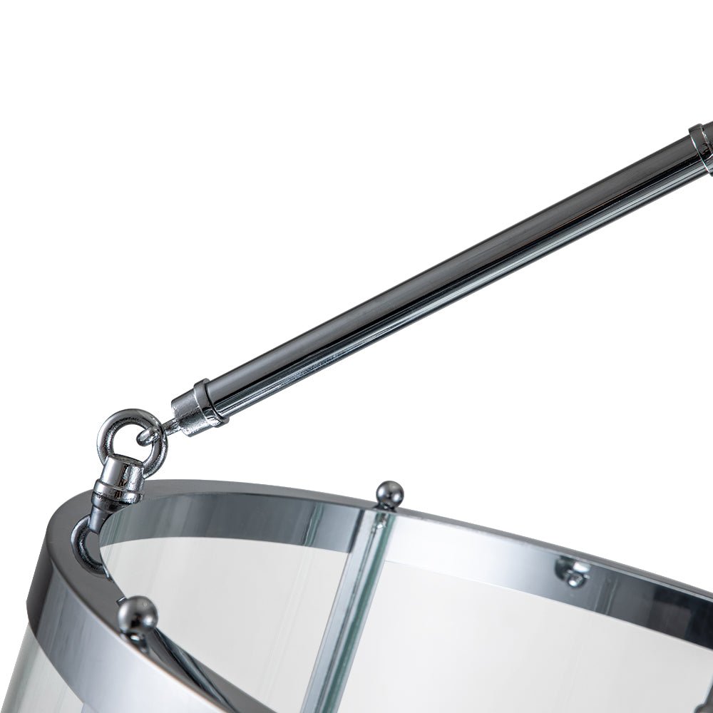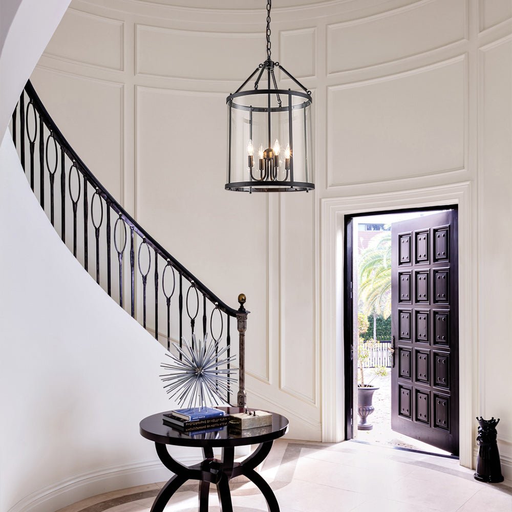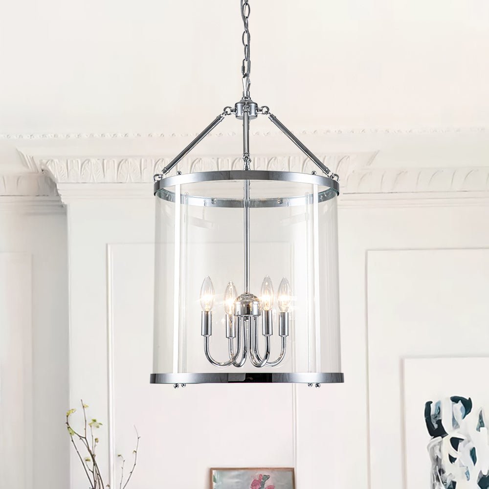 Moderni kartanoeleganssi tulee ensisilmäyksellä mieleen tästä lyhtyriippuvalosta. Kirkkaan lasisylinterihäkin sisällä on 4-valon kynttilätyyppinen kanta E12 kynttelikköpolttimoilla (ei sisälly), jotka tuovat tilaan perinteisen siluetin ja työvalaistuksen. Saatavana mustana tai kromina, tämä 4 valon kartanon lasista valmistettu leveä sylinterilyhtyriippuvalaisin on suosittu keittiösaarekkeen, ruokapöydän, eteisen, makuuhuoneen, eteisen tai olohuoneen makua kehittämään.Tiedot