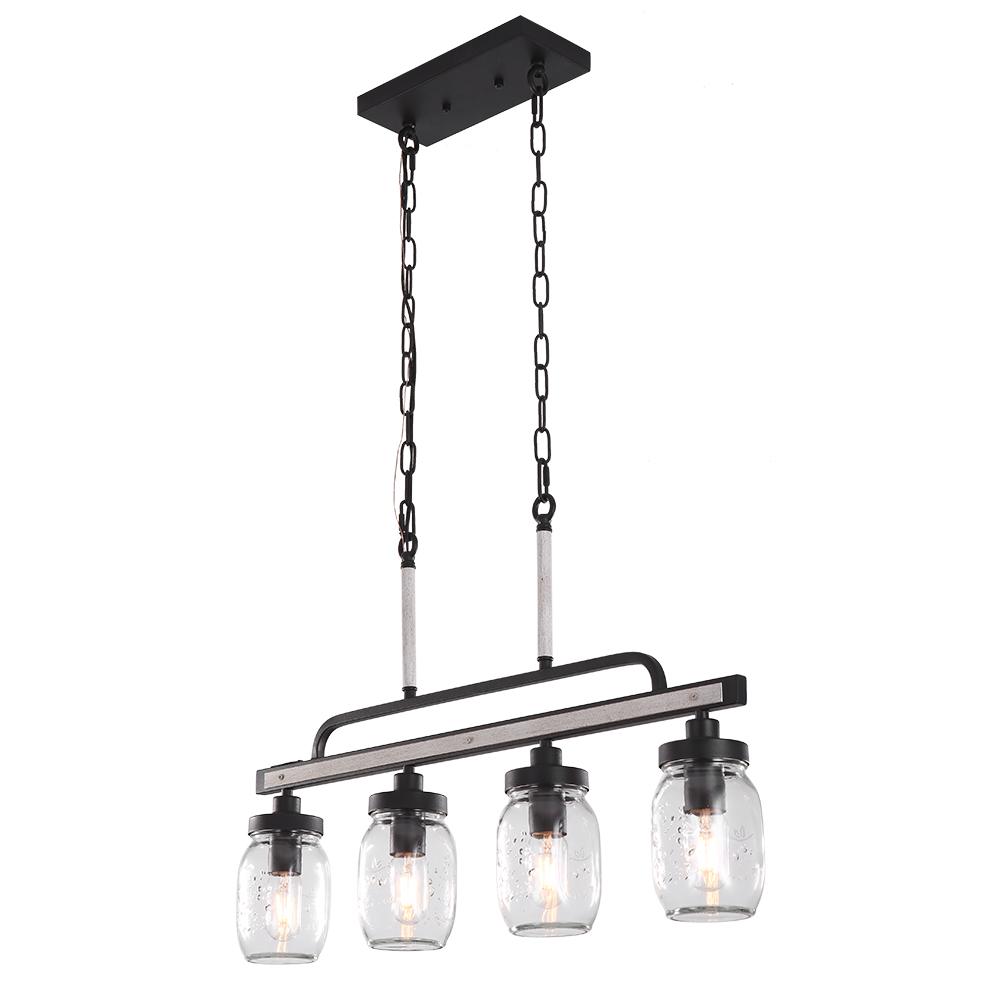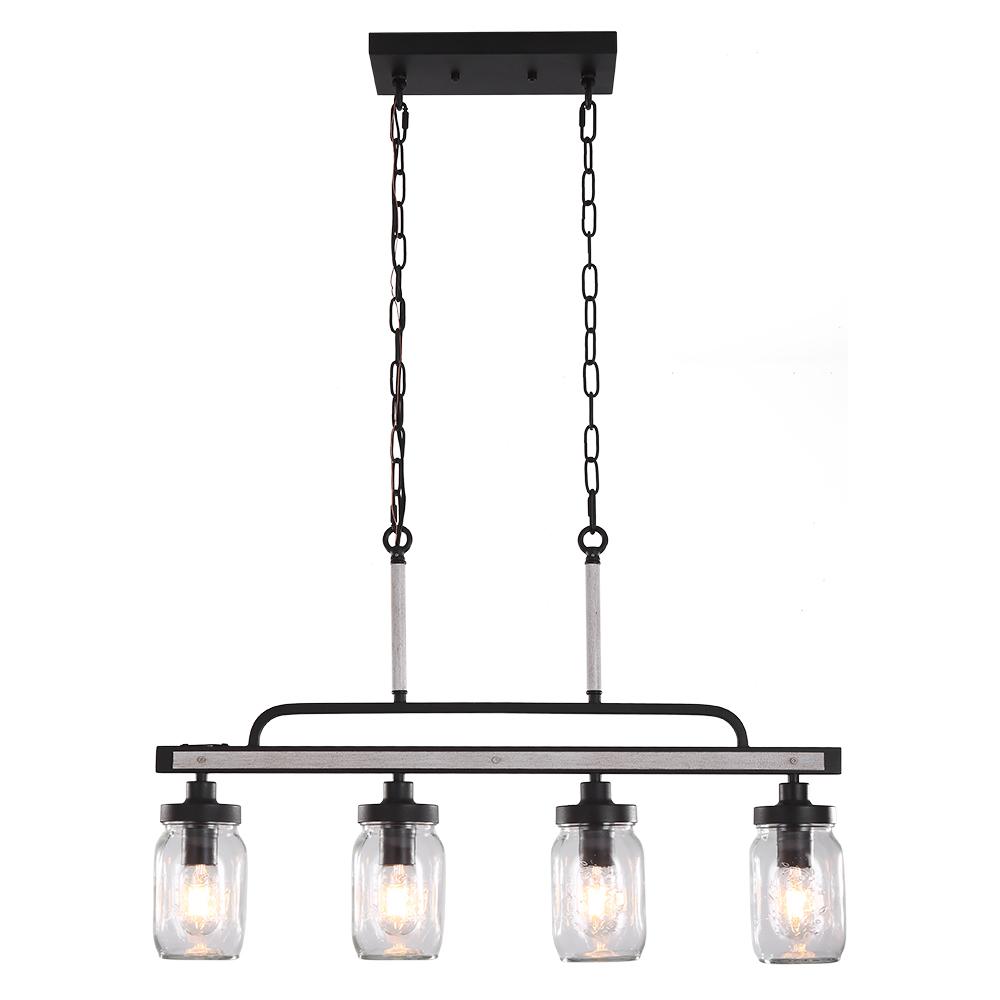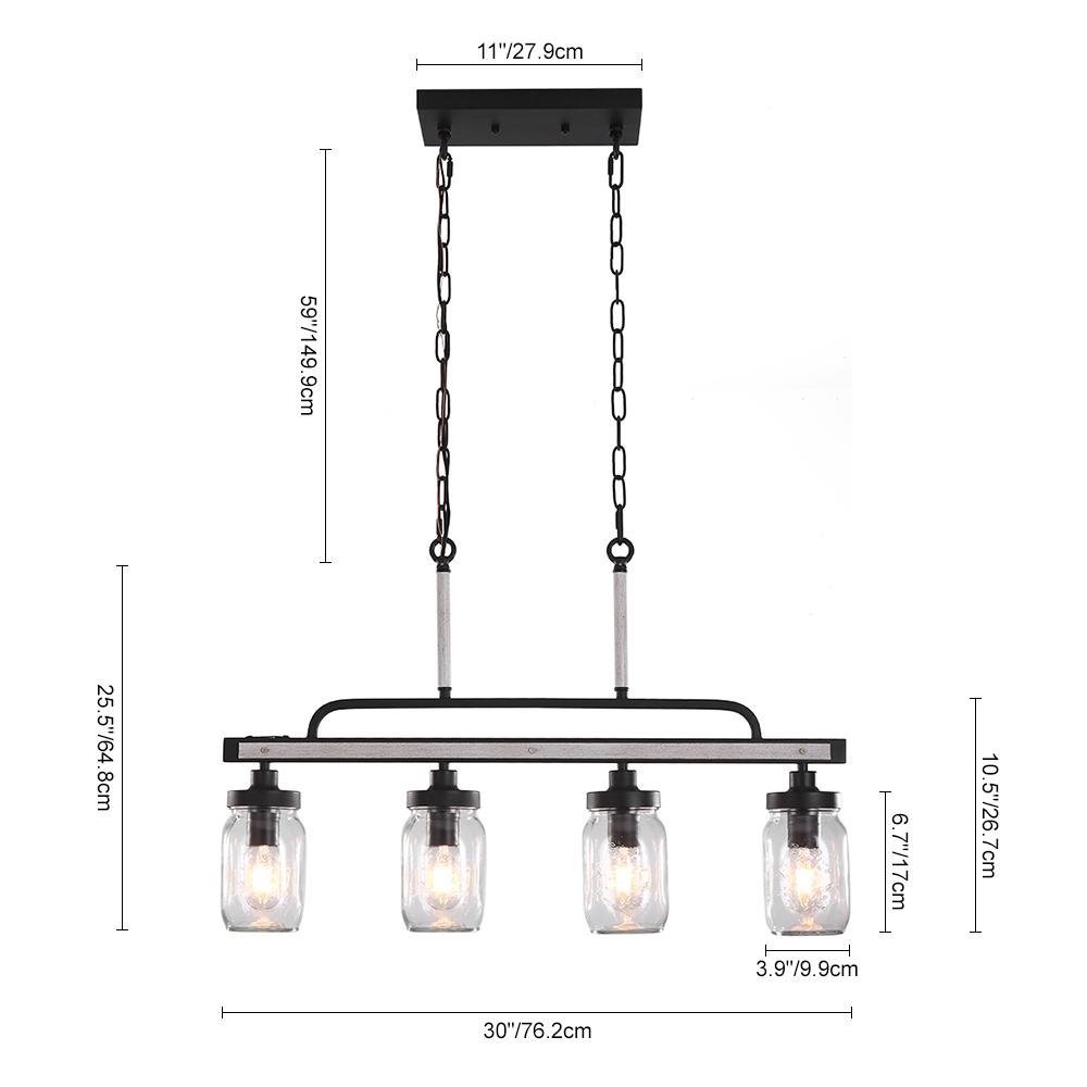 Tähän 4-kevyiseen muurauspurkkisaaririipukseen tulee neljä vintage-mason-purkkisävyä, jotka riippuvat suoraan vuoratusta puuelementeistä varustetusta tangosta. Kirkkaasta siemenlasista valmistettu muurauspurkki sopii täydellisesti keinopuun ja metallin kanssa ja tuo sisustukseesi annoksen modernia maalaistaloa. Tämän rustiikkisen lineaarisen riippuvalaisimen sisällä on 40 W E26/E27-kantaiset polttimot (ei mukana), joten sen pitäisi olla luotettava apulainen ruoanlaiton tai syömisen aikana. Jos tarvitset himmeää valaistusta, tämä 4 valon keittiösaarekeriipus on yhteensopiva himmentimen ja himmennettävien lamppujen kanssa (molemmat eivät sisälly toimitukseen). Ripustettavat ketjut varmistavat, että tämä muurattu purkkisaarekeriipus sopii sekä tasaisiin että kaltevoihin kattoihin. Täydellinen mihin tahansa retro-, teollisuus- tai moderniin keittiösaarekkeeseen, ruokailutilaan ja rentouttavaan tilaan, tämä 4-kevyinen muuraripurkkisaaririipus virkistää sisustuksen.Detail