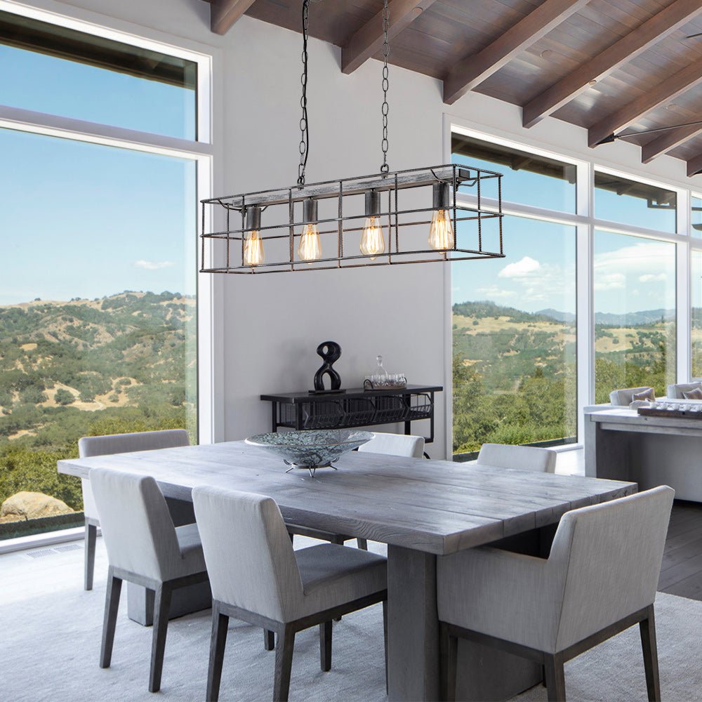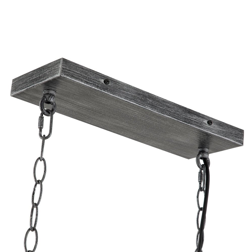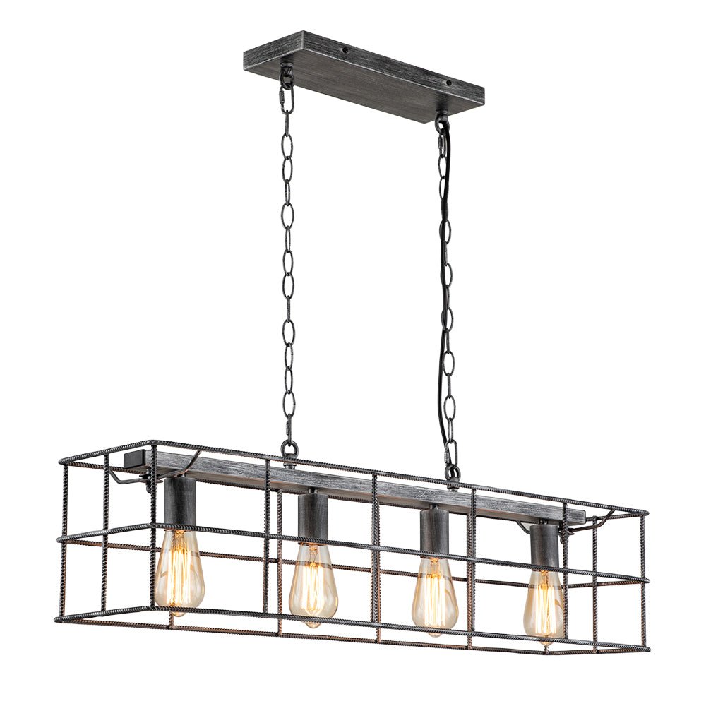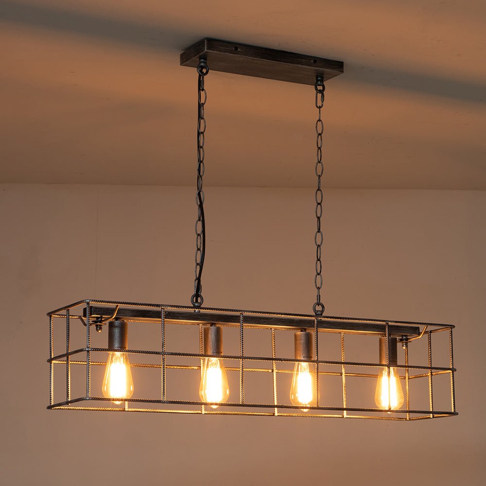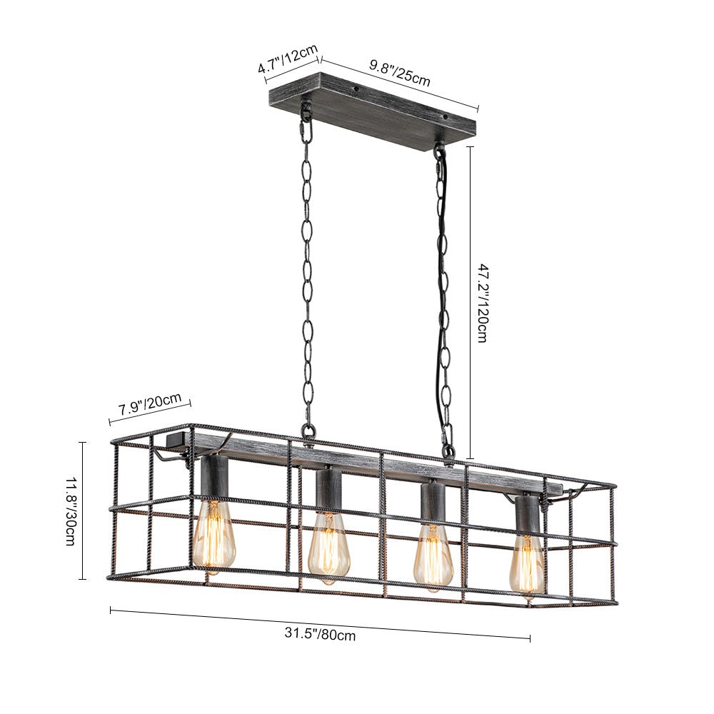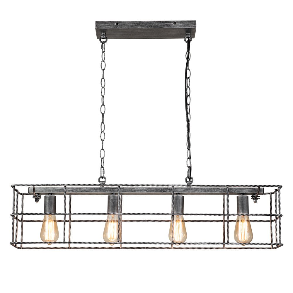 Tässä hienostuneesta maalaistalotyylistään ylpeänä tämän keittiösaarekkeen riippuvalaisimen avoin suorakaiteen muotoinen runko on valmistettu tukevasta teräksestä. Vintage-harmaa viimeistely antaa tälle teräksiselle häkkisaarikruunulle tyylikkään ja eksklusiivisen tunnelman tälle saarikruunulle. Neljä esillä olevaa keskipitkällä pohjalla olevaa E26-lamppua (ei sisälly toimitukseen) viimeistelevät tämän suorakaiteen muotoisen lineaarisen saarekekruunun teollista ilmettä ja tarjoavat työvalaistuksen täydellisesti keittiösaarekkeen, ruokapöydän ja olohuoneen valaisemiseen.Tiedot
