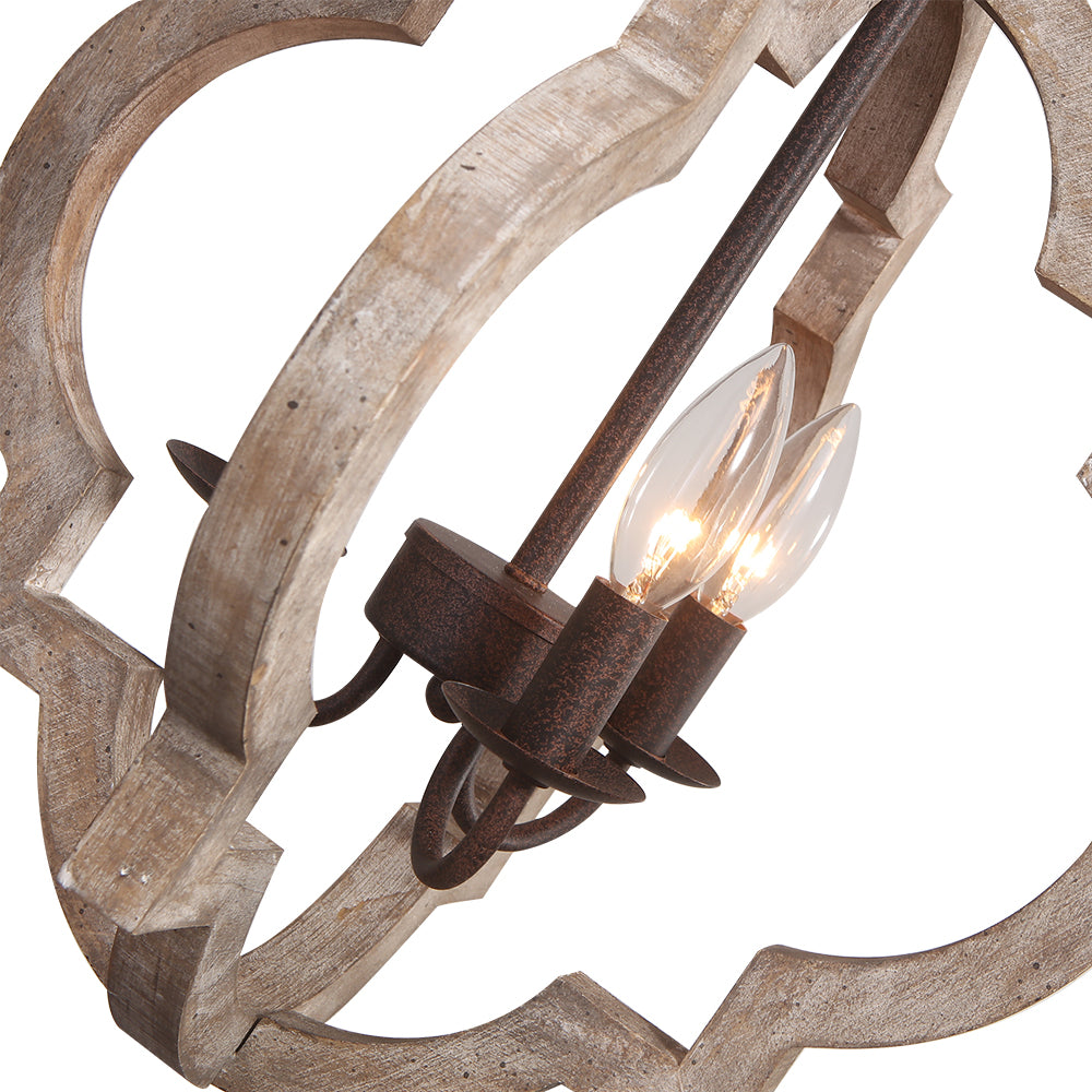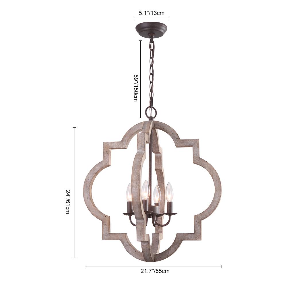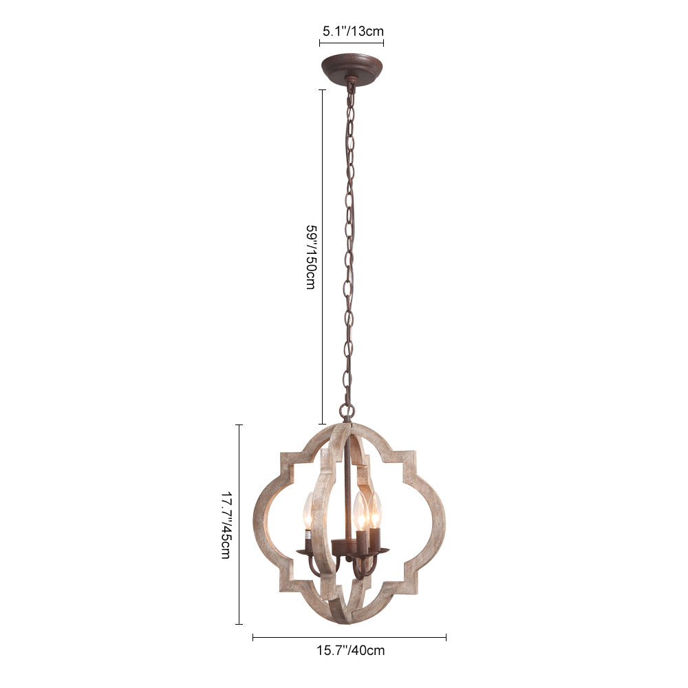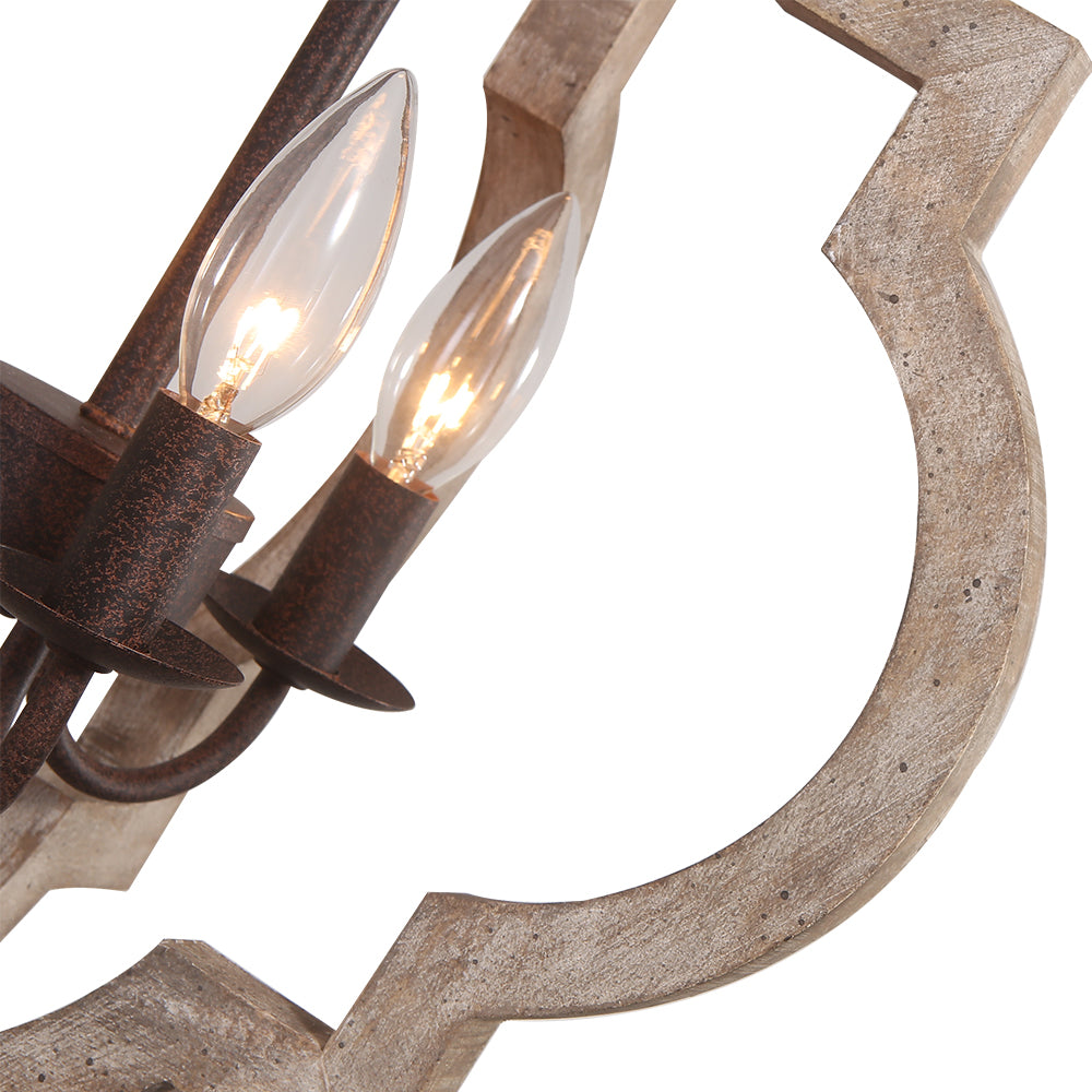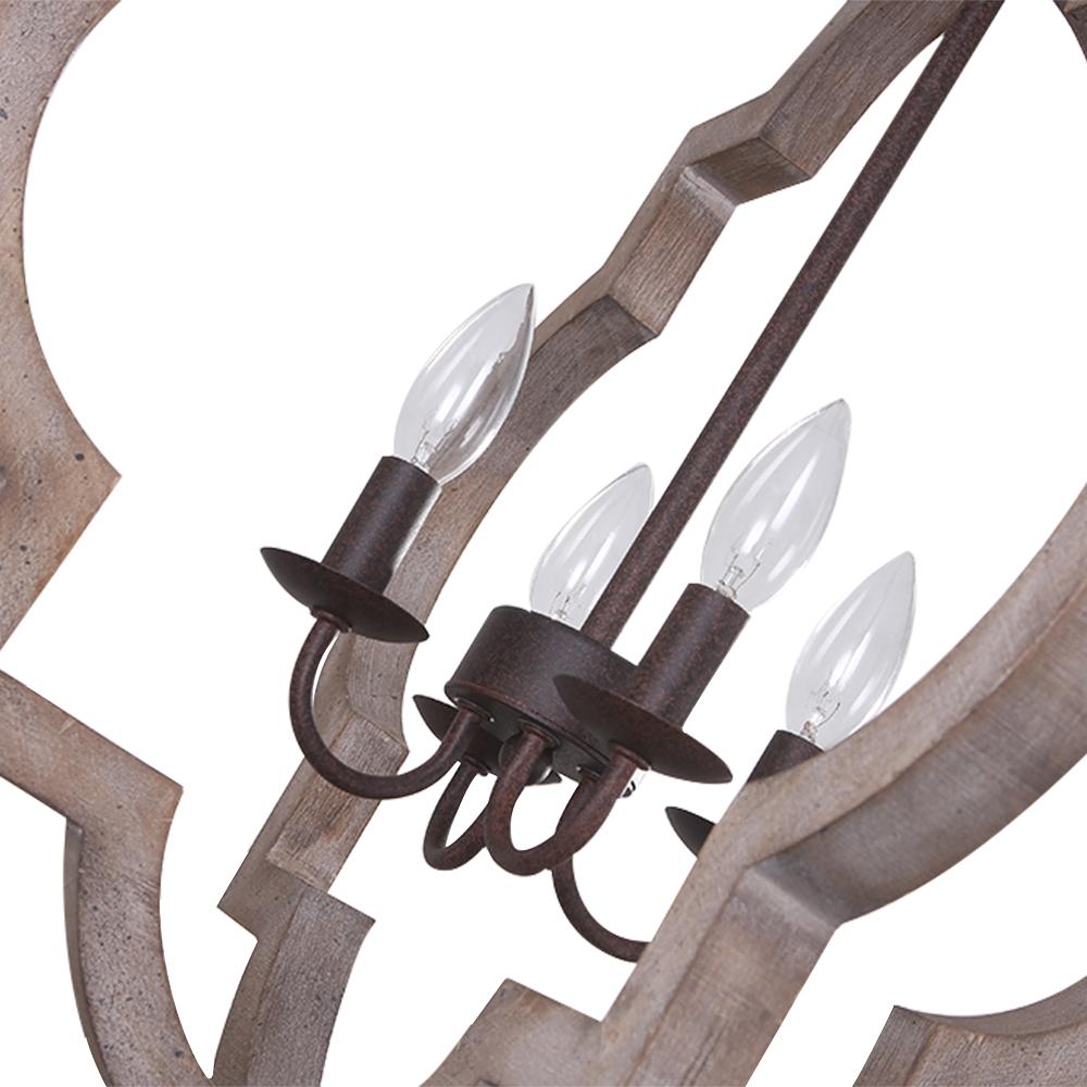 Perinteisen quatrefoil-tyylin innoittamana tässä geometrisessa kattokruunussa on pyöreä lyhtyriipus, joka tuo sinut takaisin 19. maalaismaiseen aikaan. Avoimessa puurungossa on ruosteisella metallilla viimeistelty monivalopistorasia. Kolme tai neljä E12/E14 kynttelikköpolttimoa (ei sisälly toimitukseen) täydentävät tämän nelikantaisen riippuvalaisimen retrotaiteellista ilmettä. Tämä maalaistalon puinen nelikantiippuriipus on siirtymävaiheen maalaistalo-osa, joka on ihanteellinen piristämään sisäänkäyntiäsi, ruokailuhuonettasi, keittiösaarekettasi, eteisiäsi, makuuhuoneitasi, portaikkoasi ja pyykkiäsi.Detail