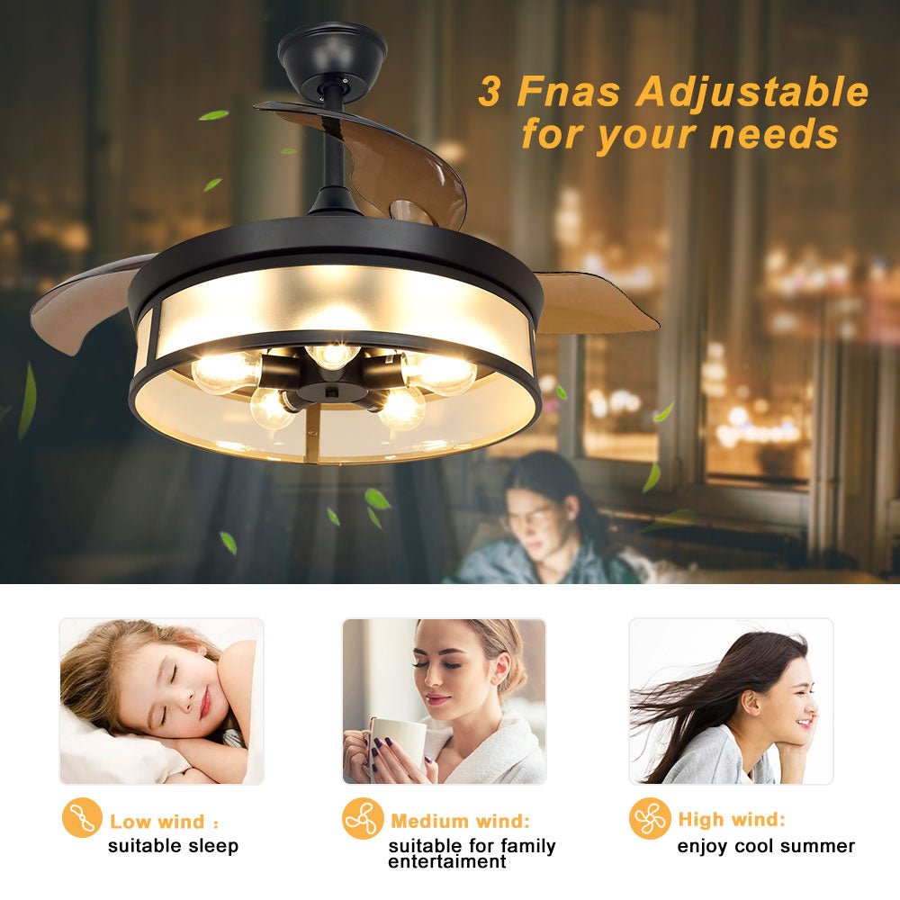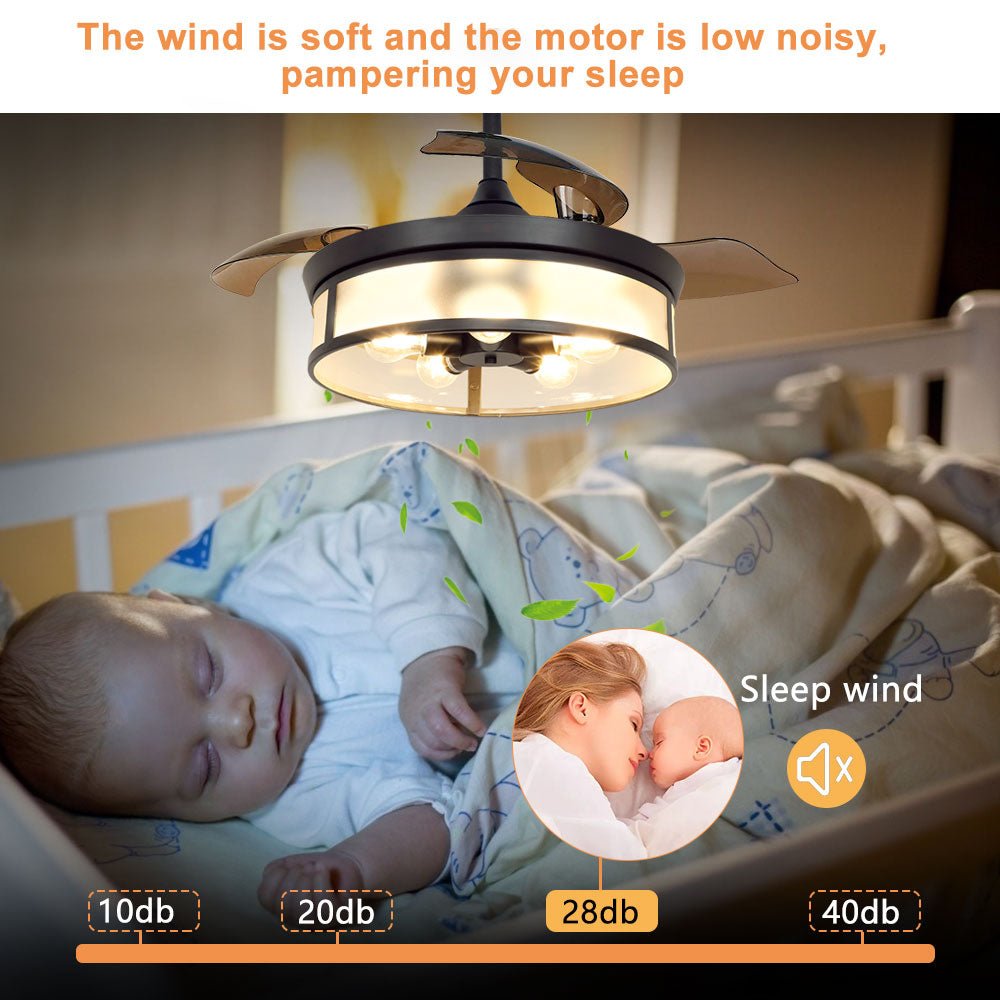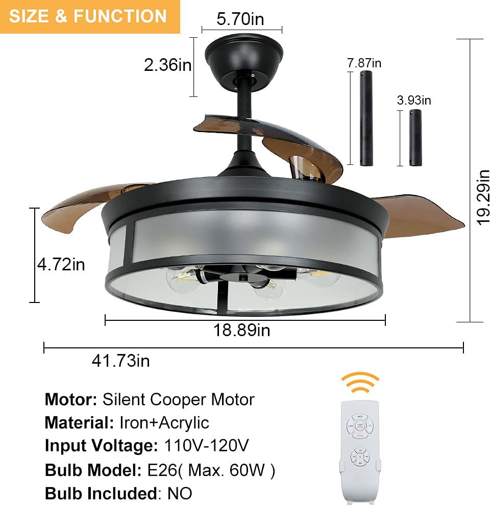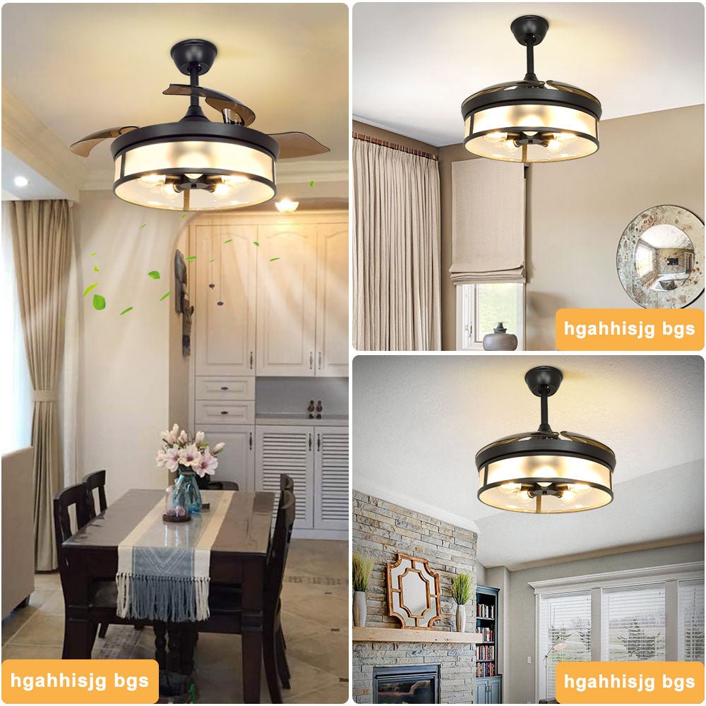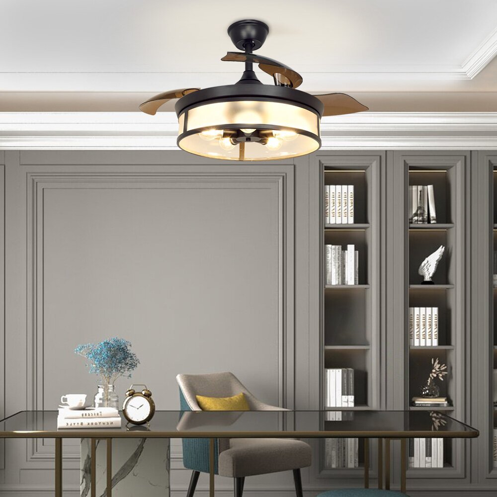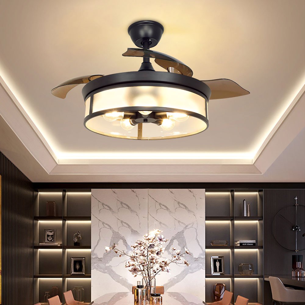 Depuley teollisuuskattotuuletin valolla, kattotuuletin sisäänvedettävällä siivellä, vintage-akryyliset kattokruunutuuletinvalaisimet kaukosäätimellä olohuoneeseen, keittiö, makuuhuone, 5 E26 pohja