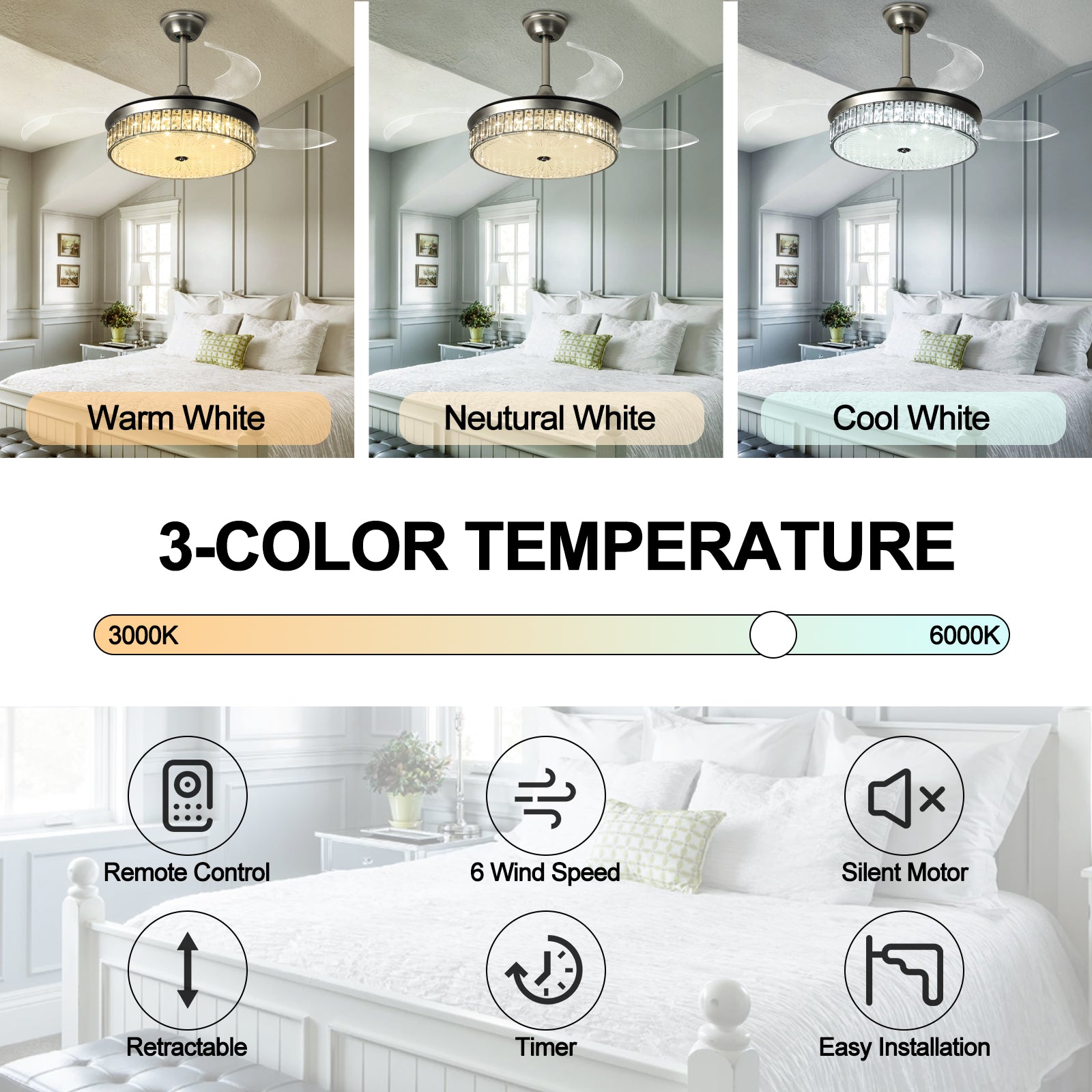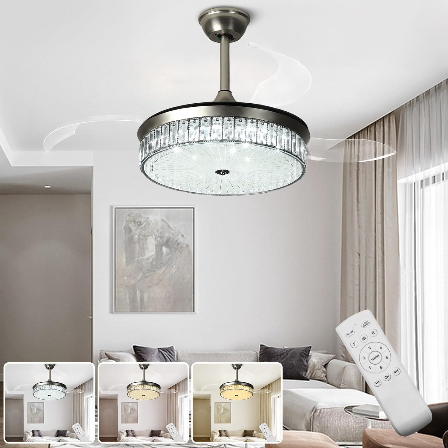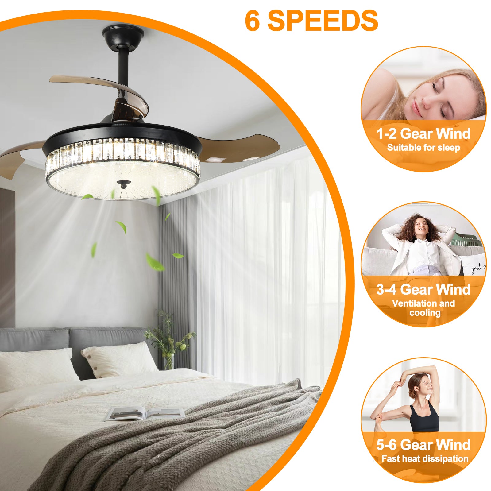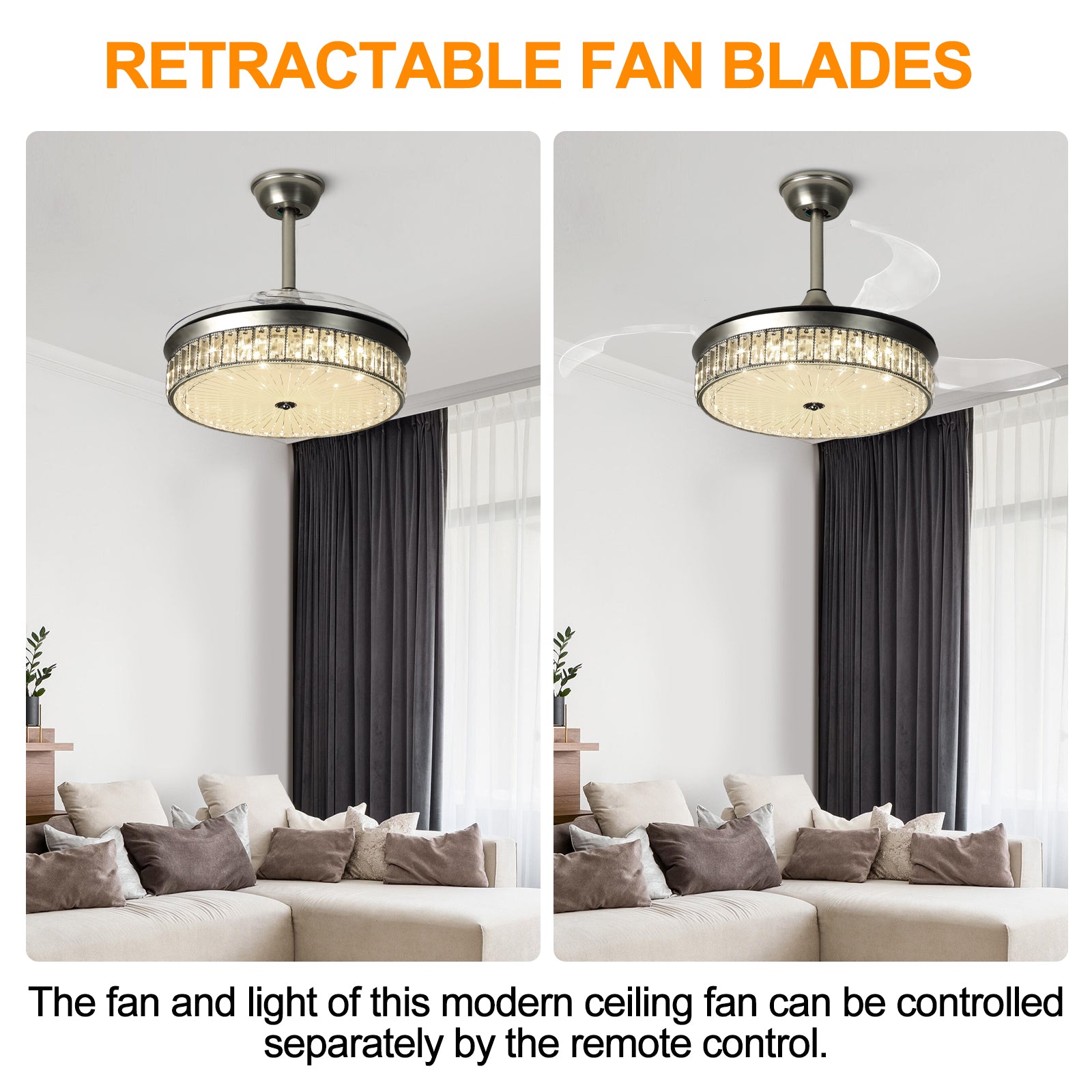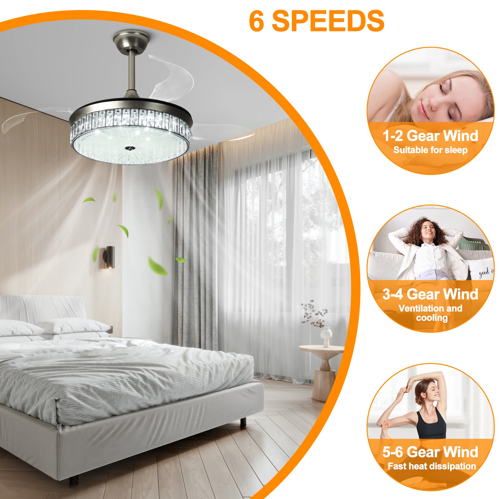 Depuley 42 tuuman kristallikatottotuulettimet ja valot makuuhuoneeseen, käännettävät tuulettimet sisäänvedettävällä 6 nopeudella ja kaukosäätimellä, hopea/taka, ennakkomyynti