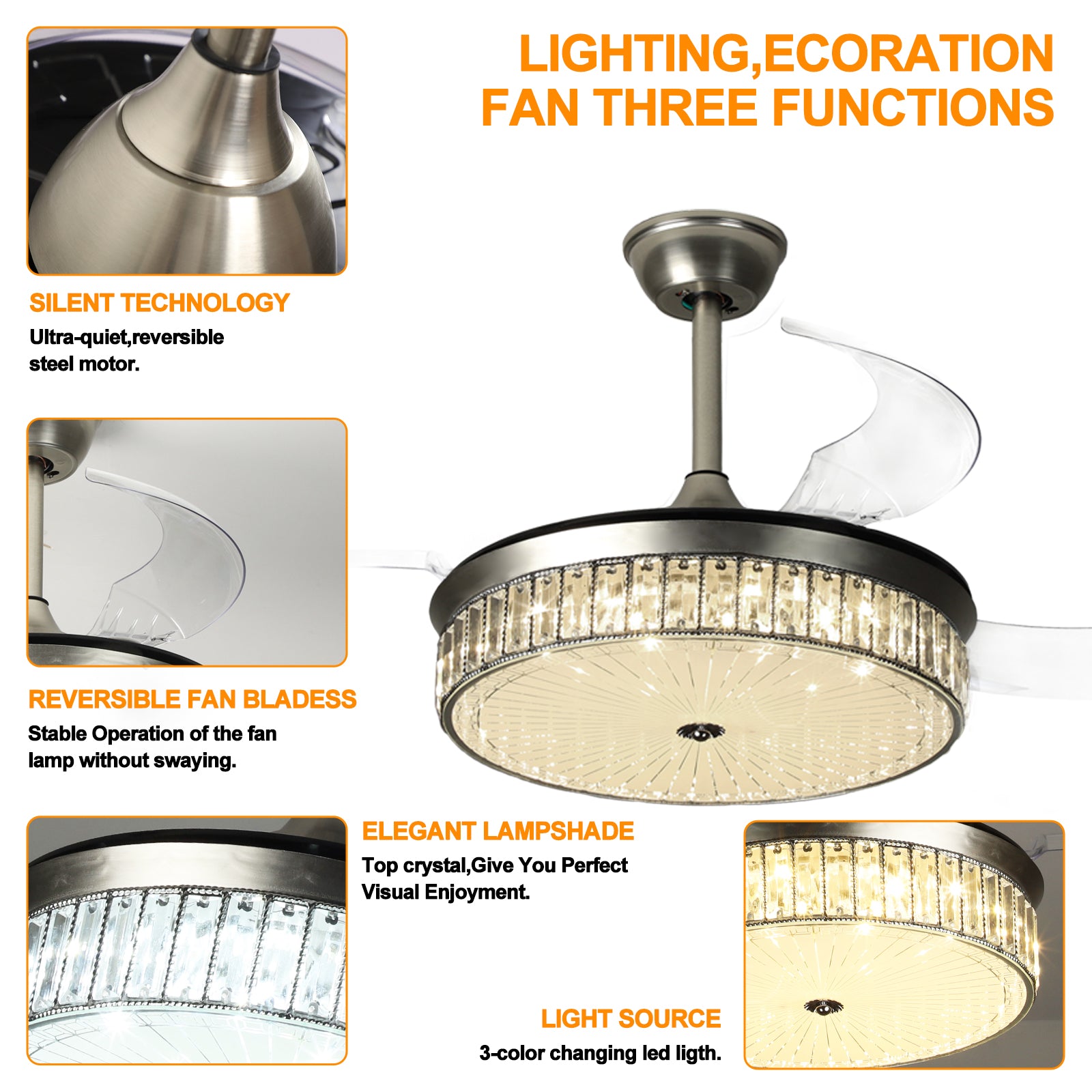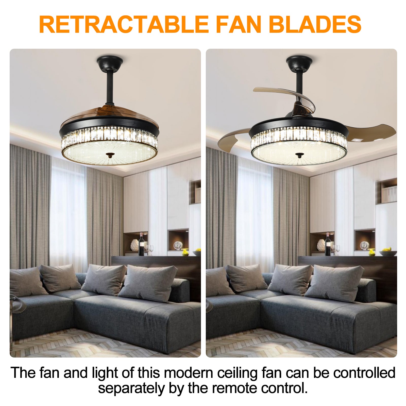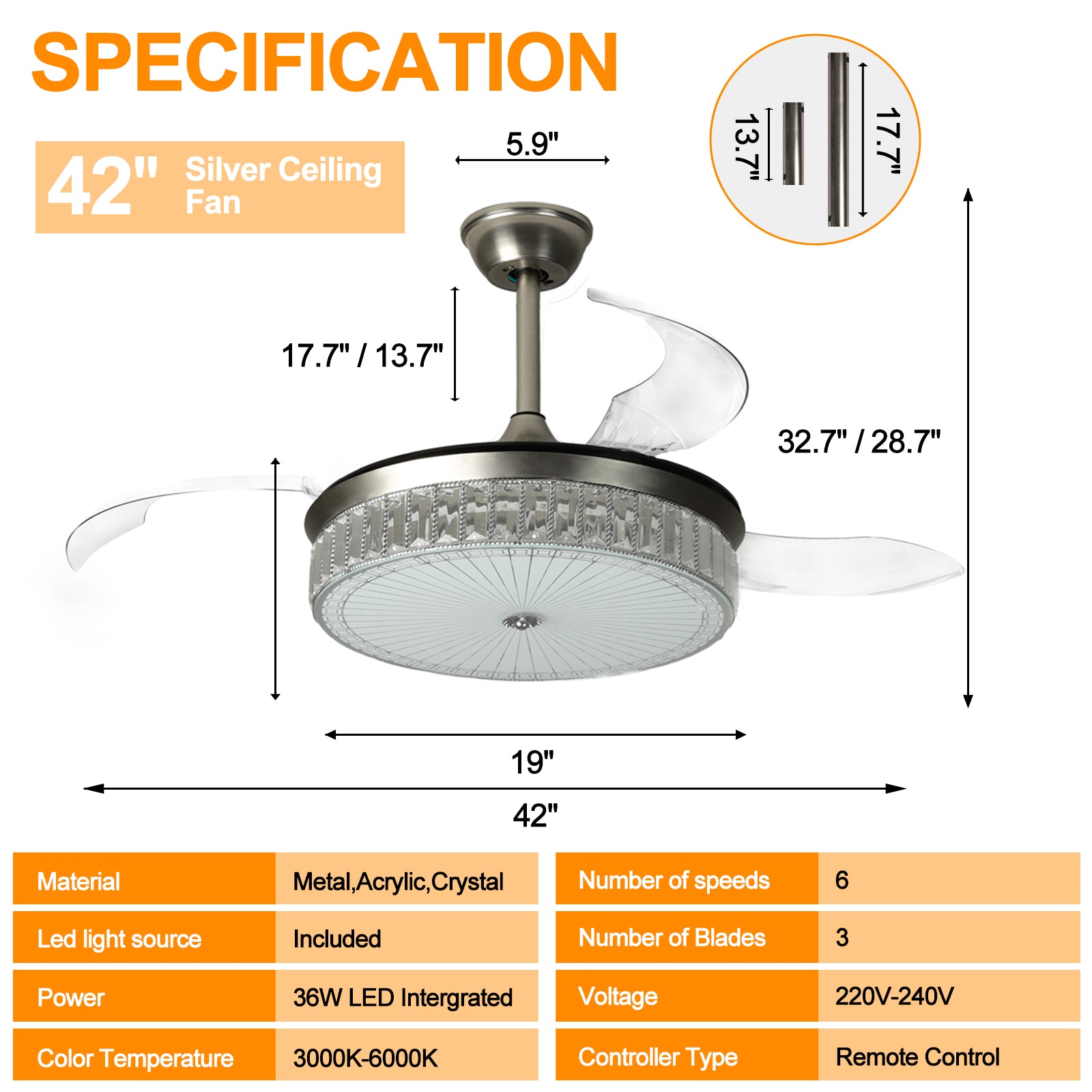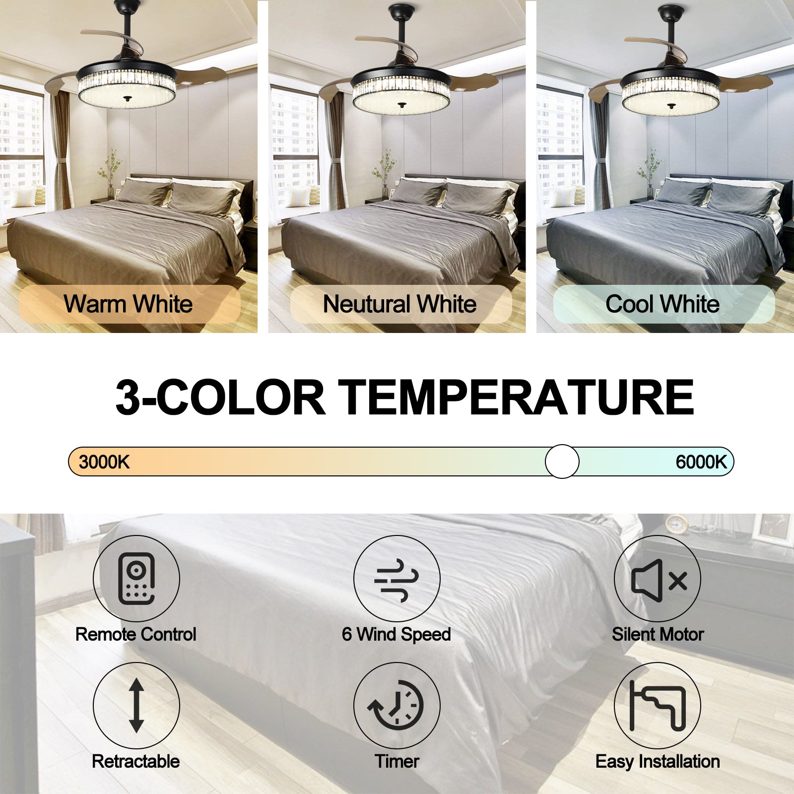 Depuley 42 tuuman kristallikatottotuulettimet ja valot makuuhuoneeseen, käännettävät tuulettimet sisäänvedettävällä 6 nopeudella ja kaukosäätimellä, hopea/taka, ennakkomyynti