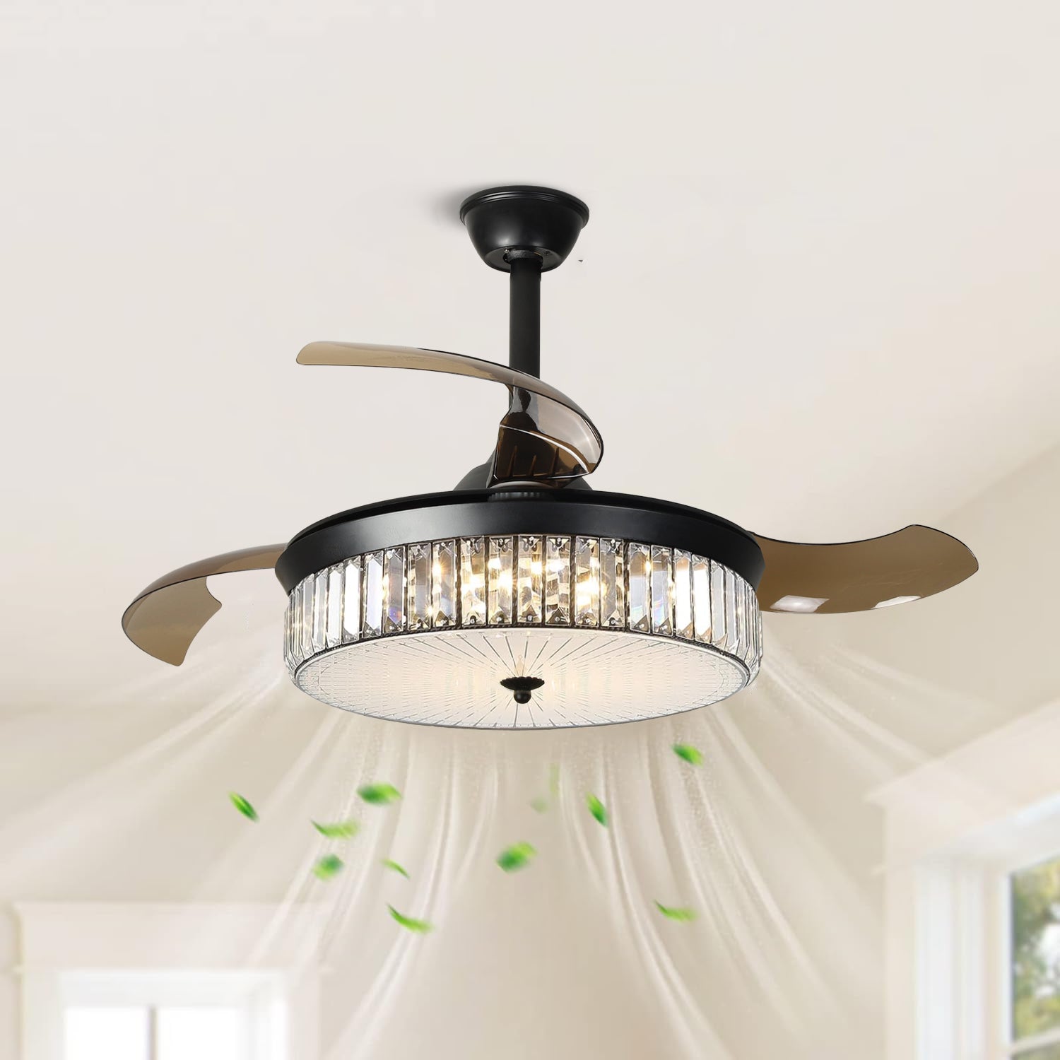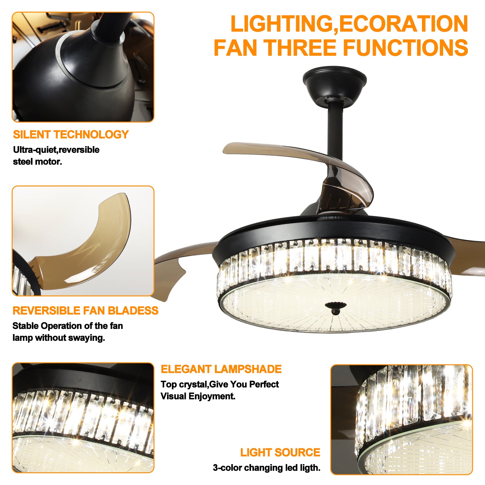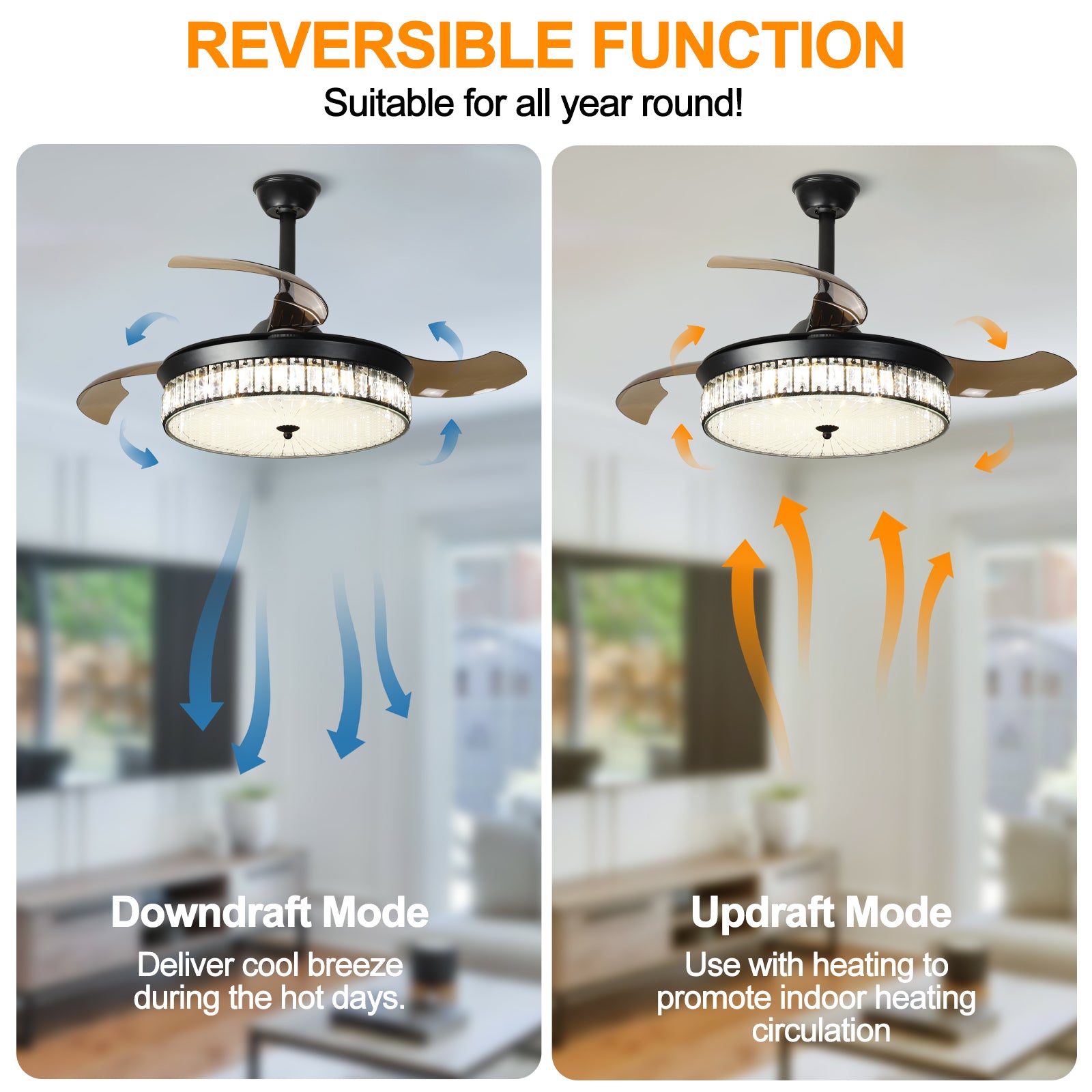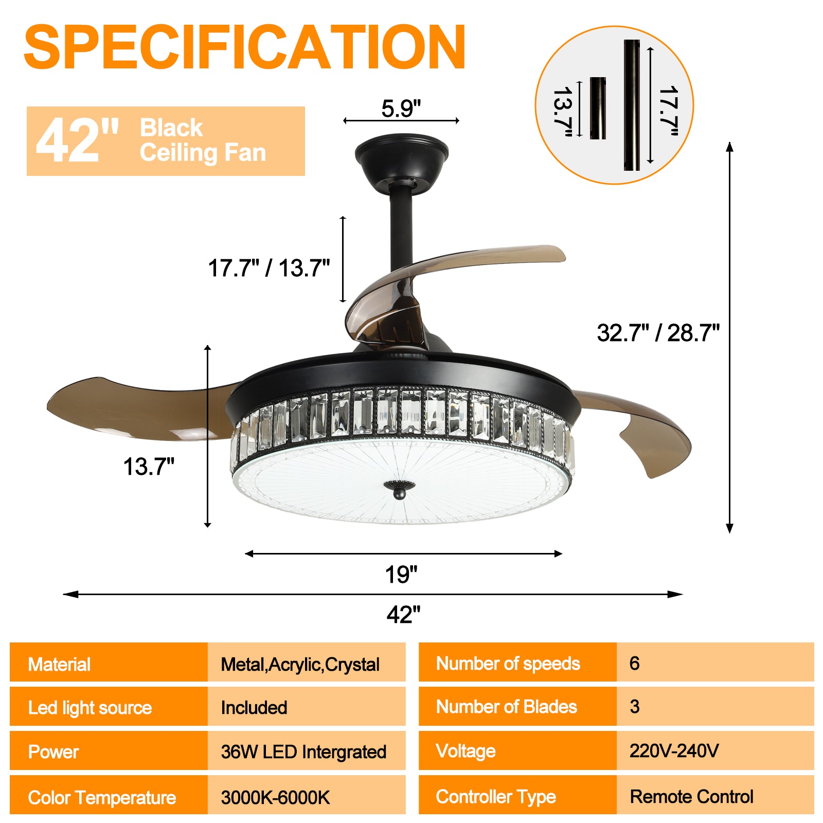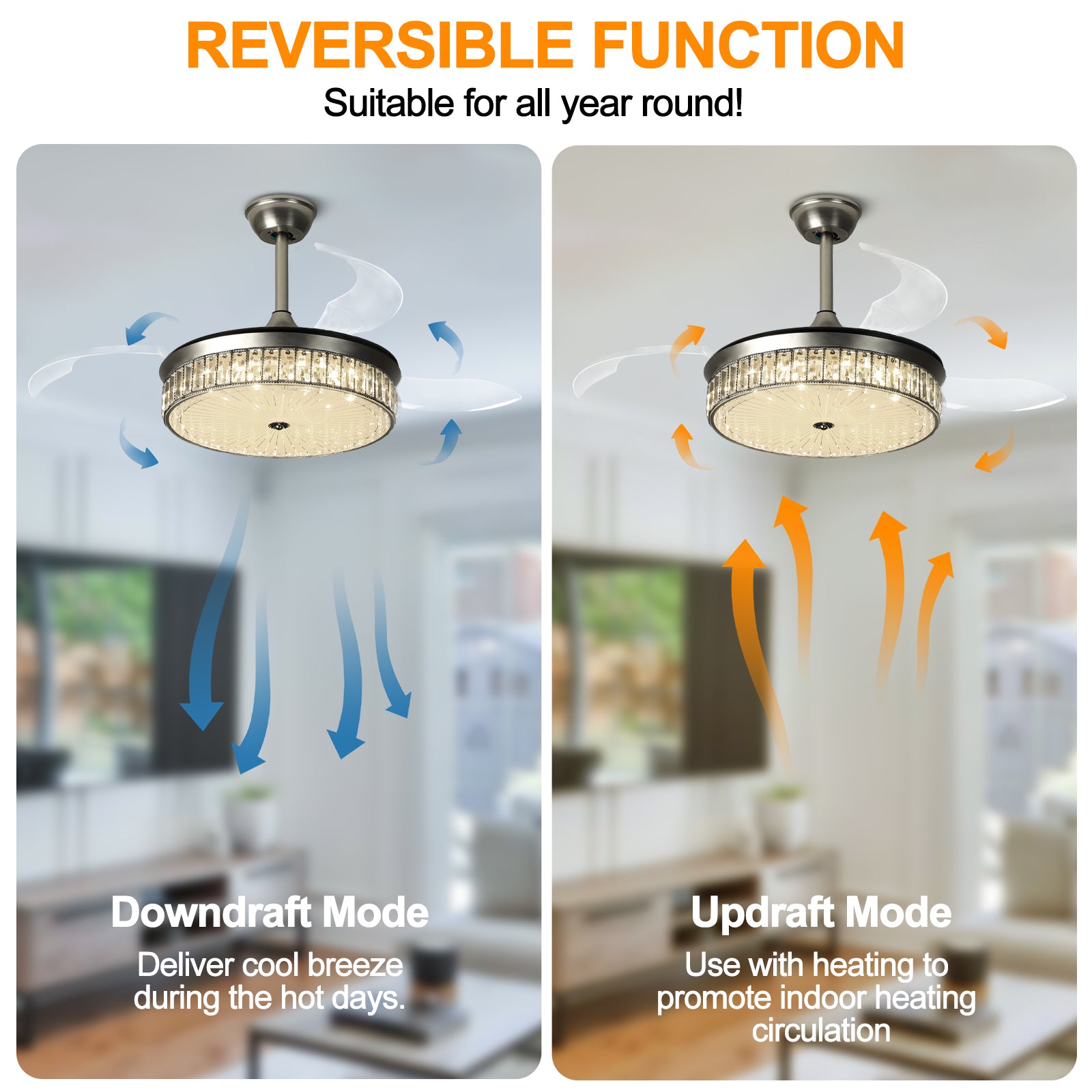 Depuley 42 tuuman kristallikatottotuulettimet ja valot makuuhuoneeseen, käännettävät tuulettimet sisäänvedettävällä 6 nopeudella ja kaukosäätimellä, hopea/taka, ennakkomyynti
