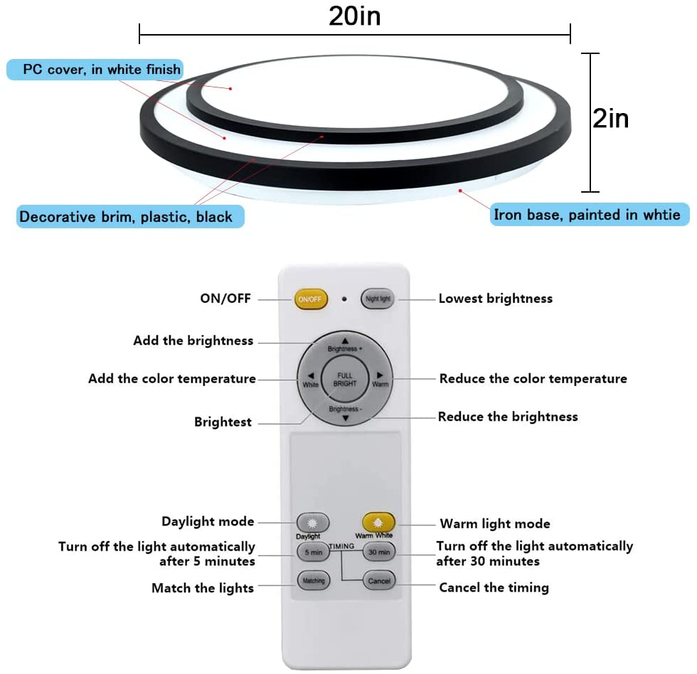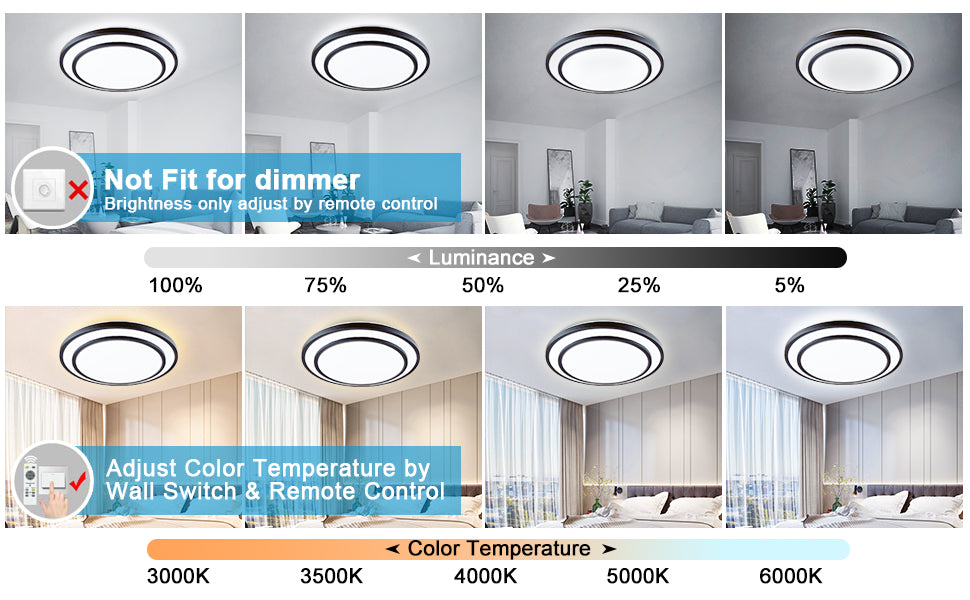 - ★【Himmennettävä ja väri vaihdettava】: Voit valita kolmesta erilaisesta valon värivaihtoehdosta - luonnonvalo, lämmin valo ja valkoinen valo, 3000K, 4000K tai 6000K. Valoa voidaan himmentää pimeästä kirkkaaseen kirkkauteen (5 % - 100 % himmennys) eri kohtausten vaatimusten mukaisesti. Nauti täydellisestä valosta kaikkiin tilaisuuksiin tällä monipuolisella ja energiatehokkaalla kattovalaisimilla.