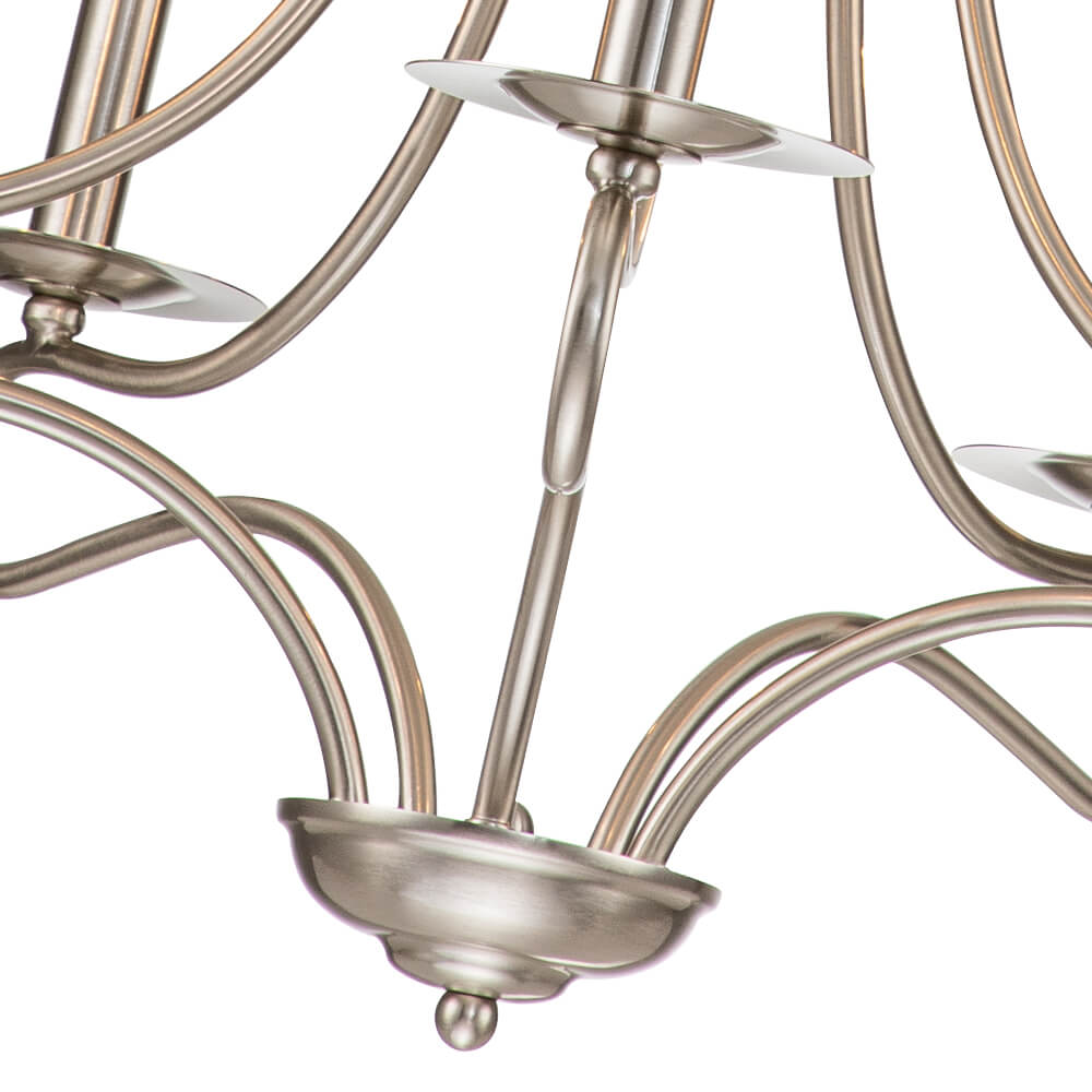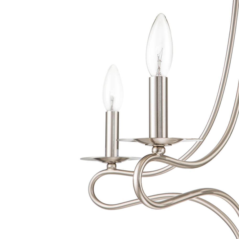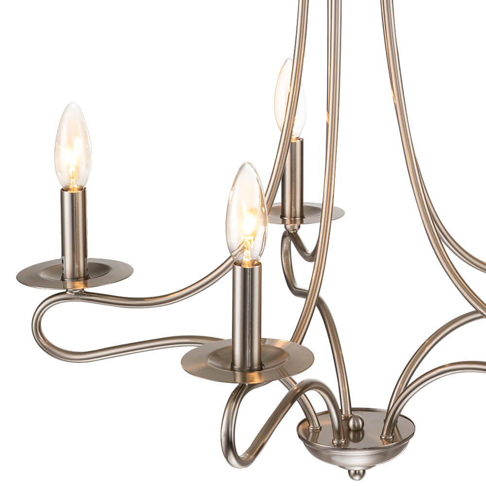 Viisi valoa • Empire-muotoilu • Kaareva tyyli • Satin Nickel -viimeistely • E12 kynttelikköpolttimot (ei sisälly) • Langallinen • UL-listattu