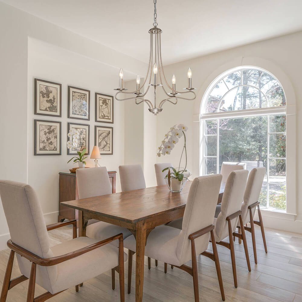 Tässä 5-kevytmetallisessa kattokruunussa on paranneltu kynttilätyylinen empire-runko, joka on viimeistelty kiillotetulla satiininikkelillä, joka luo modernin huippuluokan kosketuksen. Sirot kaarevat käsivarret, joissa on viisi E12 kynttelikköpolttimoa (eivät sisälly pakkaukseen), luovat klassisen vintage- ja ranskalaisen maaseudun tunnelman tälle imperiumin kattokruunulle. Tuo ajatonta maalaistalon eleganssia ruokasaliin, olohuoneeseen, eteiseen tai makuuhuoneeseen tällä 5 valon harjatulla nikkelikynttilätyylisellä kattokruunulla.Tiedot
