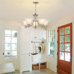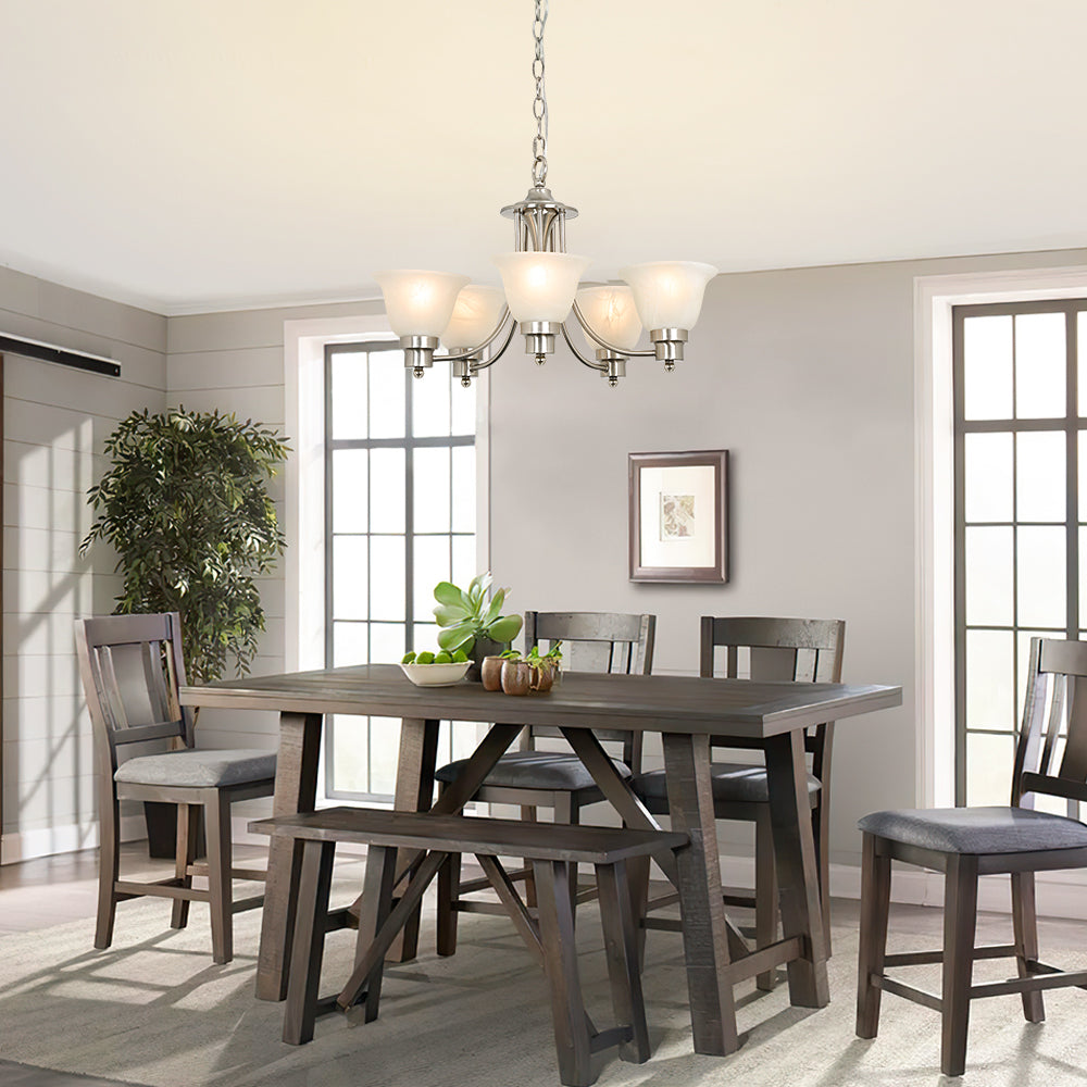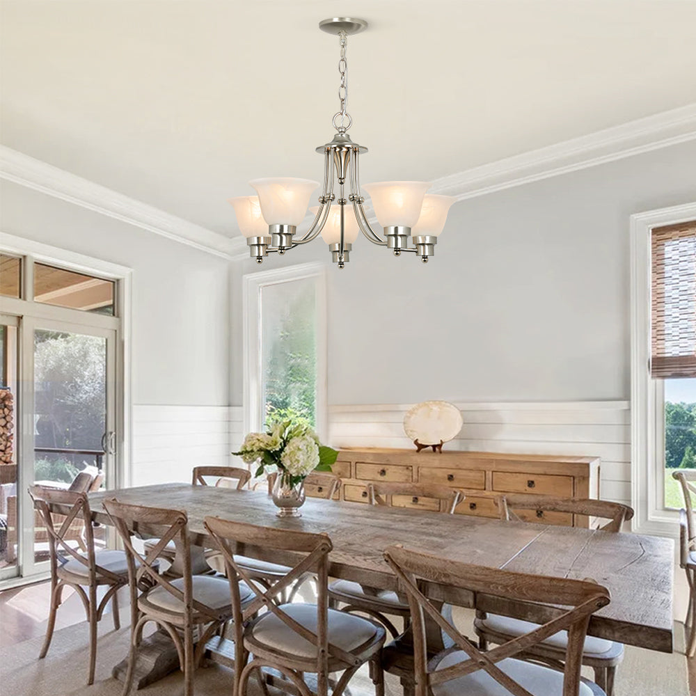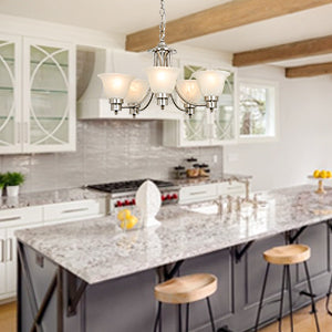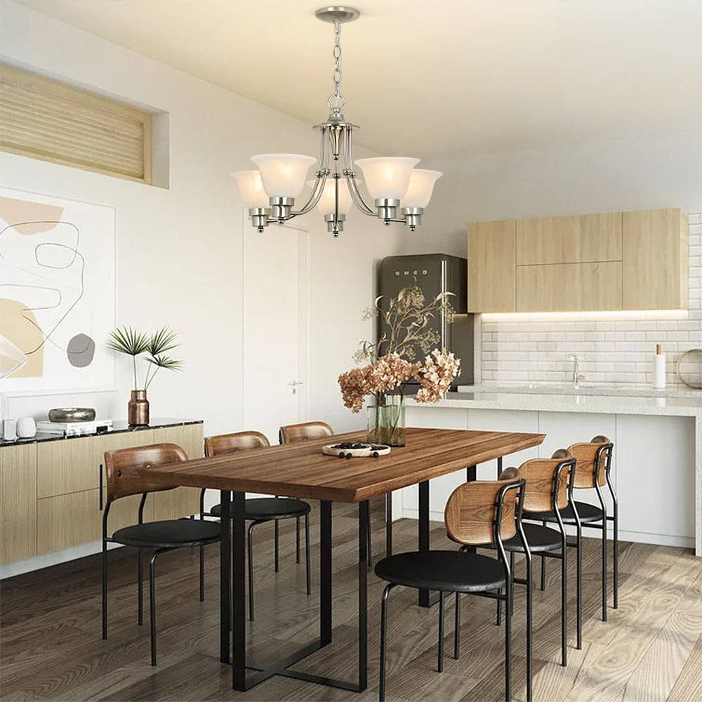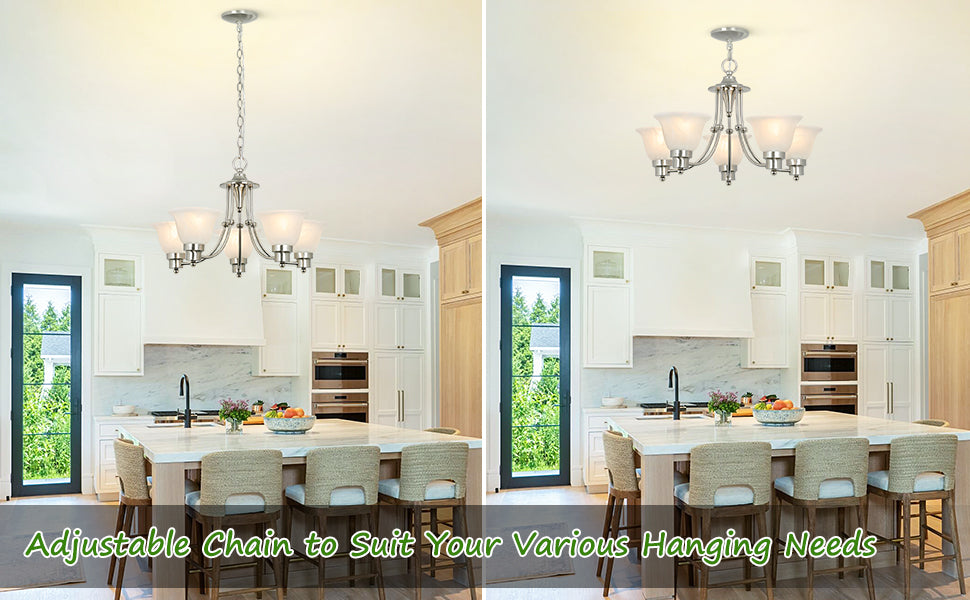 Depuley 5-Light modernit kattokruunuvalaisimet, 21" nykyaikainen kattokruunu harjattu nikkeli lasivarjostimella, säädettävä kattoon riippuva riippuvalaistus ruokasaliin