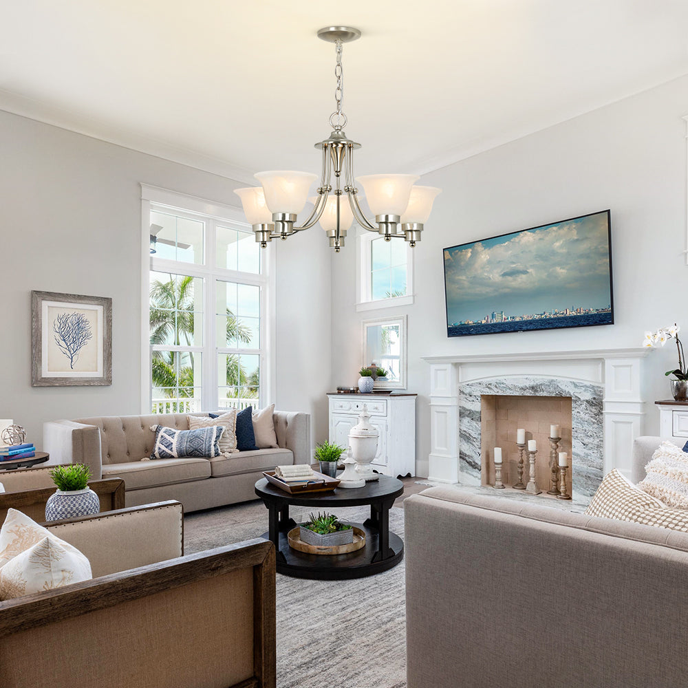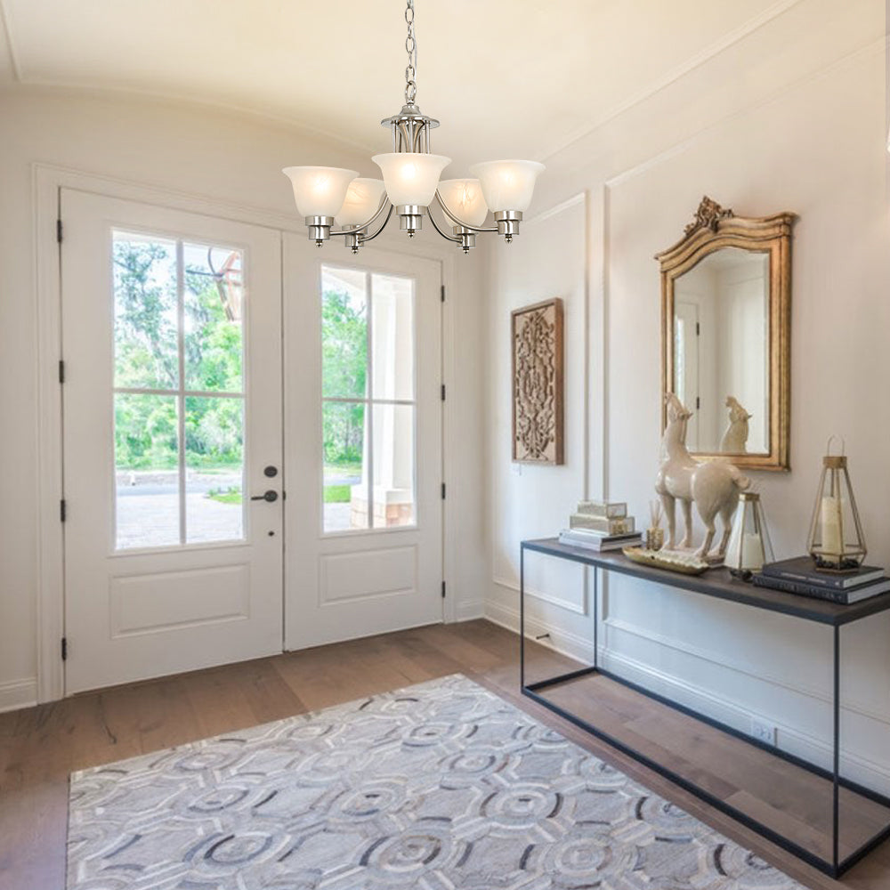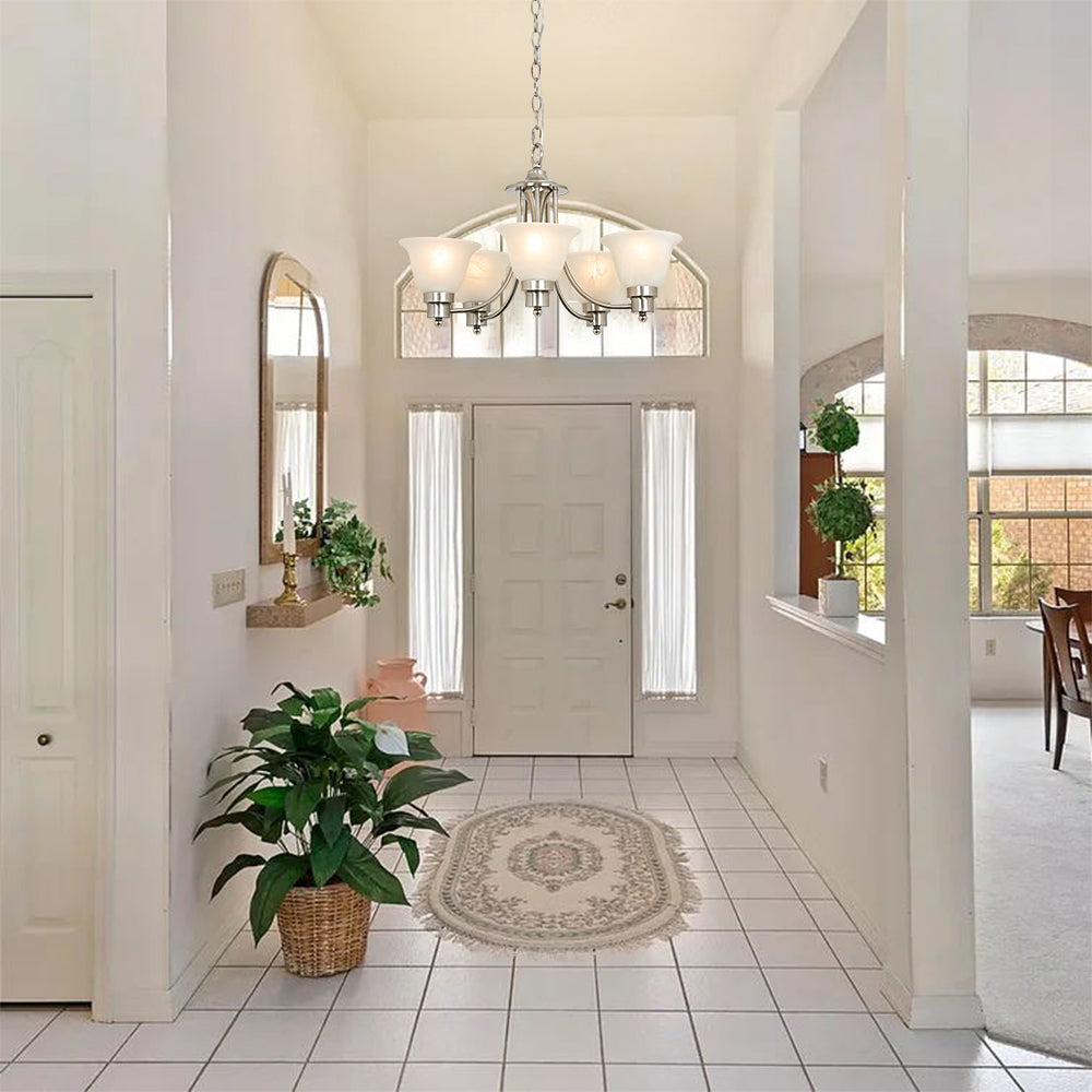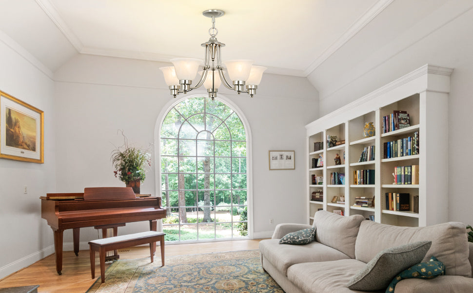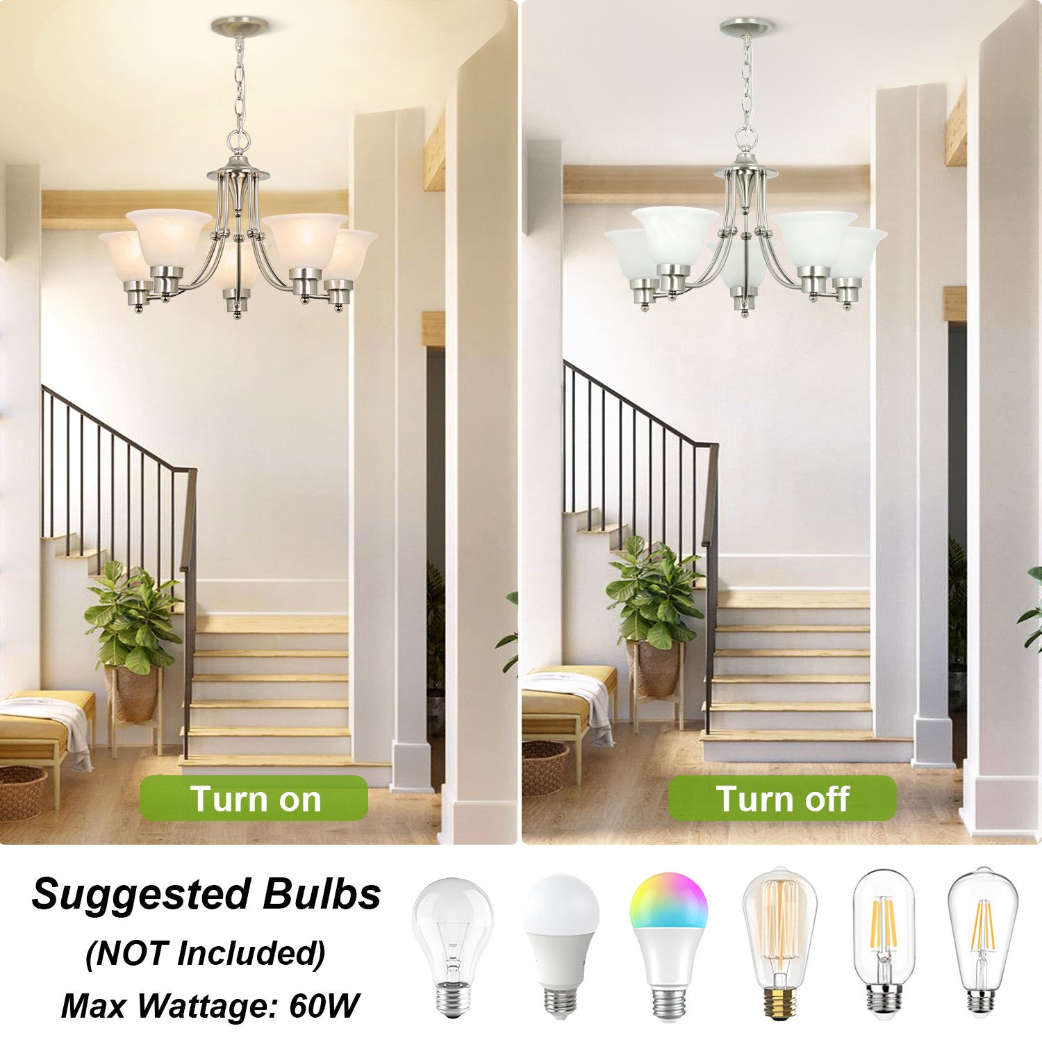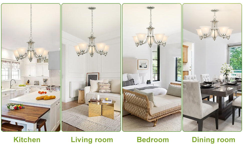 - Lampun vaatimukset ja helppo asennus: Käytä viittä keskikokoista E26-lamppua (60 W maksimi). Täysin himmennettävissä käytettäessä himmennettävällä polttimolla ja yhteensopivalla himmenninkytkimellä. Kaikki laitteistot ja ohjeet sisältyvät hintaan helppoa ja nopeaa asennusta varten.
