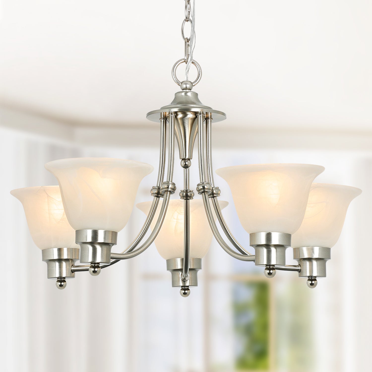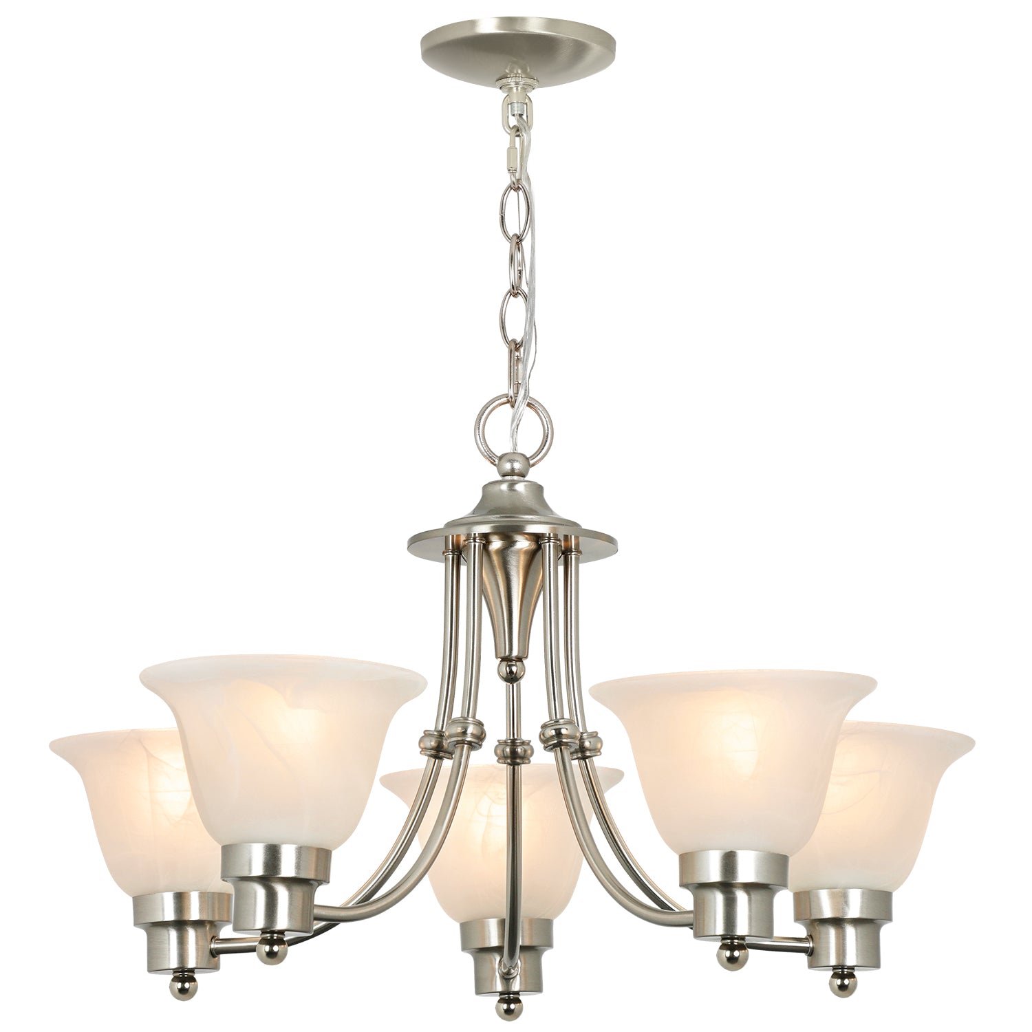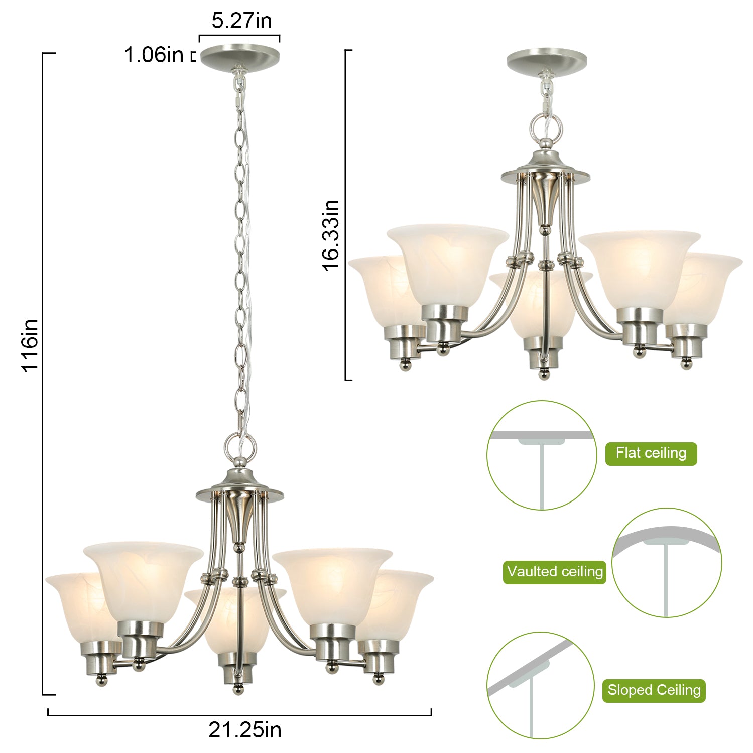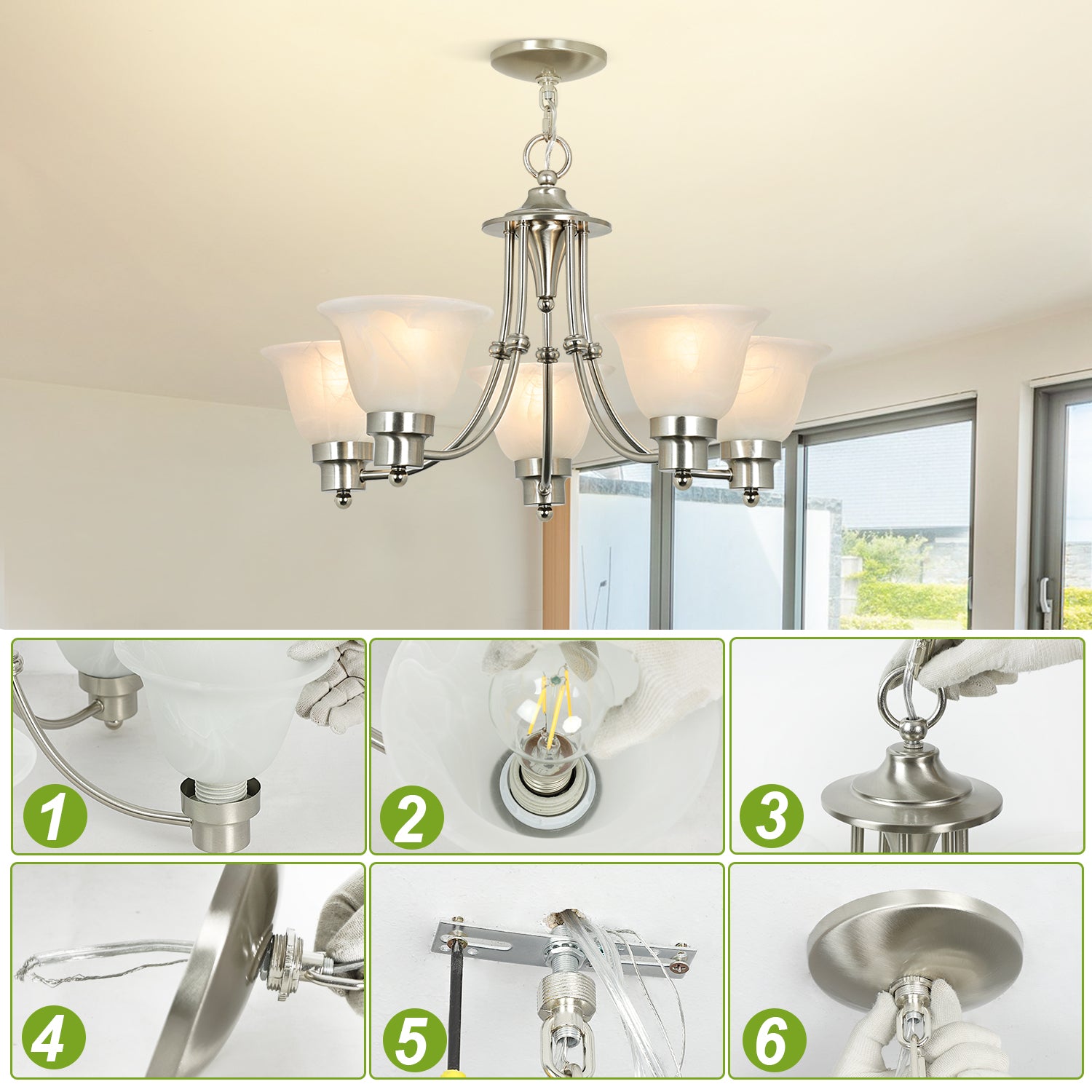 - Lampun vaatimukset ja helppo asennus: Käytä viittä keskikokoista E26-lamppua (60 W maksimi). Täysin himmennettävissä käytettäessä himmennettävällä polttimolla ja yhteensopivalla himmenninkytkimellä. Kaikki laitteistot ja ohjeet sisältyvät hintaan helppoa ja nopeaa asennusta varten.