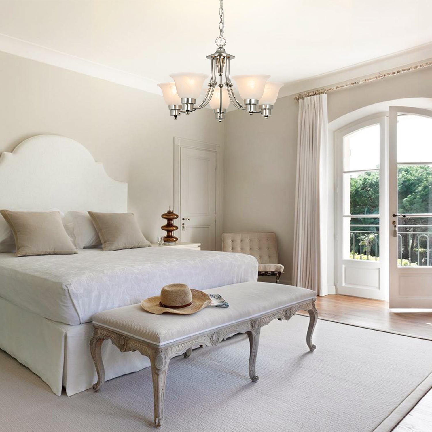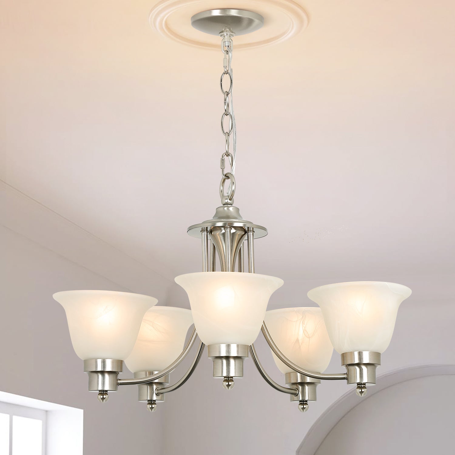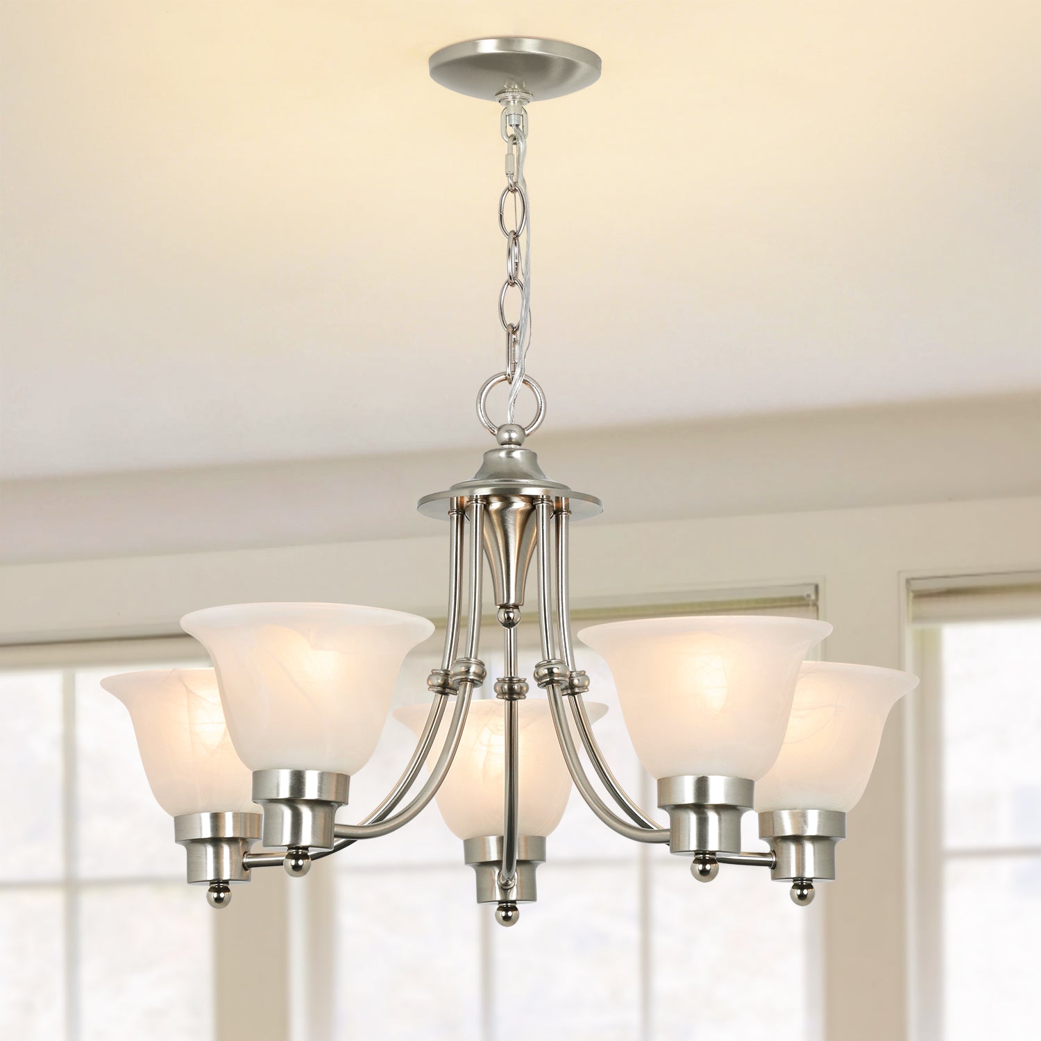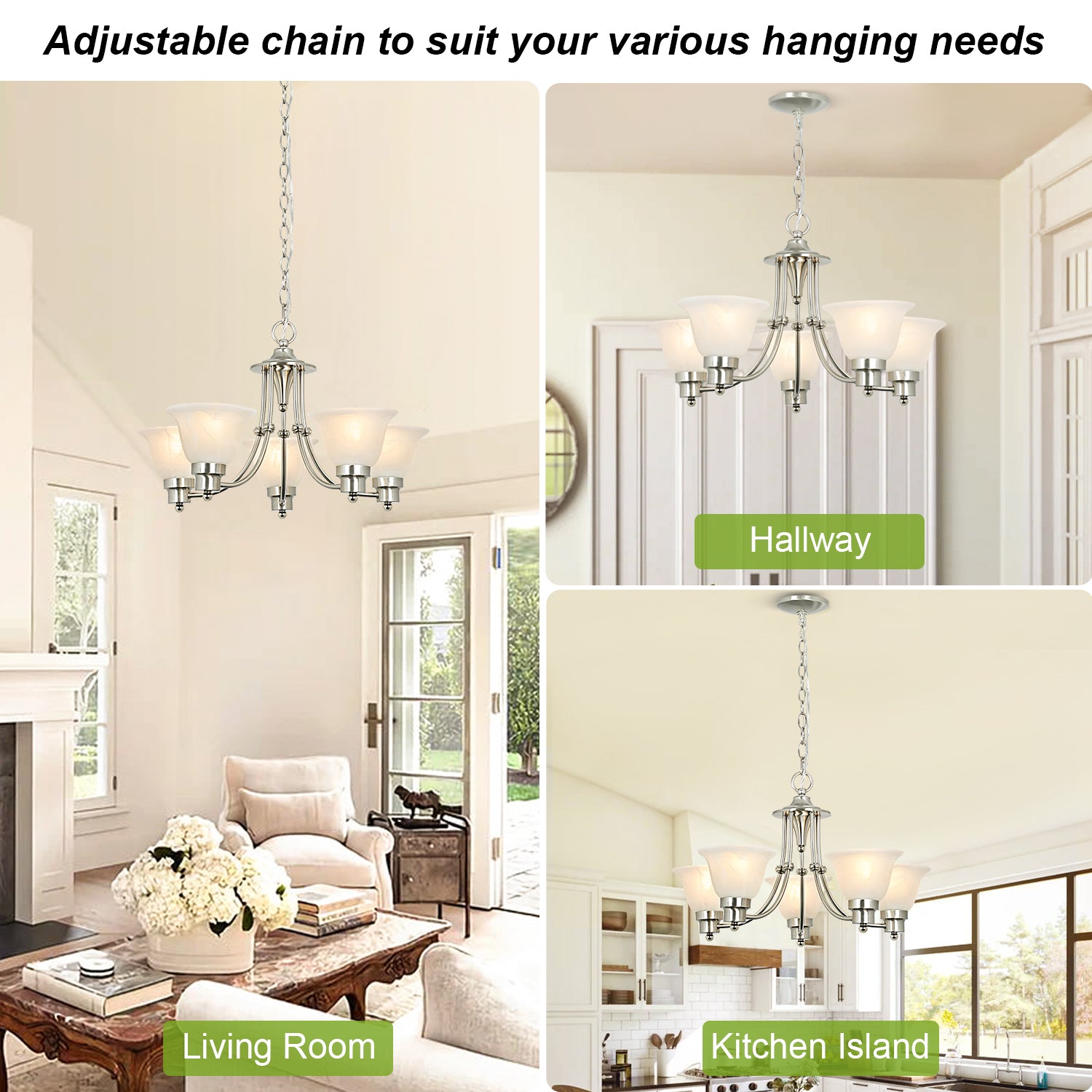 - Lampun vaatimukset ja helppo asennus: Käytä viittä keskikokoista E26-lamppua (60 W maksimi). Täysin himmennettävissä käytettäessä himmennettävällä polttimolla ja yhteensopivalla himmenninkytkimellä. Kaikki laitteistot ja ohjeet sisältyvät hintaan helppoa ja nopeaa asennusta varten.