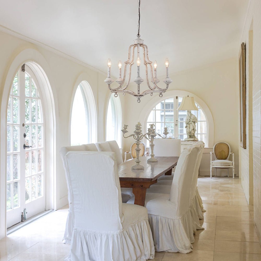 Tässä viiden valon vintage-kruunussa on klassinen kynttilätyylinen siluetti, joka on viimeistelty ahdistuneen valkoisena ja luo ranskalaisen maalaismaisen tunnelman. Sirot kaaret ja sirot kädet rakentavat tämän nuhjuisen tyylikkään kattokruunun herkän ja elegantin kehyksen. Viisi E12 kynttelikköpolttimoa (ei sisälly toimitukseen) täydentävät perinteistä ilmettä. Tämä 5 valon nuhjuinen tyylikäs kynttilätyylinen kattokruunu antaa historiallisen lumoavan vaikutelman, joka sopii täydellisesti ruokasaliin, keittiösaarekkeeseen, olohuoneeseen, makuuhuoneeseen, eteiseen tai sisäänkäyntiin.Tiedot