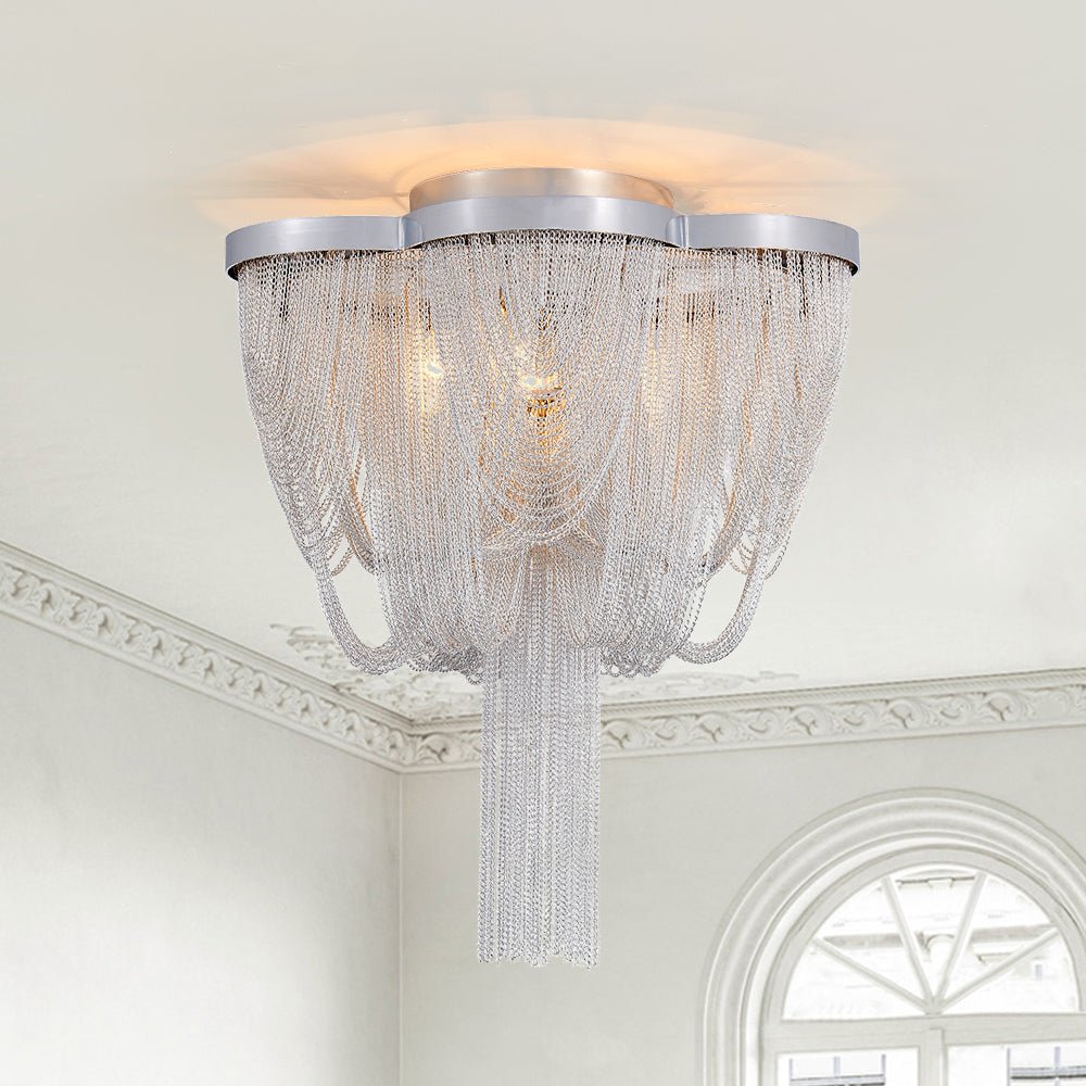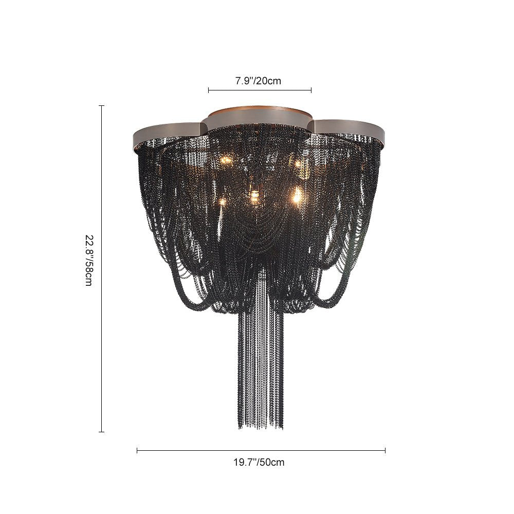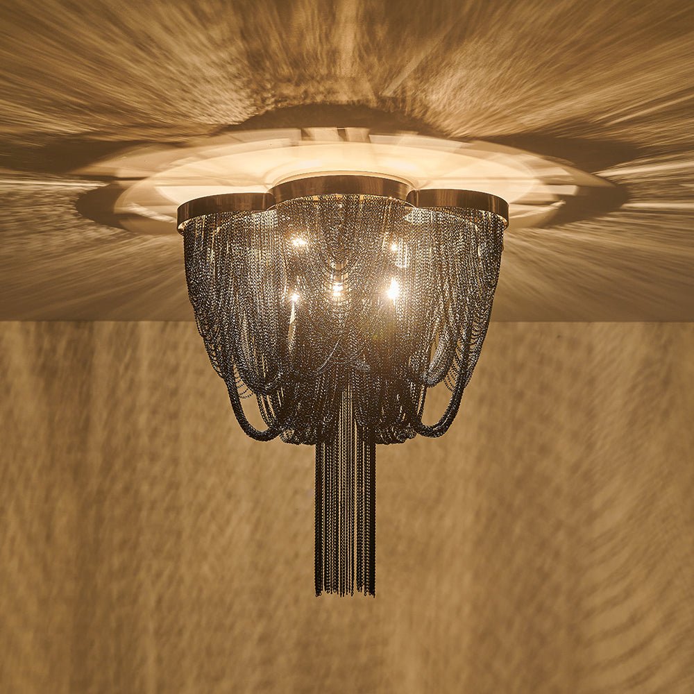 Klassista empire-muotoilua ja eleganttia tupsujen kauneutta yhdistävässä 5-lampuisessa uppoasennetussa kattovalaisimessa on kerroksia drapedoituja ketjuja, jotka luovat siroisen porrastetun verhoilmeen. Tämä tupsuketjun upotusvalaisin esittelee siroa kukkasiluettia, joka on täynnä tasaista geometrista kauneutta, yllättäen kuka sen kohtaa. Kun tämä empire-kattovalaisin sytytetään, se luo upeita aaltoilevia valoefektejä, jotka ovat täydellinen lisäämään ripauksen ylellisyyttä mihin tahansa eteiseen, makuuhuoneeseen, olohuoneeseen tai ruokailutilaan.Tiedot