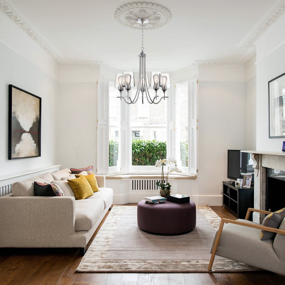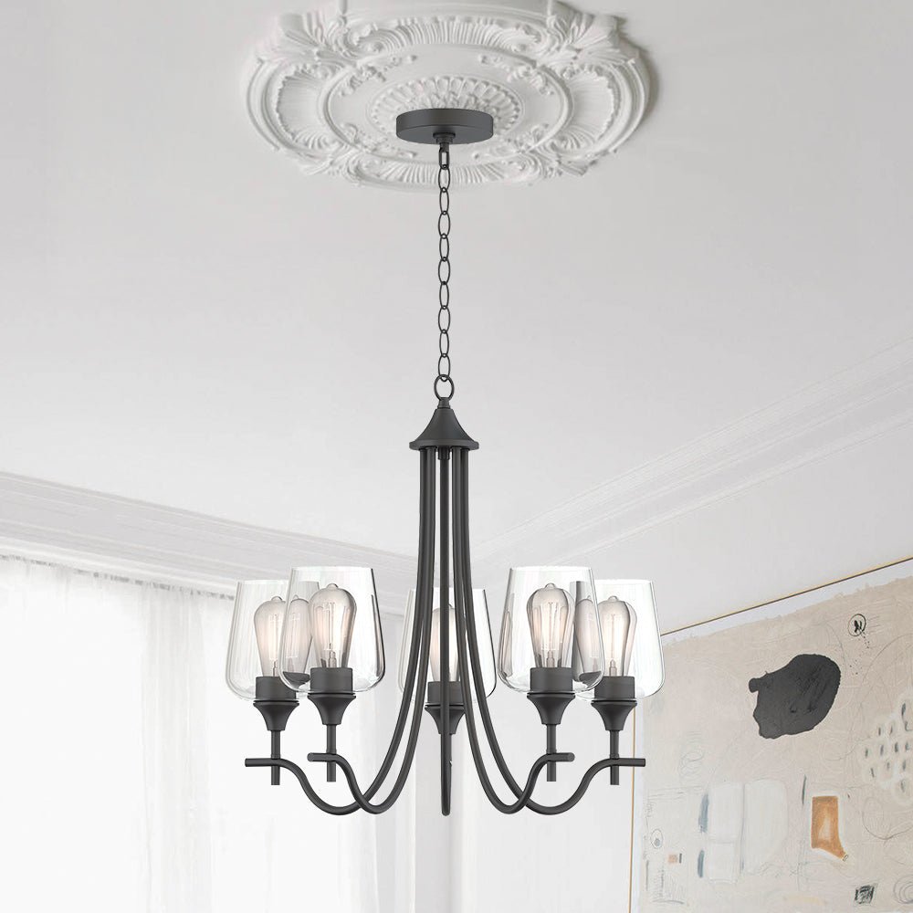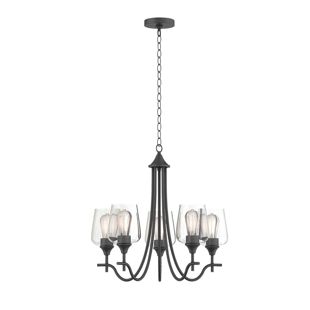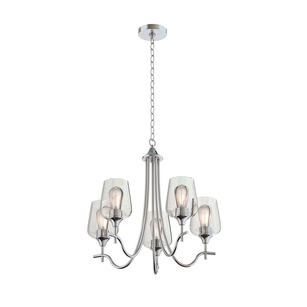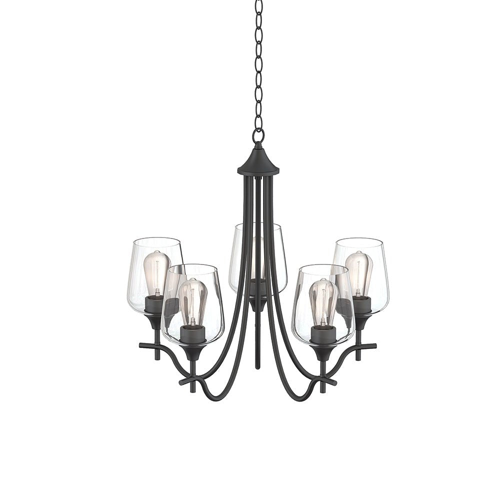 Viisi valoa • Kirkkaat lasivarjostimet • Empire-muotoilu • Kaarevat varret • Musta/nikkelipinta • E26 keskikokoiset polttimot (ei sisälly) • Kiinteä • UL-listattu