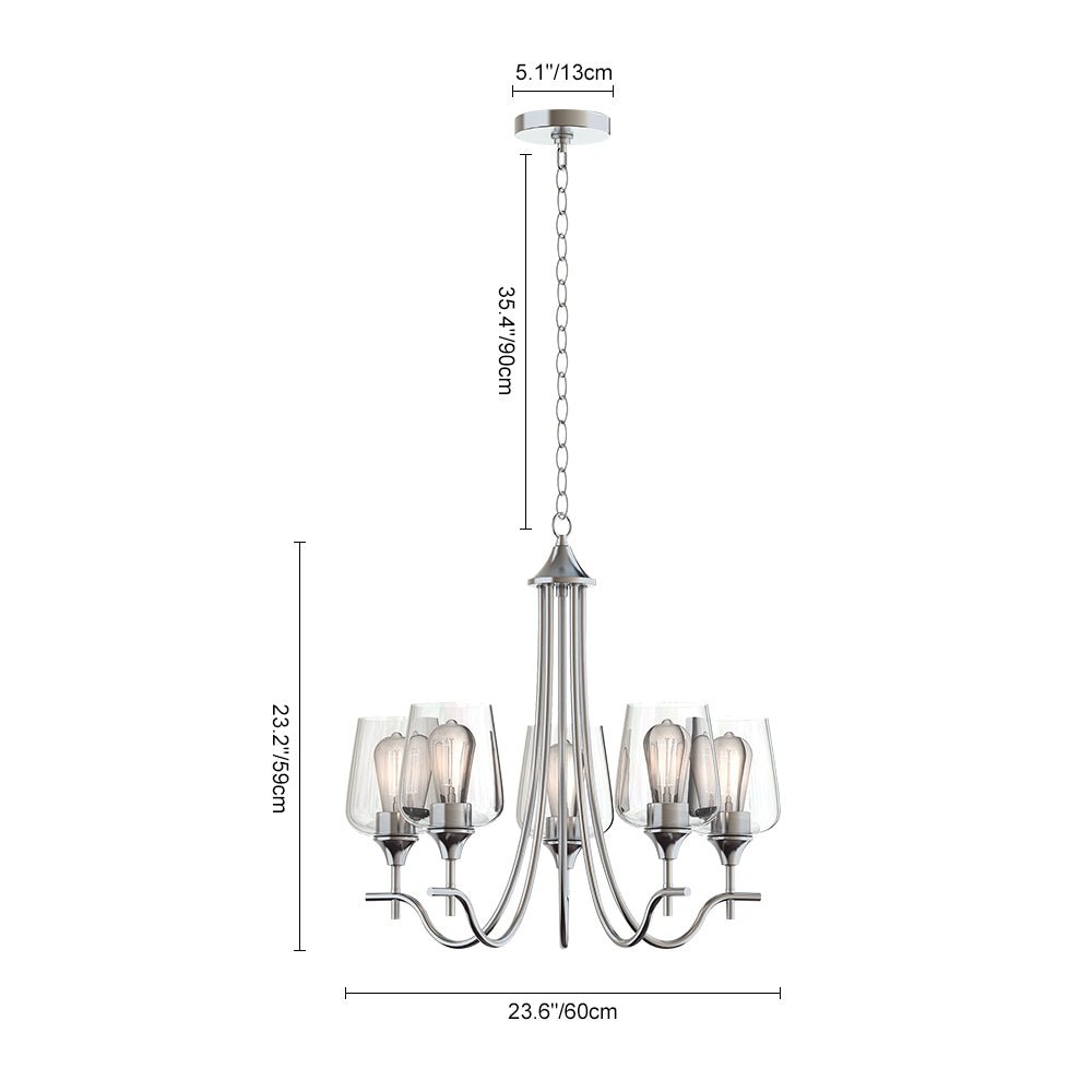 Hieno ja hienovaraisesti muotoiltu, tämä viiden valon empire-kattokruunu on hienostuneen ylellisyyden ruumiillistuma. Tässä kattokruunussa on viisi metallista kaarevaa vartta, jotka venyvät ylöspäin tukemaan viittä kirkkaasta lasista valmistettua viinilasin muotoista sävyä luoden kynttilänmuotoisen siluetin. Tämä kattokruunu yhdistettynä tyylikkääseen mustaan ja nikkelipintaan luo kiehtovan tunnelman eteiseen, makuuhuoneeseen, ruokailuhuoneeseen, olohuoneeseen tai keittiösaarekeympäristöön.Tiedot