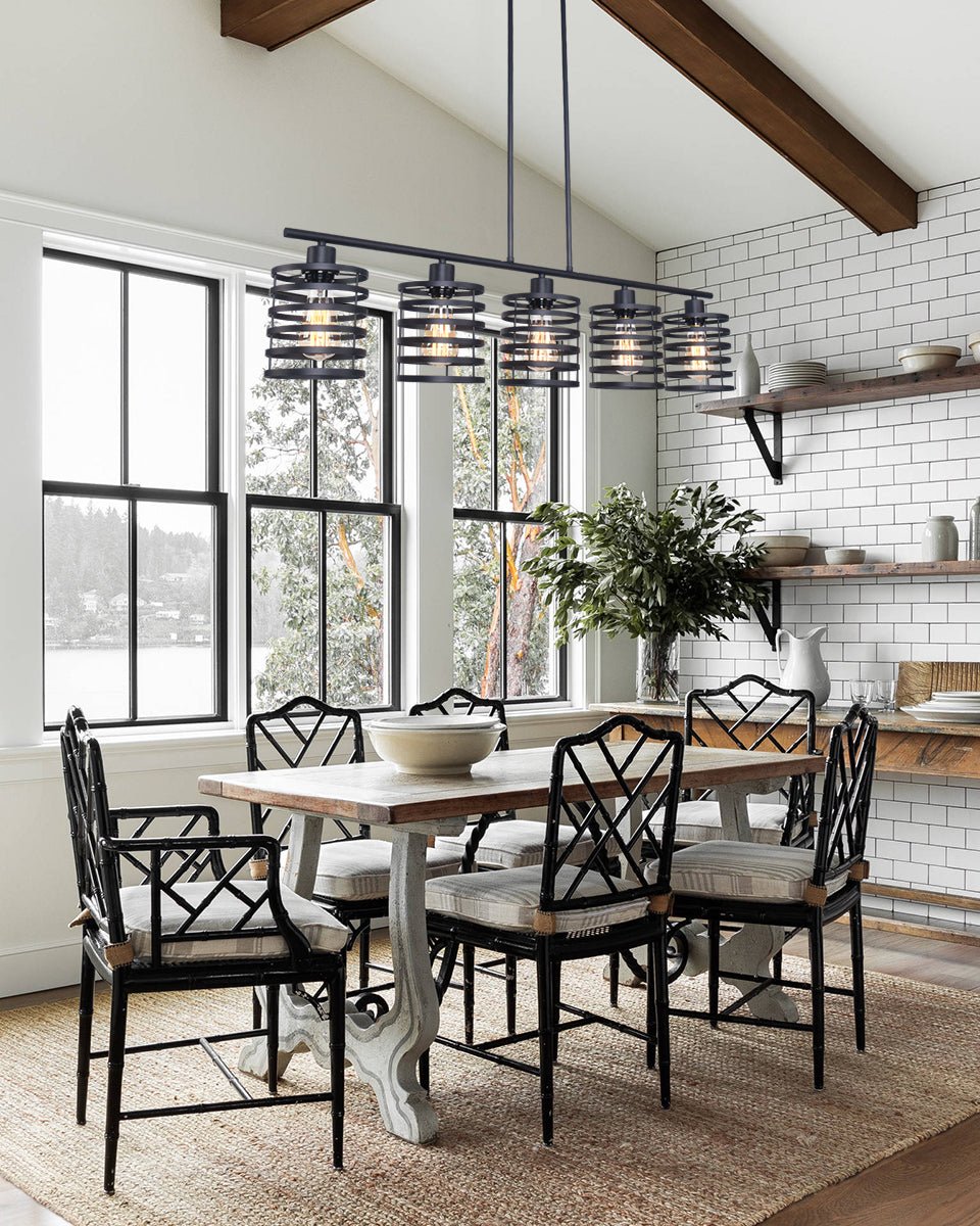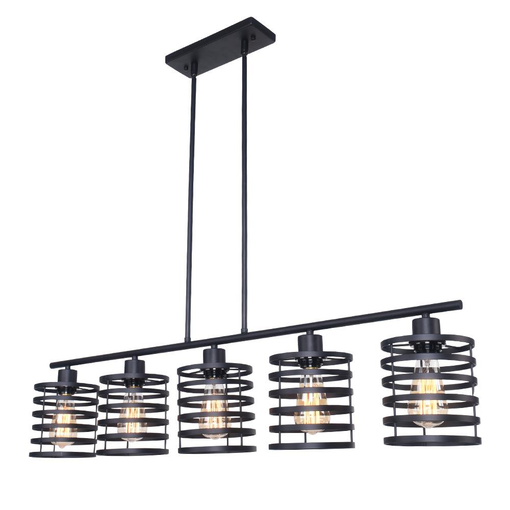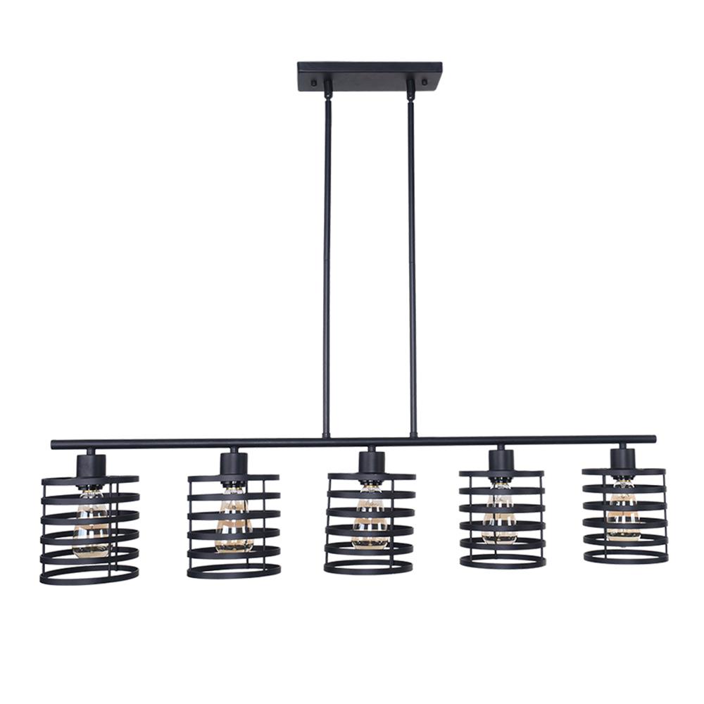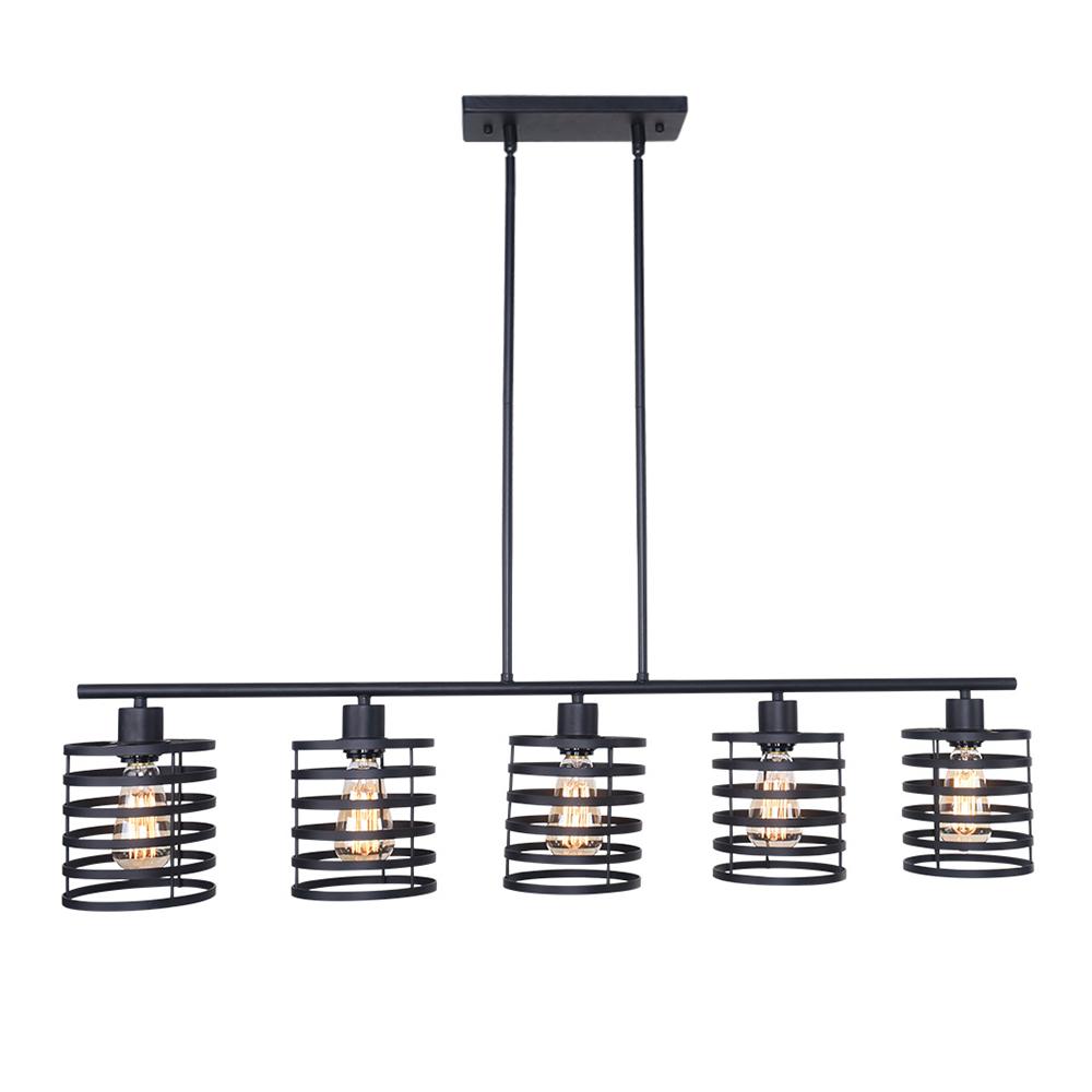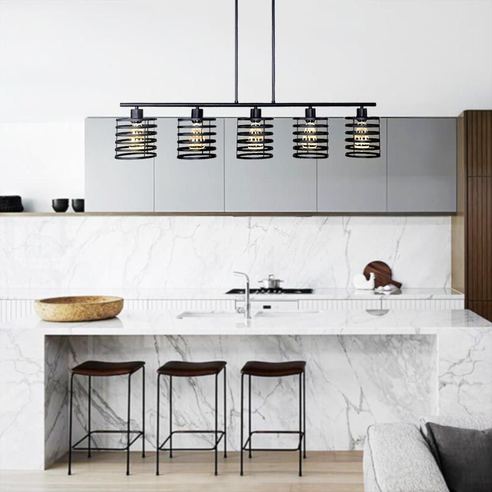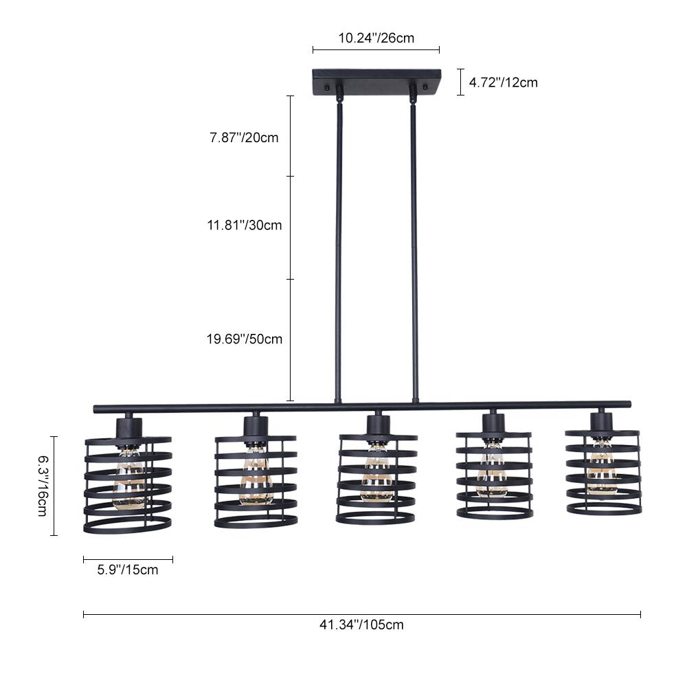 Tyylikäs linja ja avohäkit riippuvat riipukset muodostavat tämän maalaistalon keittiösaarekevalaistuksen. Tämä mustaan viimeistelyssä pukeutunut keittiösaarekeriippuvalaisin sisältää vaakasuoran tukitangon, jonka alapuolella on viisi kelamaista sylinterivarjostusta. Yhteensopiva E26/E27 keskikantaisten polttimoiden kanssa (ei sisälly toimitukseen), tämä 5 valon keittiösaarekeriipus lähettää suodattavaa valoa avoimien verhojen läpi. Ripusta tämä keittiösaarekkeen lineaarinen riippuvalaisin keittiösaarekkeen, pitkän ruokapöydän tai kotibaarin päälle nauttiaksesi kutsuvasta hehkusta perheesi ja ystäviesi kanssa.Detail