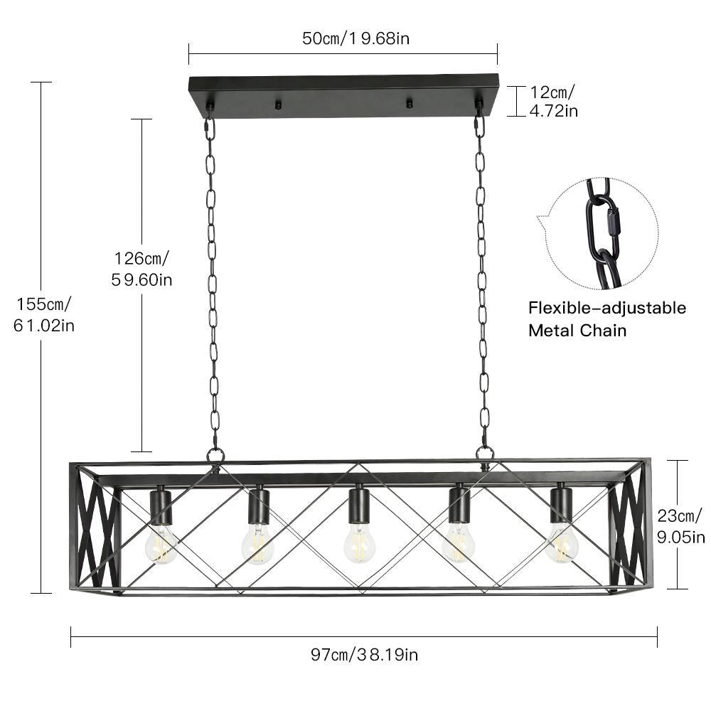 - Korkeussäädettävä: Valaisimen halkaisija on 38 tuumaa x korkeus 61 tuumaa. Siinä on 51 tuuman säädettävä ketju, joten voit mukauttaa sopivan pituuden erilaisiin valaistustarpeisiin ja erilaisiin valaistustilanteisiin.