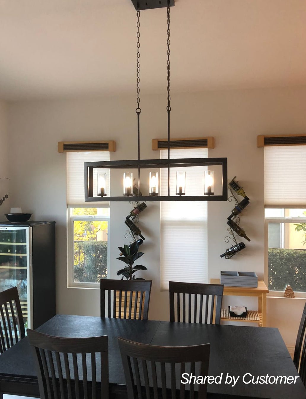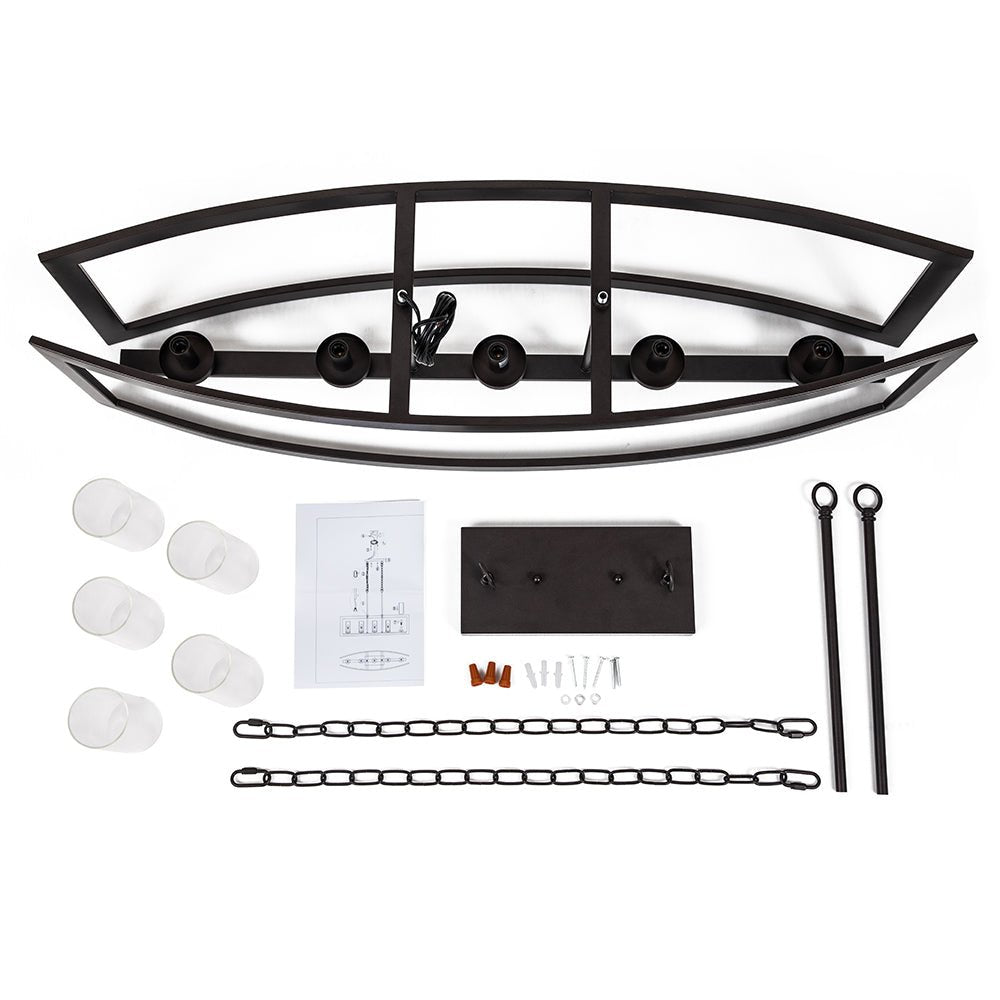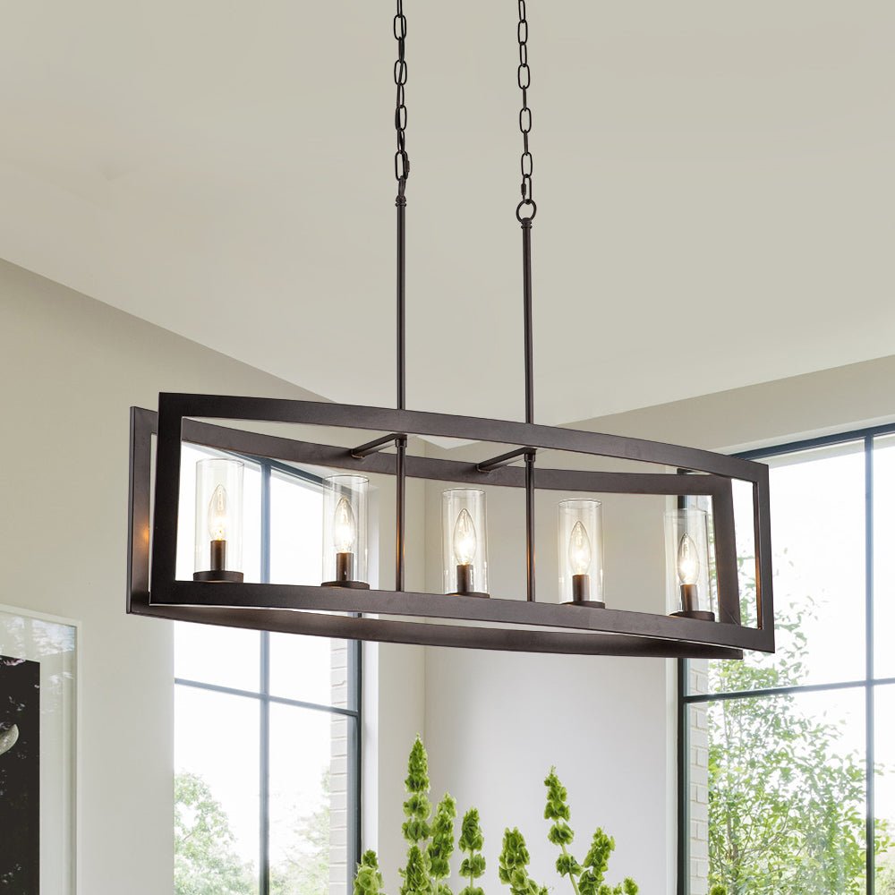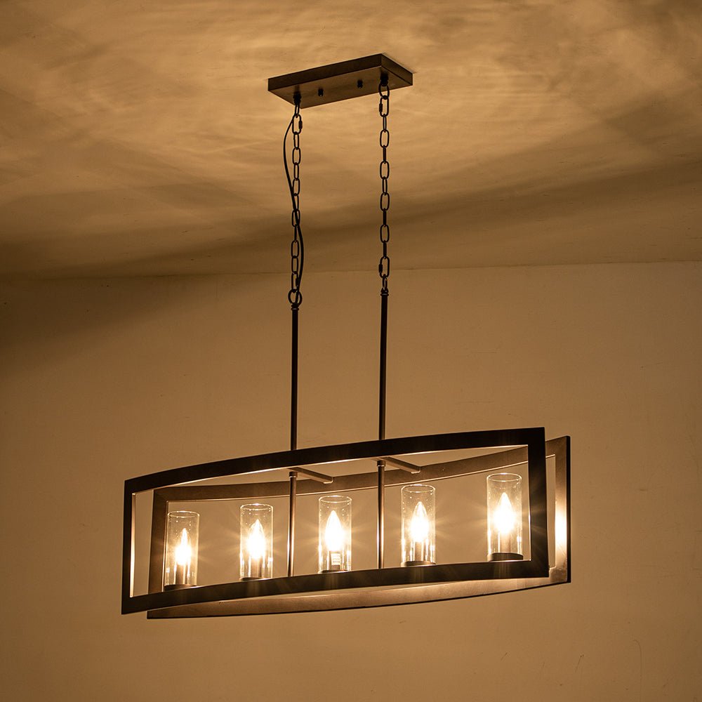 Tämä 5 valon keittiösaarekeriippuvalaisin tarjoaa kutsuvan maalaistalo-ilmeen teollisilla aksenteilla. Kaksi hieman kaarevaa suorakaiteen muotoista metallirunkoa rakentavat taidokkaasti yksinkertaisen venemäisen muodon tästä lineaarisesta saarikruunusta. Öljyhierretty pronssi/puusyistä viimeistely ja viisi sylinterin kirkasta lasivarjostetta täydentävät tätä suorakaiteen muotoista metallista kattokruunua ja antavat hienostuneen vintage-asenteen. Suosittelemme ripustamaan tämän 5-kevyisen teollisuusmetallirunkoisen saarekekruunun valaisemaan keittiösaareketta, ruokailutilaa tai olohuonettasi.Tiedot