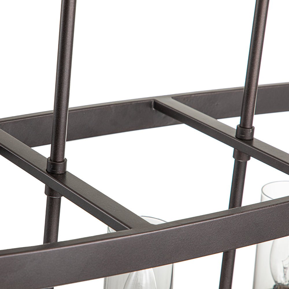 Viisi valoa • Avoin runko • Kirkkaat lasiverhot • Keittiösaarekeriipus • Öljyhierretty pronssi/puusyinen viimeistely • E12 kynttelikköpolttimot (ei sisälly) • Kiinteä • UL-listattu