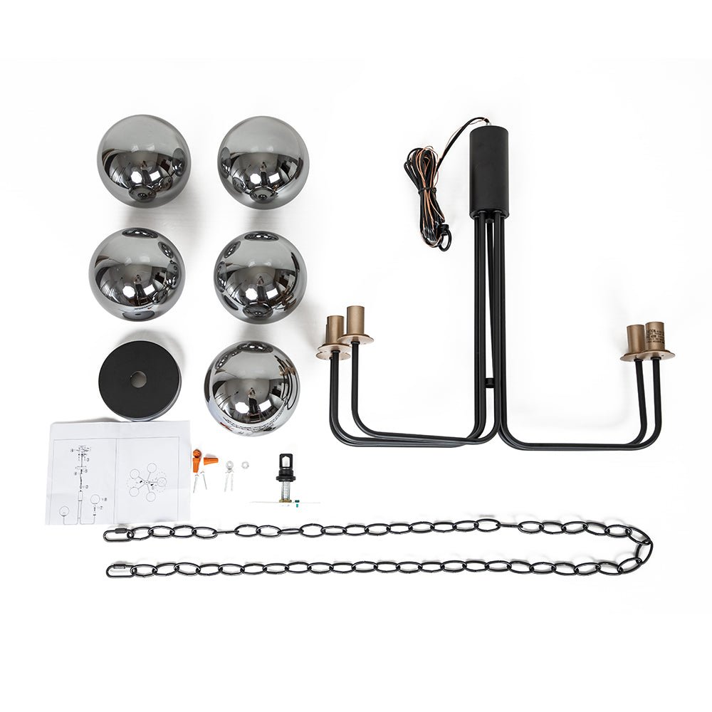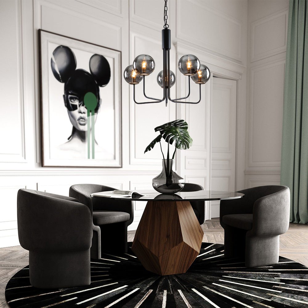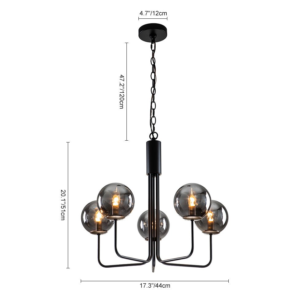 Tämä 5 valon pyöreä kattokruunu esittelee rohkean käänteen klassiseen ilmavaan kupla-sputnik-designiin. Sen ylellisen komea ulkonäkö on salaperäinen. Tässä mustasta viimeistellystä metallista valmistetussa tyylikkäässä sputnik-kruunussa on viisi kulmikasta vartta, jotka pitävät viittä savulasipalloa ylöspäin. Yhteensopiva viiden E12 kynttelikön polttimolla (ei sisälly toimitukseen), tämä savulasista maapallon kattokruunu hajoittaa pehmeästi ympäristön hehkua ja parantaa ruokasalin, olohuoneen, eteisen tai makuuhuoneen tunnelmaa.Tiedot