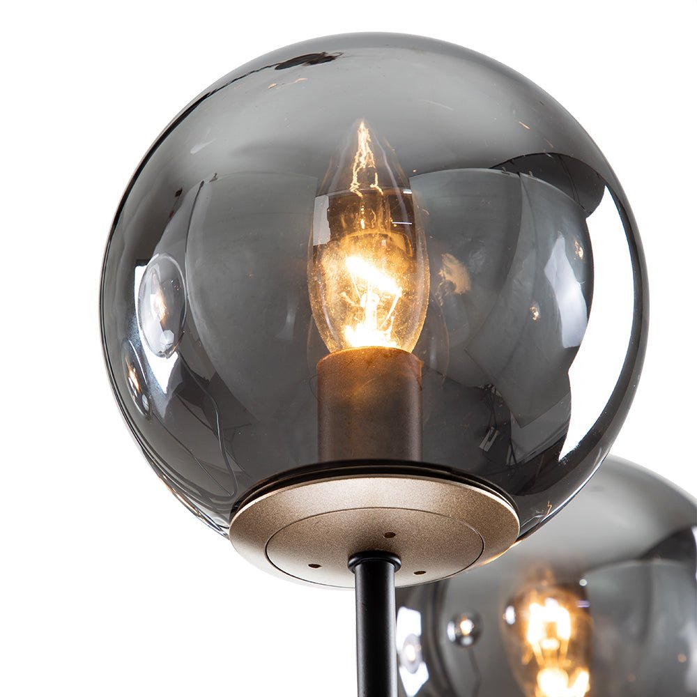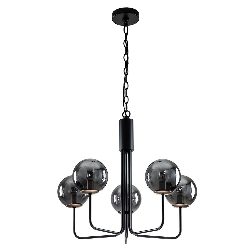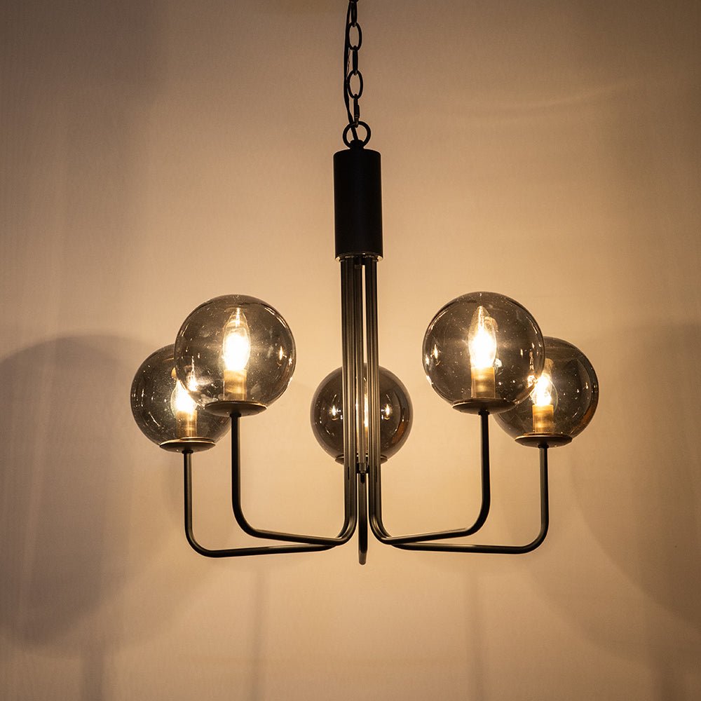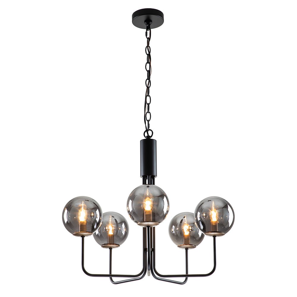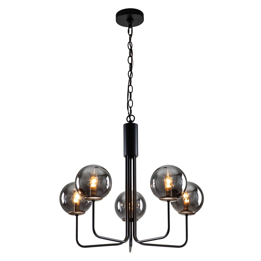 Viisi valoa • Savustettu lasi • Maapallovarjostimet • Kaarevat varret • Musta viimeistely • E12 kynttelikköpolttimot (ei sisälly) • Kiinteä • UL-listattu