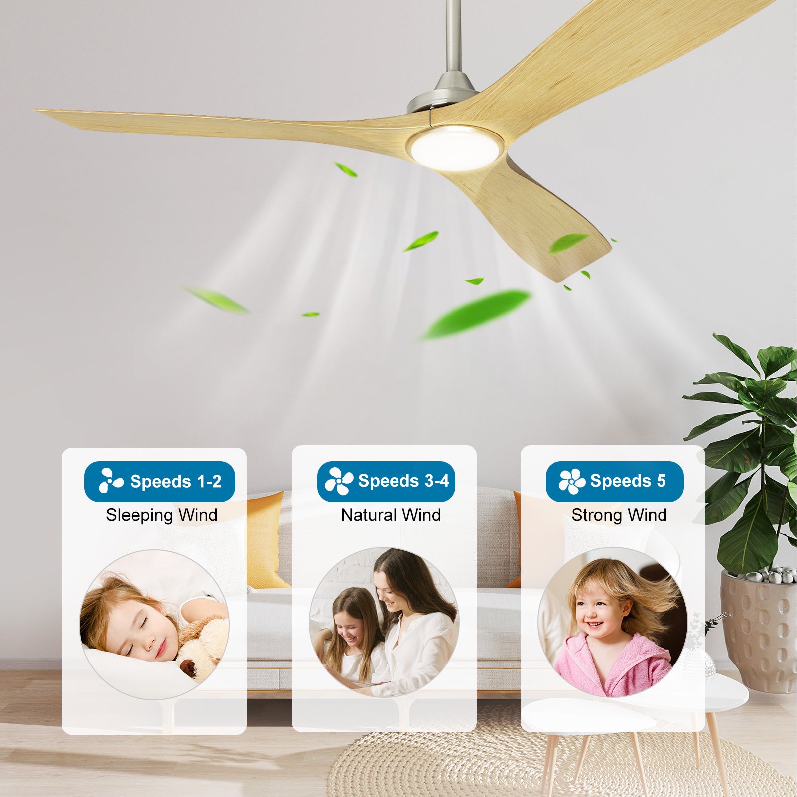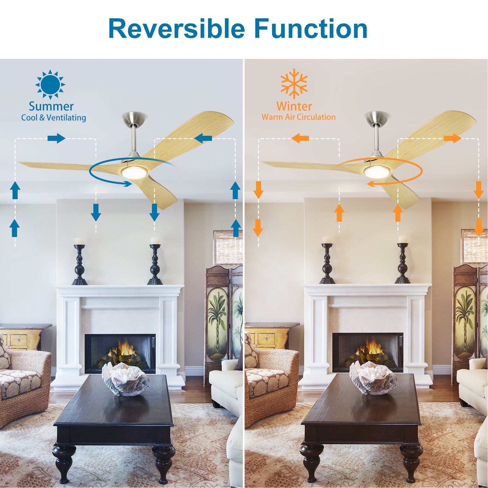 - 【Energian säästö】Kääntyvän ohjaustoiminnon avulla voit vaihtaa nykyaikaisen kattotuulettimen suunnan alaspäin suuntautuvasta ilmavirrasta kesällä ylöspäin kylmemmän talvikauden aikana, jolloin katosta katoava lämpö saadaan talteen ja energiakustannukset pienenevät.