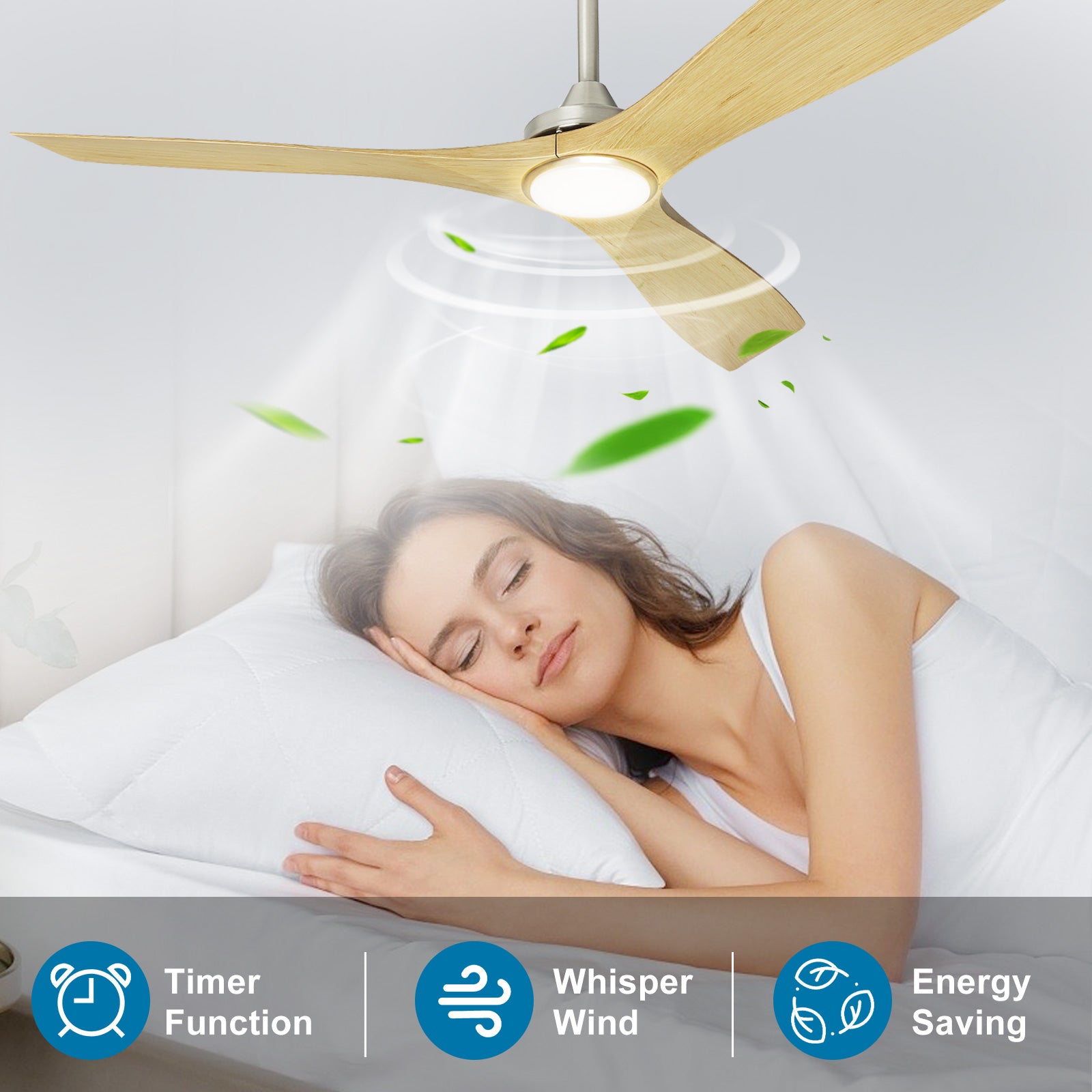 - 【Kaukosäädin】 Kaikkia toimintoja voidaan ohjata kaukosäätimellä, paina 2 kertaa valokytkintä asentoon (valkoinen valo - lämmin valo - keltainen valo), 5 tuulennopeutta ja tukee ajoitusta (1/2/4/8 tuntia) nukkumisen sammutus. Tuuletin tai valaistus voidaan kytkeä päälle erikseen.