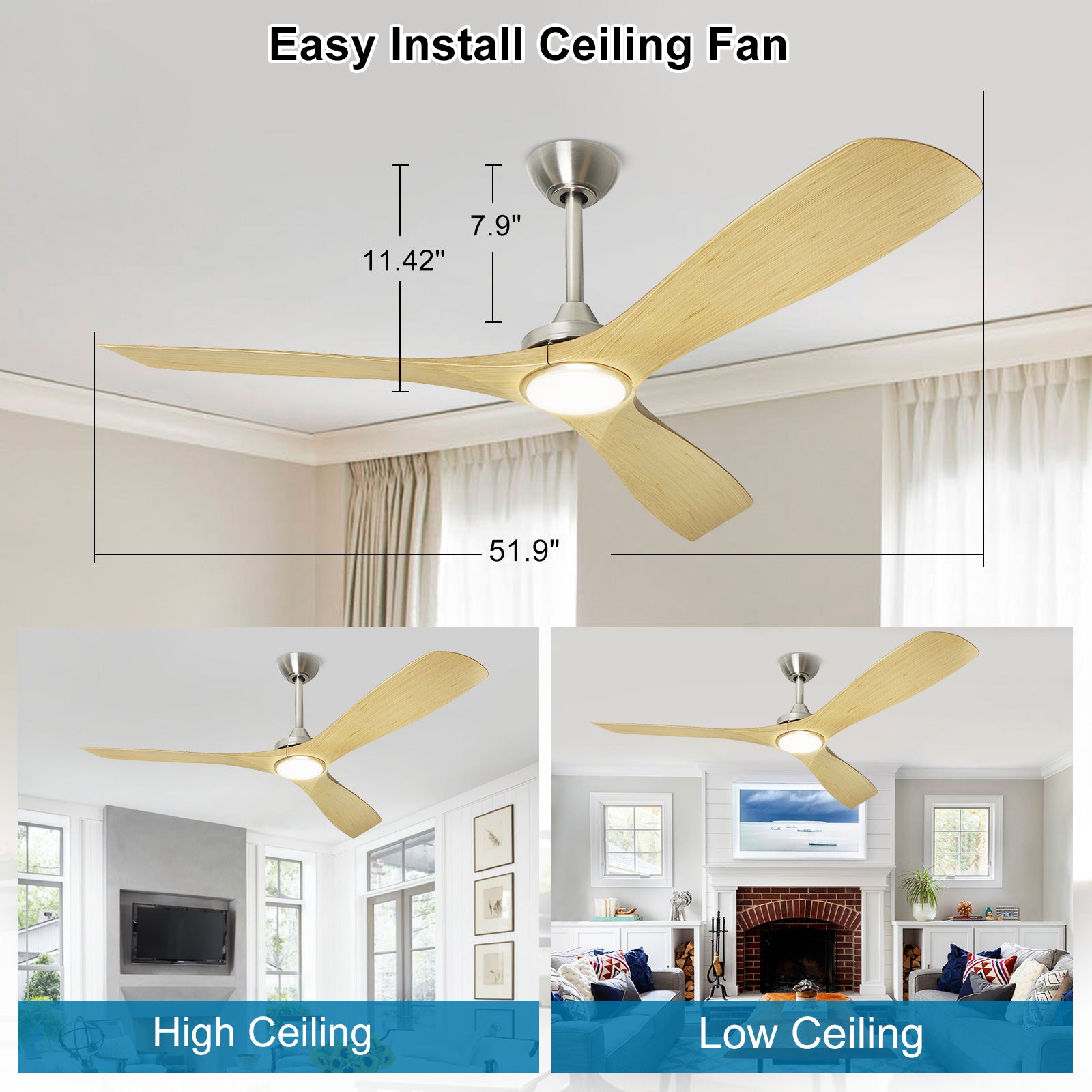 - 【Helppo asennus】 Halkaisija 52 tuumaa, 2 alasauvaa: 3,9 tuumaa ja 7,9 tuumaa, matalalle ja kattokorkeudelle, ripustusjärjestelmä varmistaa, että tuuletin on tasapainossa.