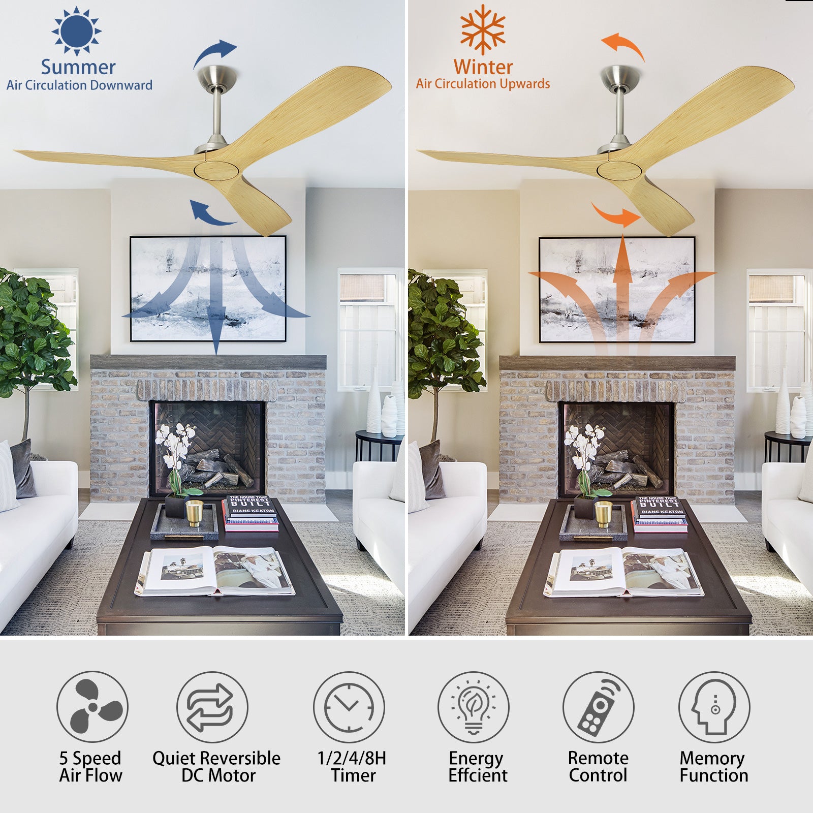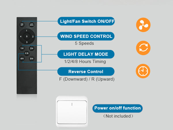 | Special Features | Reversible DC silent motor, 1/2/4/8H Timer, 5 Speeds, 3 Color Temperature, Air Circulation, Memory, 3.9"/7.9" Downrods Adjustable Mounting Height, Memory |