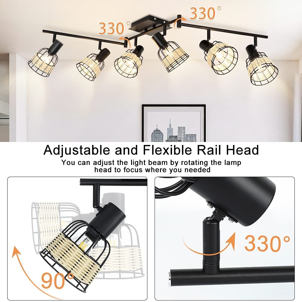 - 3. 【Multi-angle Illumination】 The rattan spotlight kits have 6 flexible track heads to direct and focus the light where needed (90° rotatable of the light head and 330° rotatable of the main bracket). Adjust the track-style lamp to place the light just where you need it.