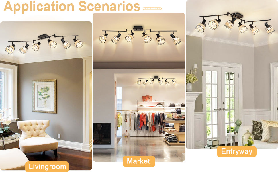 - 5. 【Wide Application】 The track lights ceiling is a perfect decoration for the bedroom, living room, dining room, entryway, hallway, kitchen island, foyer, attic, cafe, restaurant, bar, etc. It suits different styles, including boho, contemporary, farmhouse, traditional and rustic.
