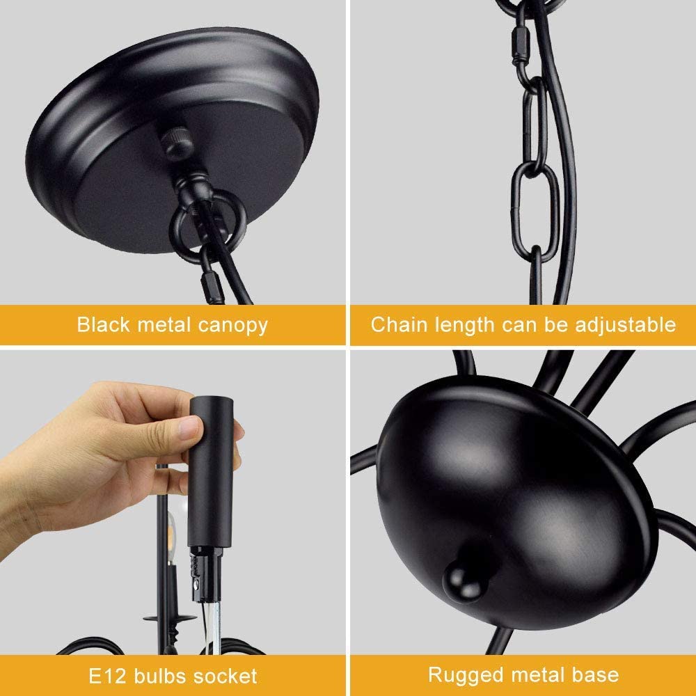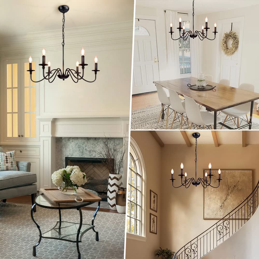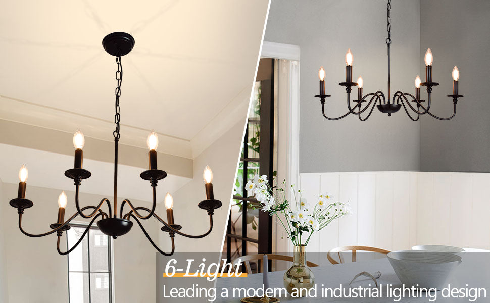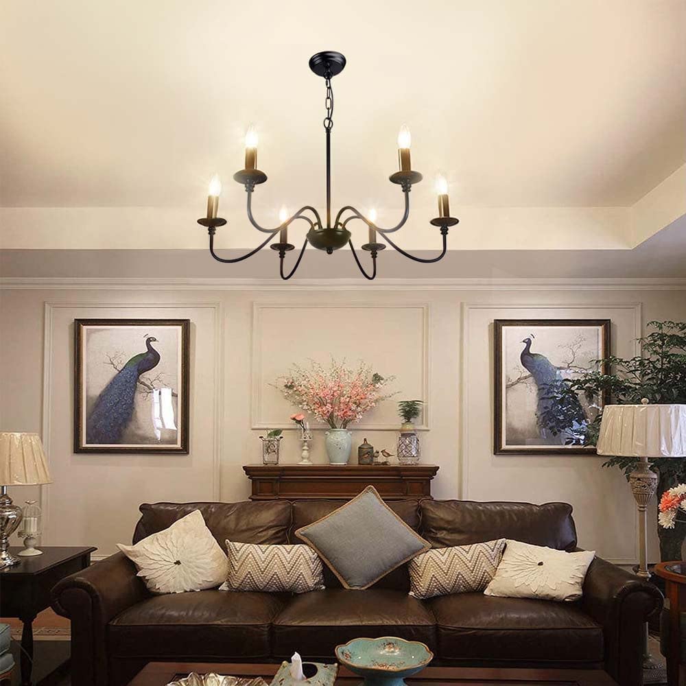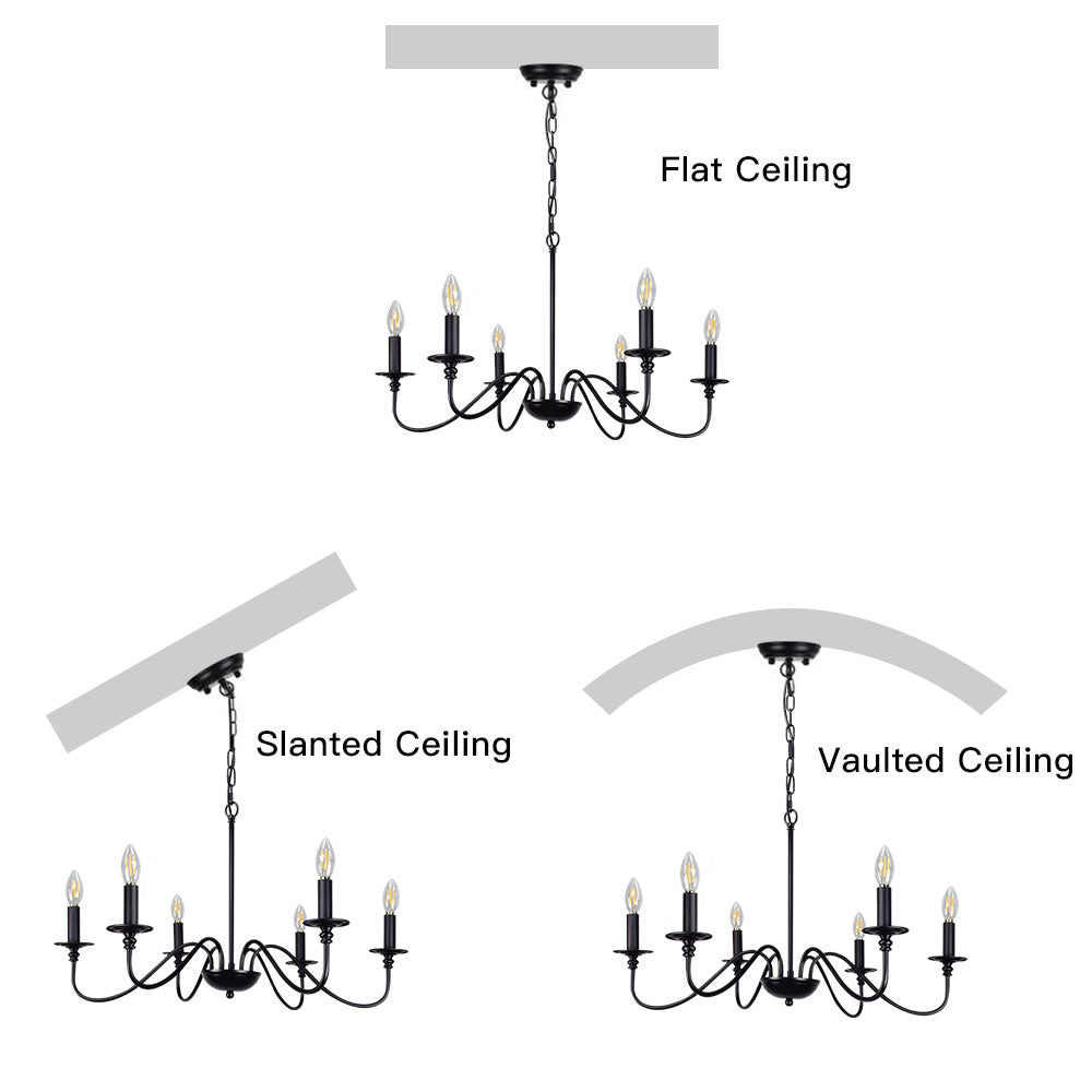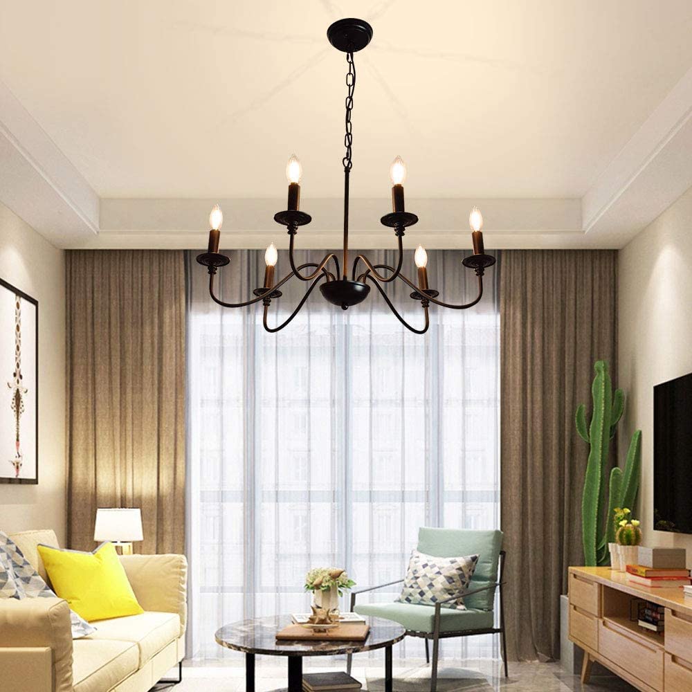 - 【Rustic Candle Style -kattokruunu】Raudista valmistettu musta metallipinta, kuusi kynttilänvartta on sijoitettu yksinkertaisiin kaareviin rautavarsiin. Yksinkertainen ja retromuotoilu lisää maalaistalon kattokruunulle tyylikkään ilmeen. Valaisinta voidaan käyttää kaikissa katoissa, mukaan lukien tasaiset, kaltevat, vinot tai holvikatot.
