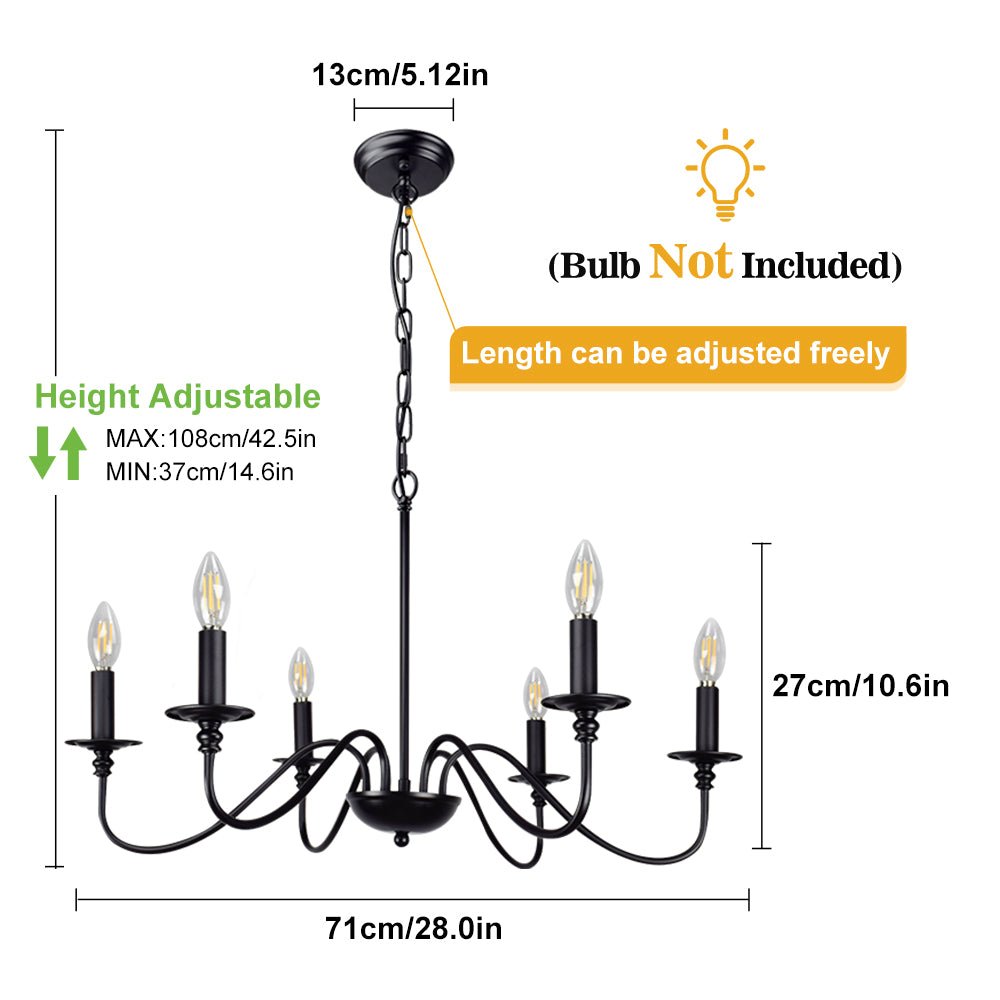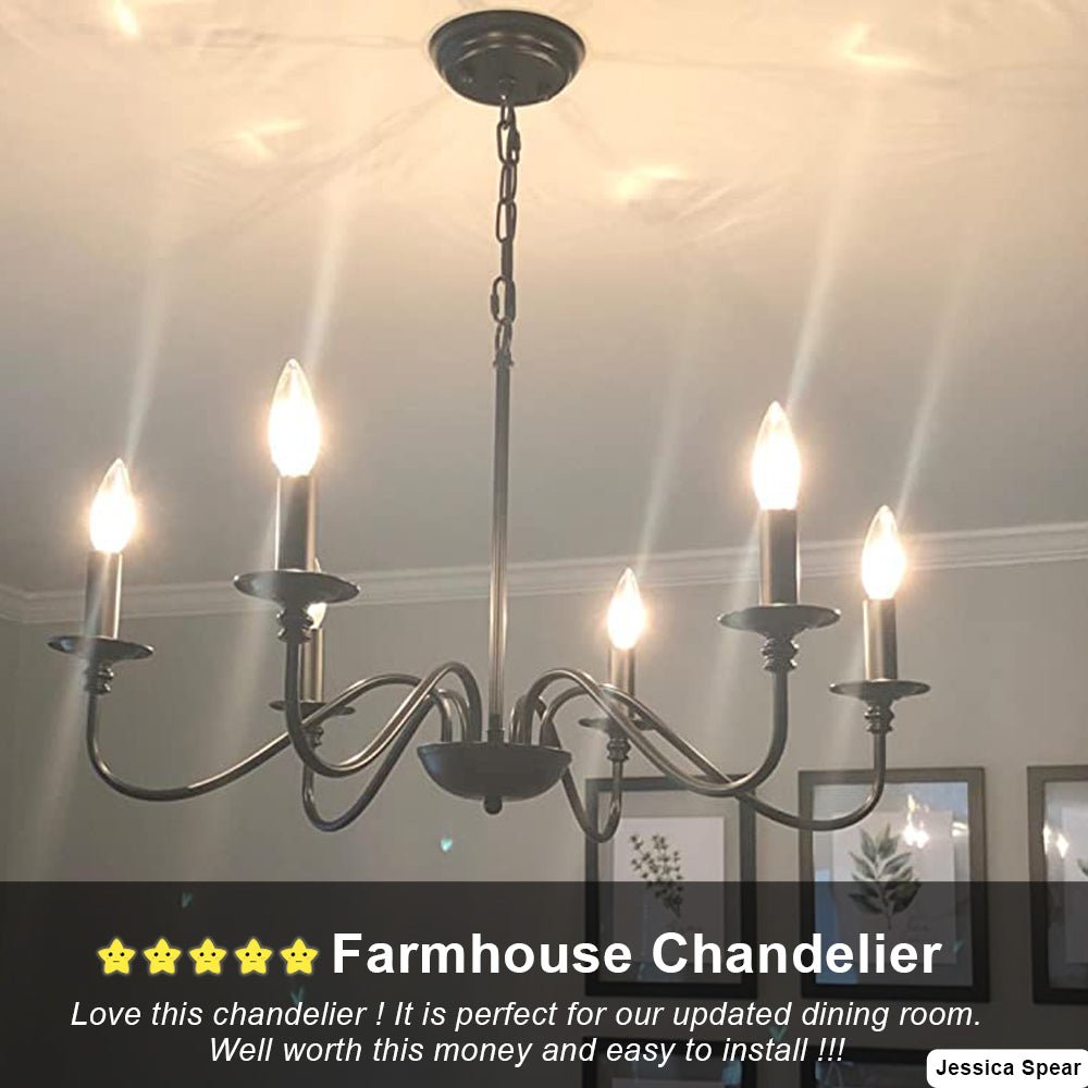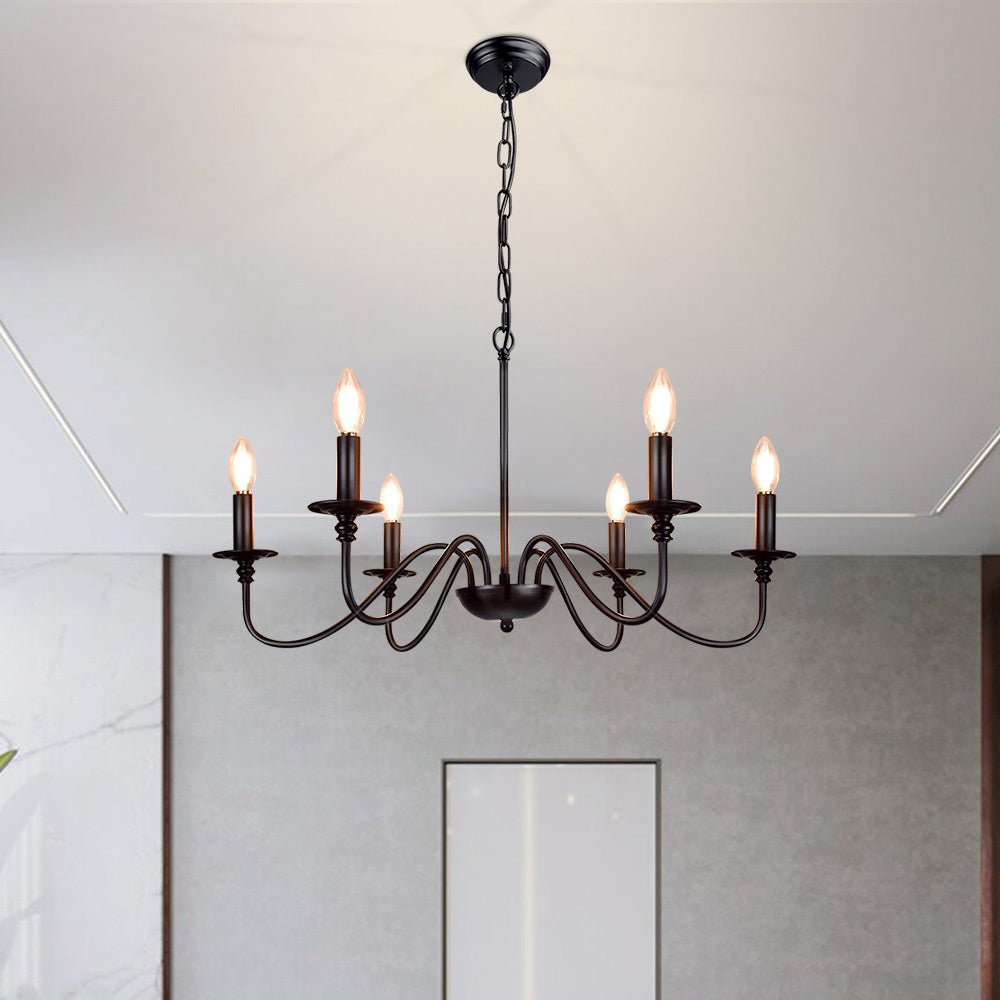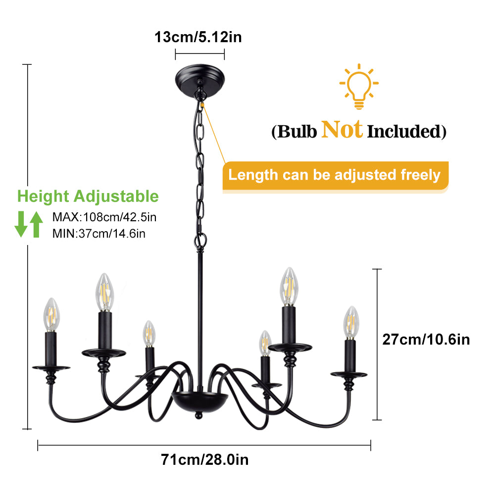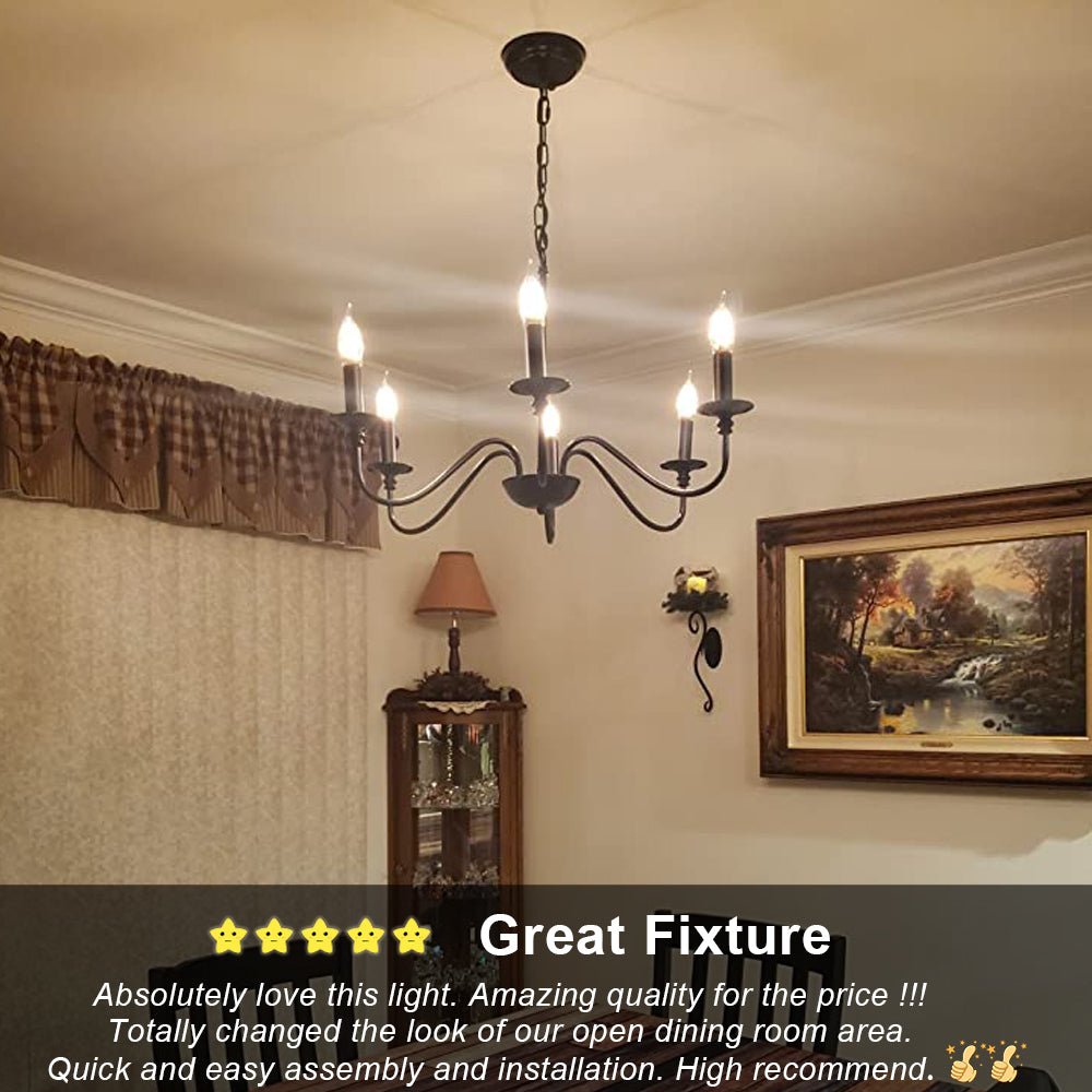 - 【Rustic Candle Style -kattokruunu】Raudista valmistettu musta metallipinta, kuusi kynttilänvartta on sijoitettu yksinkertaisiin kaareviin rautavarsiin. Yksinkertainen ja retromuotoilu lisää maalaistalon kattokruunulle tyylikkään ilmeen. Valaisinta voidaan käyttää kaikissa katoissa, mukaan lukien tasaiset, kaltevat, vinot tai holvikatot.