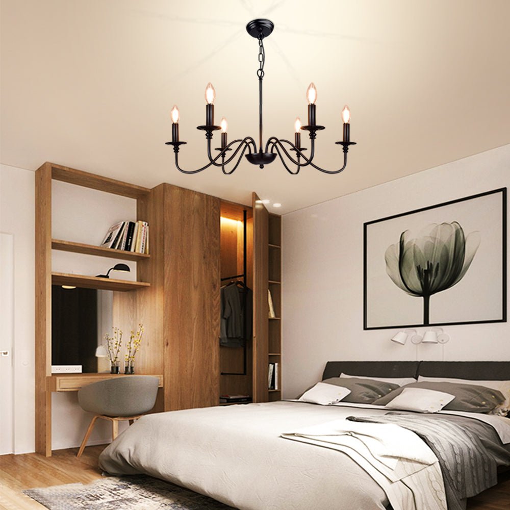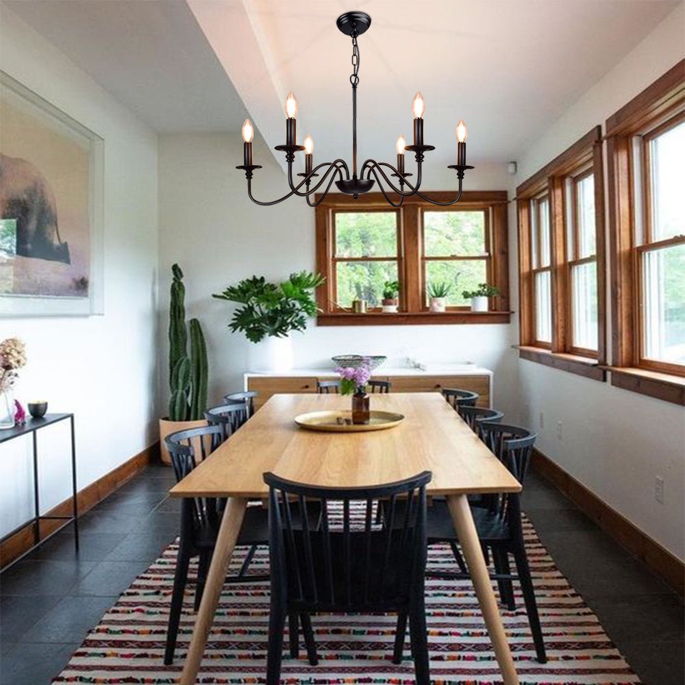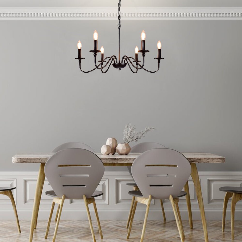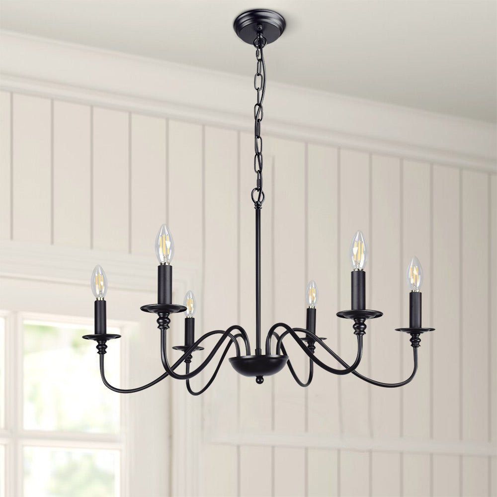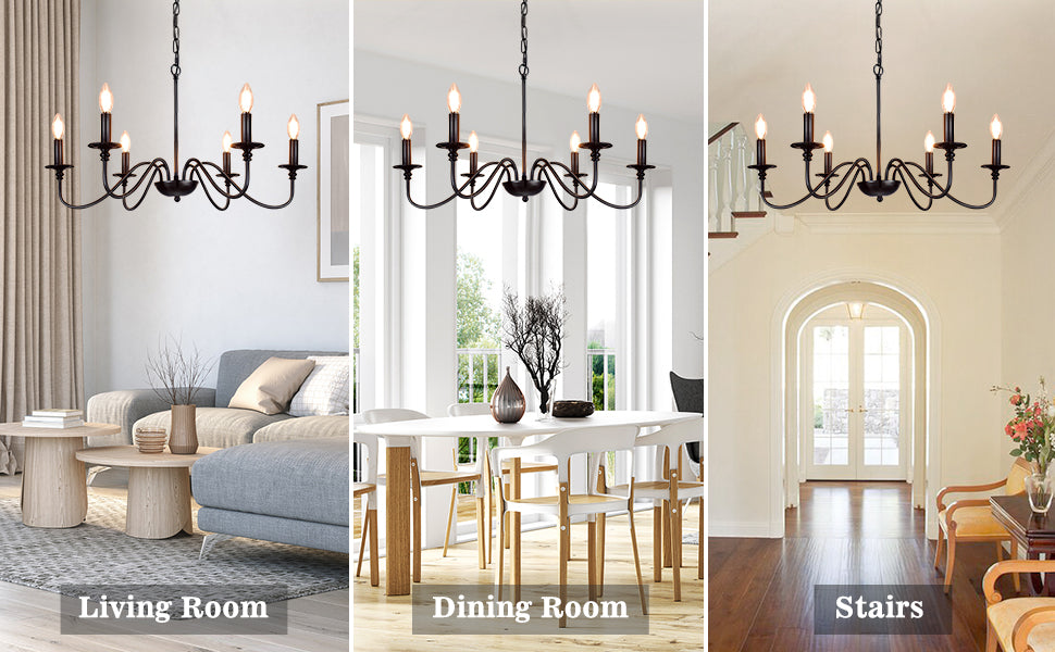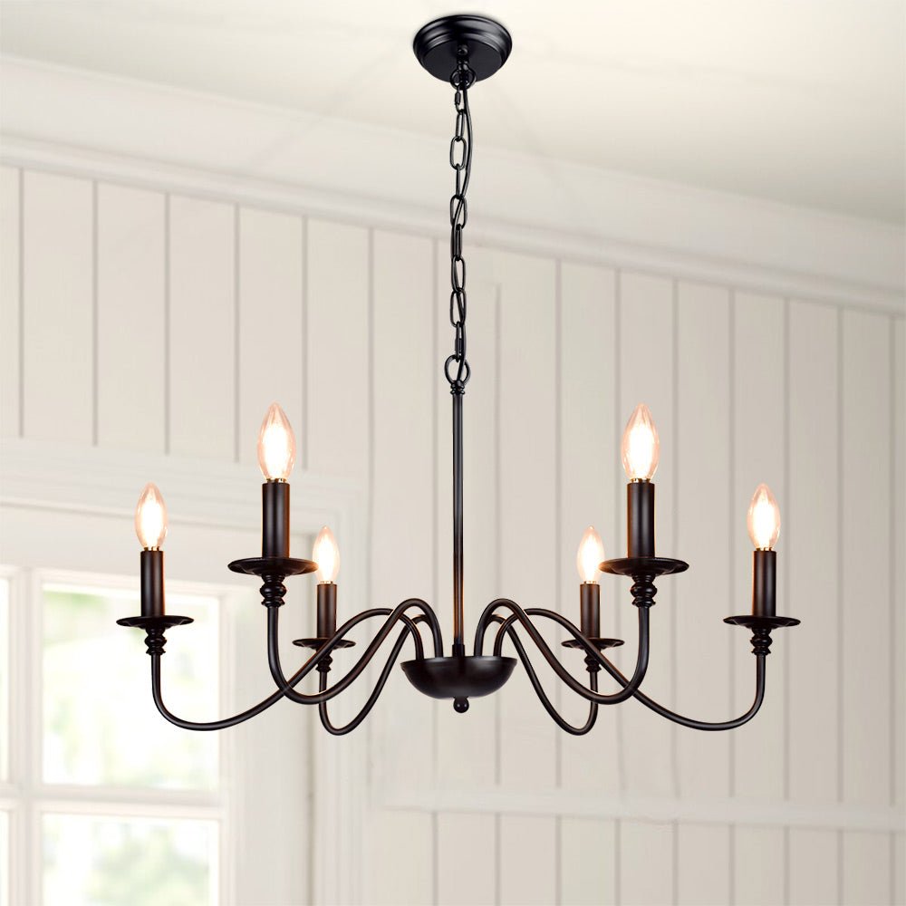 - 【Rustic Candle Style -kattokruunu】Raudista valmistettu musta metallipinta, kuusi kynttilänvartta on sijoitettu yksinkertaisiin kaareviin rautavarsiin. Yksinkertainen ja retromuotoilu lisää maalaistalon kattokruunulle tyylikkään ilmeen. Valaisinta voidaan käyttää kaikissa katoissa, mukaan lukien tasaiset, kaltevat, vinot tai holvikatot.