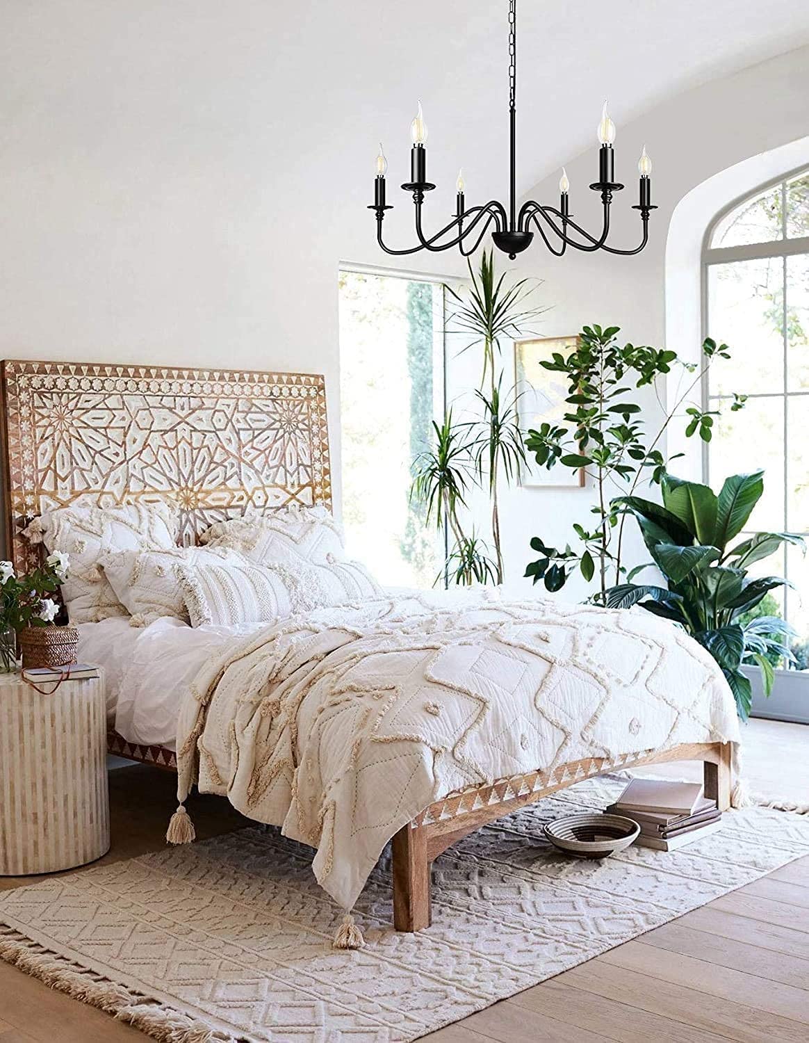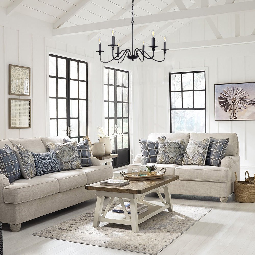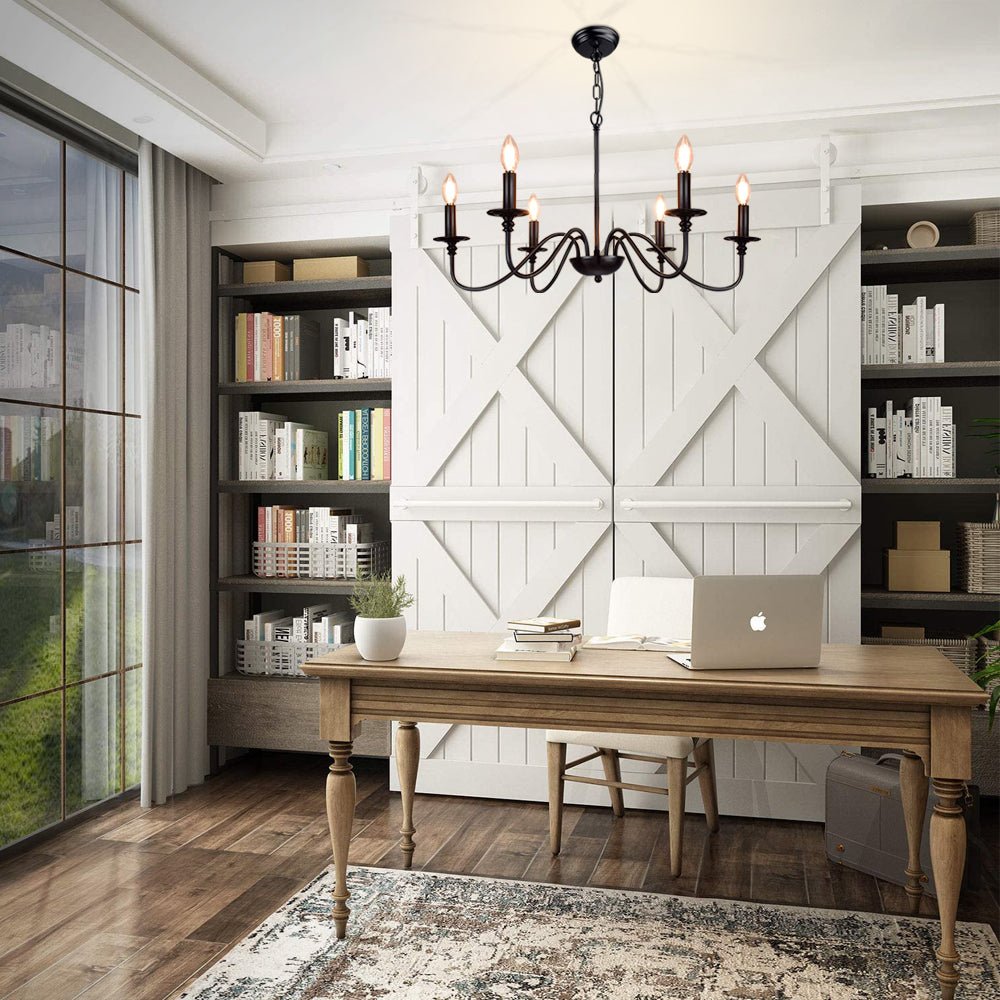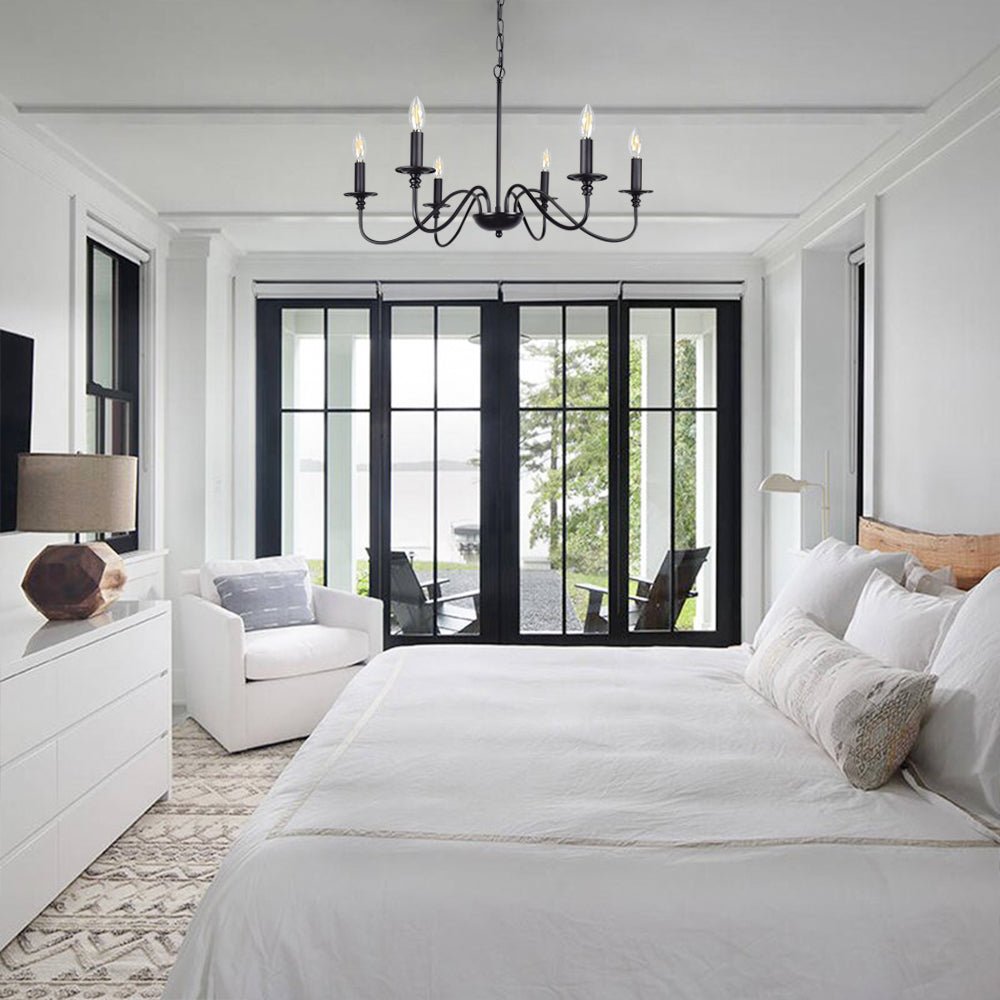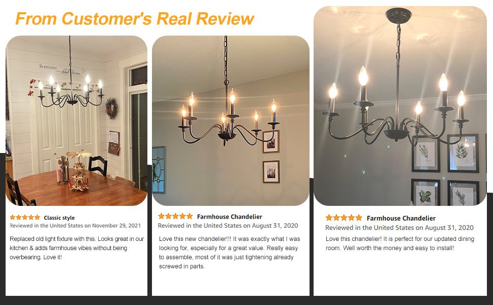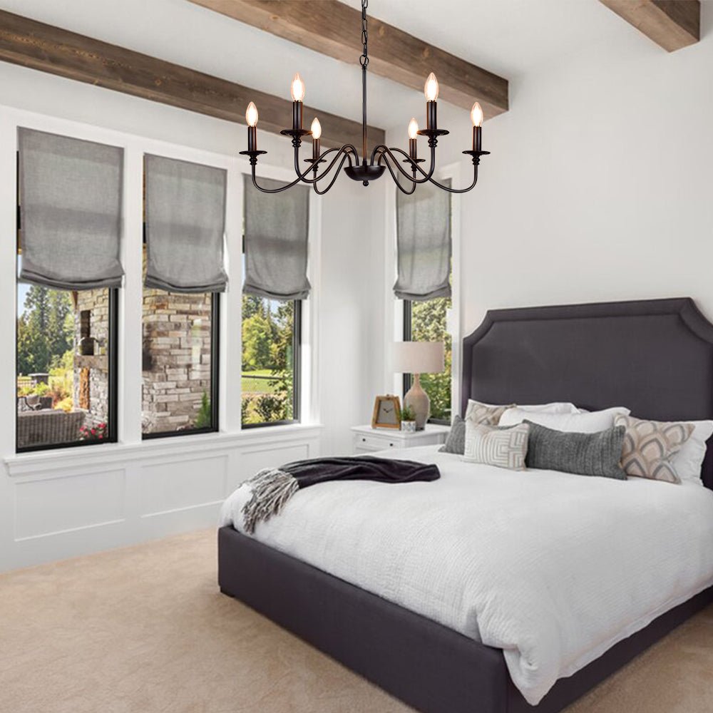 - 【Rustic Candle Style -kattokruunu】Raudista valmistettu musta metallipinta, kuusi kynttilänvartta on sijoitettu yksinkertaisiin kaareviin rautavarsiin. Yksinkertainen ja retromuotoilu lisää maalaistalon kattokruunulle tyylikkään ilmeen. Valaisinta voidaan käyttää kaikissa katoissa, mukaan lukien tasaiset, kaltevat, vinot tai holvikatot.