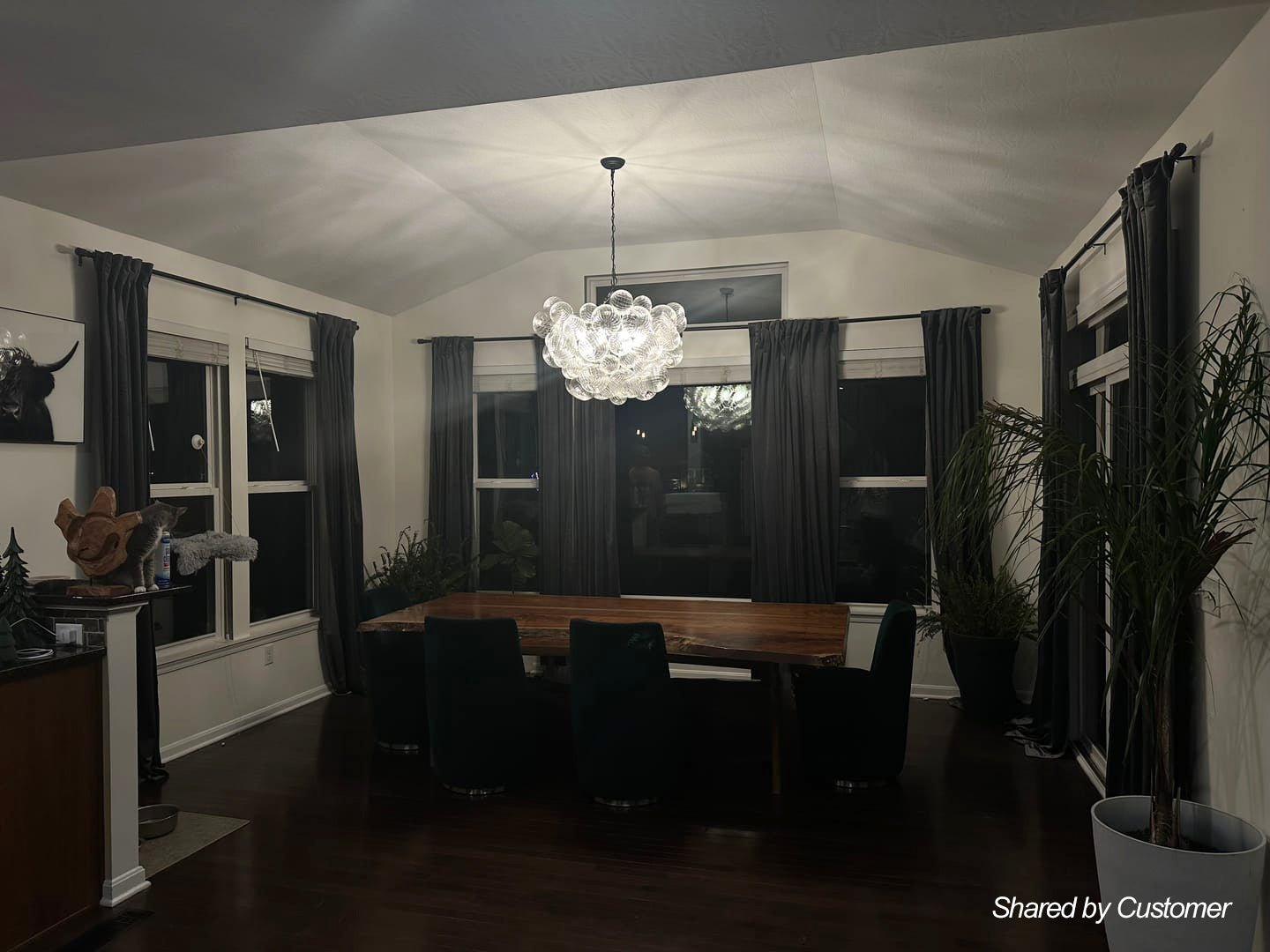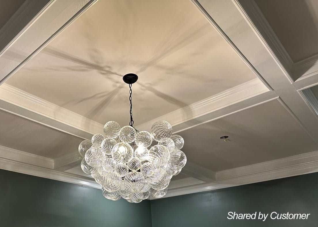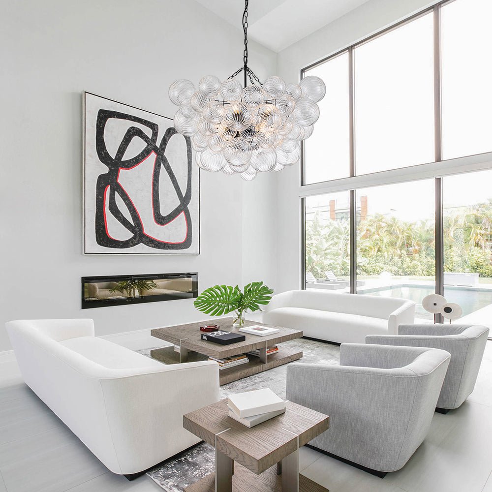 Tämä moderni kuplakruunu, joka on ryhmitelty upeisiin ryhmiin, tarjoaa hämmästyttävän romanttisen ja fantasiavisuaalin. Tässä klusteripallokruunussa on hieno taidokkaat uurretut lasipallot, jotka kerääntyvät kulhoon, joka on viimeistelty mattamustalla viimeistelyllä. Kun kytket tämän klusteripallon kuplakruunun päälle, valaistus virtaa uurretussa lasissa kuin samppanja ja levittää upean tunnelman tilaan. Tämä upea rypälelasimainen maapallokruunu on rohkea ja upea aksentti, joka korostaa minkä tahansa olohuoneen, ruokailutilan, eteisen, makuuhuoneen, kylpyhuoneen tai eteisen sisustusta.
