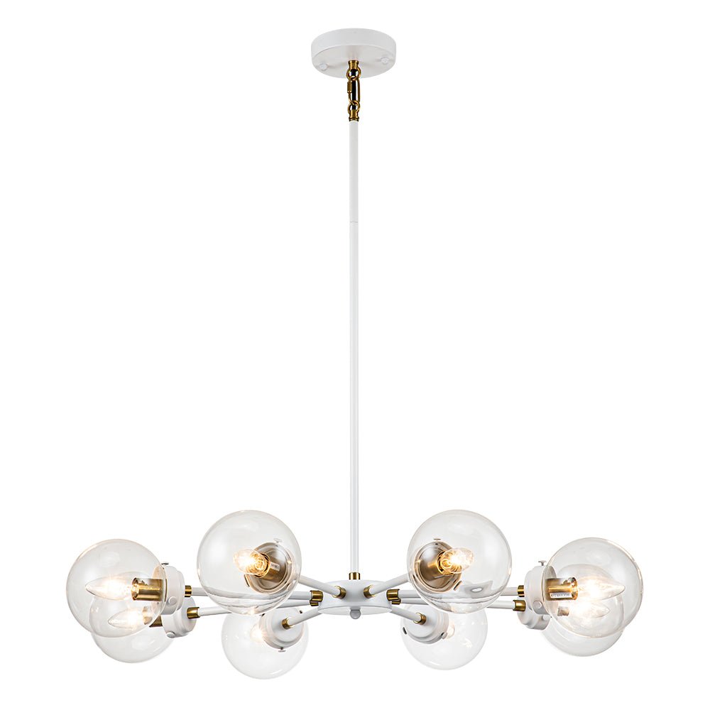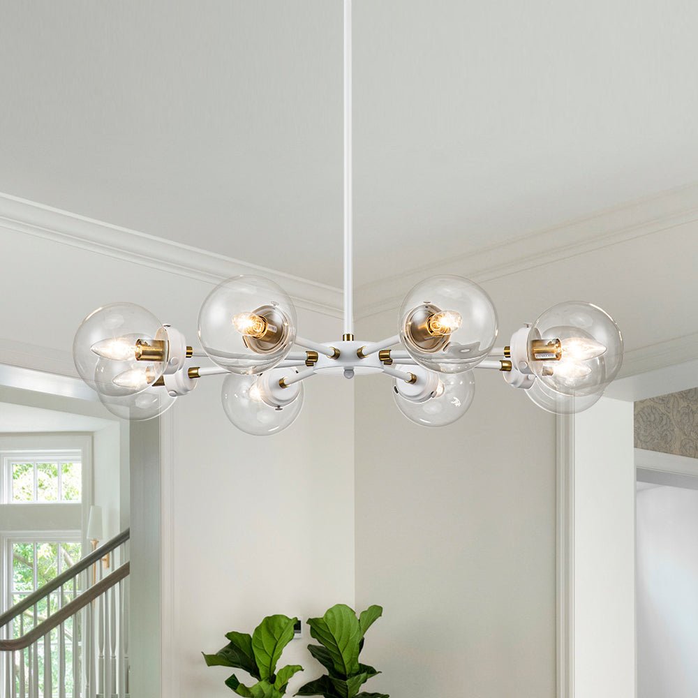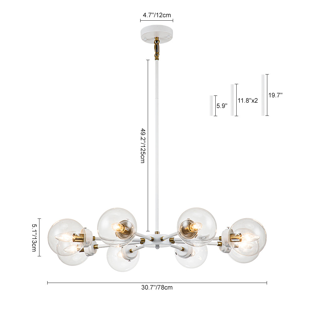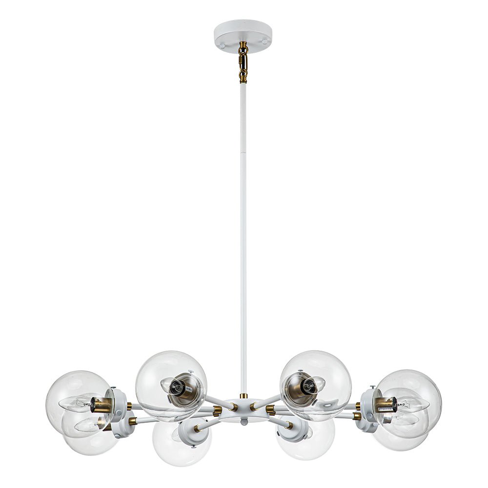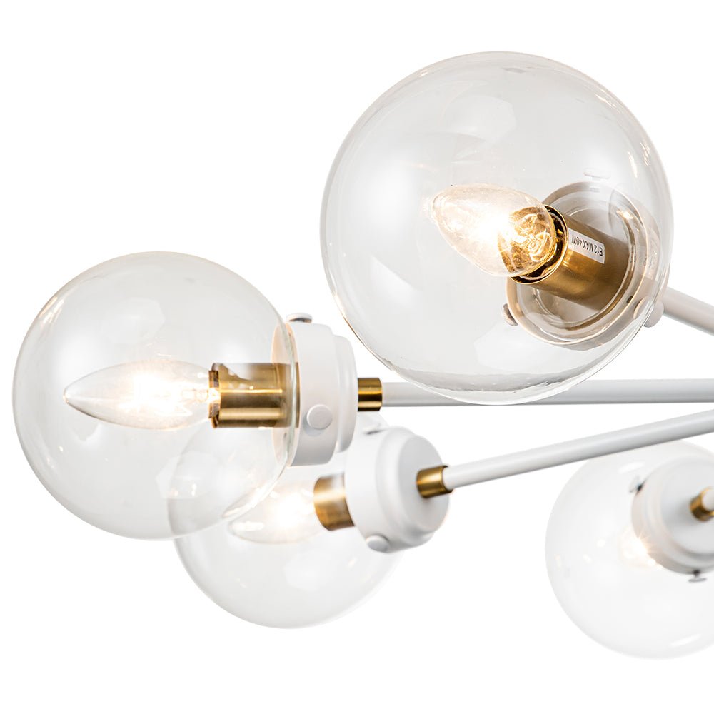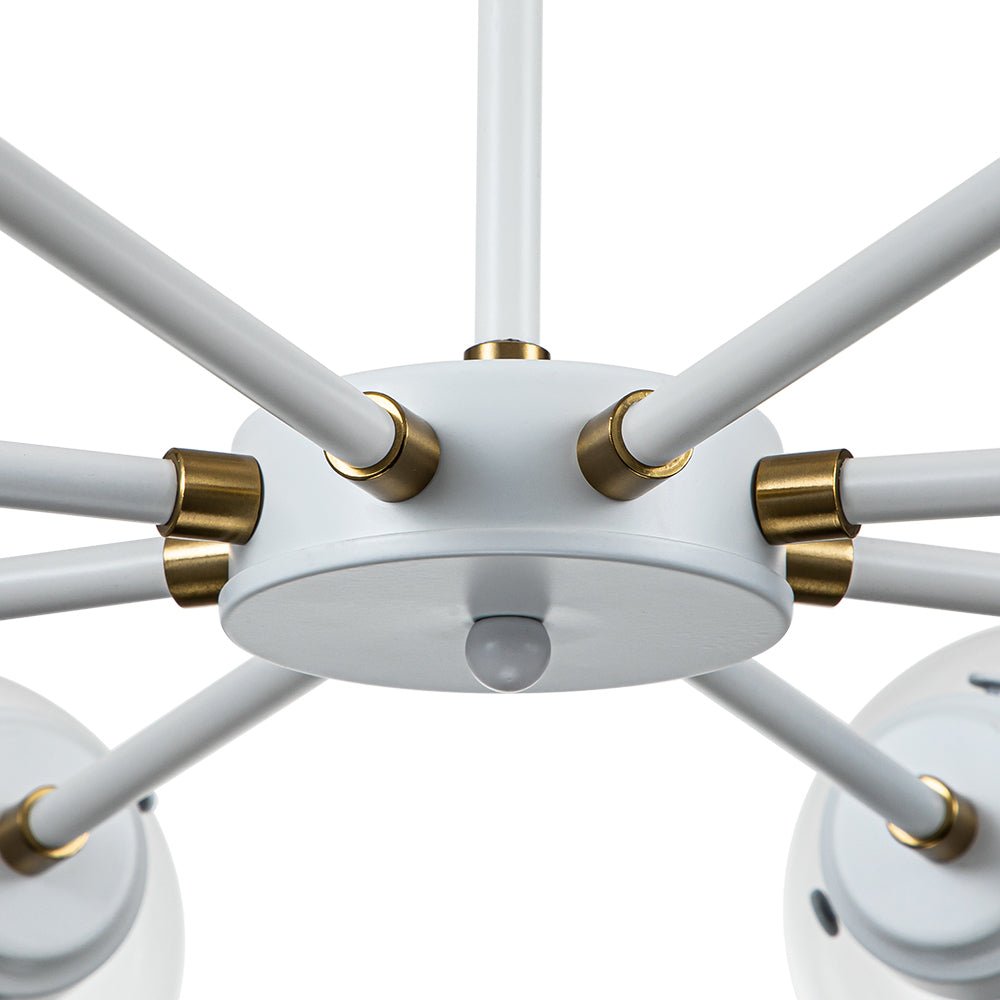 Kahdeksan valoa • Sputnik-design • Lasipallovarjostimet • Valkoinen + messinkiviimeistely • E12-pohjaiset polttimot (ei sisälly) • Kiinteä • UL-listattu
