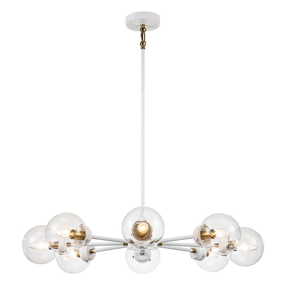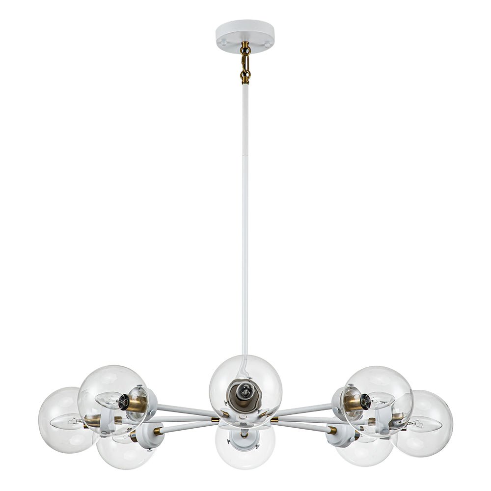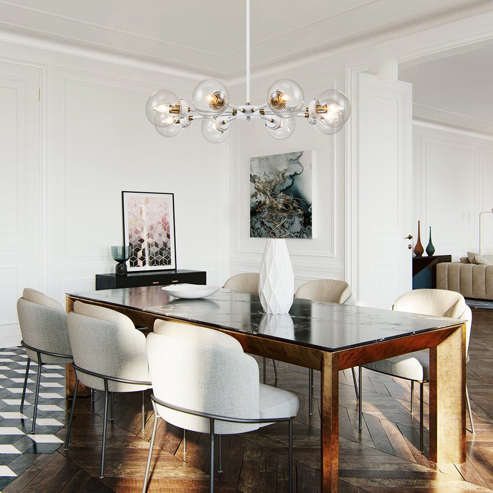 Tämä moderni 10 valon kattokruunu luo klassisen sputnik-designin rakastetun kuplan. Mattavalkoinen viimeistely rikkoo yleisen väriyhdistelmän ja tuo tanskalaista ja skandinaavista energiaa tähän kirkkaaseen lasimaapallokruunuun. E12-kantaisilla polttimoilla (ei sisälly toimitukseen) varustetut messinkiset kantajat lisäävät ripauksen tyylikästä ja hienostunutta tyyliä. Ilahdu ruokailuhuoneessa, olohuoneessa, keittiössä, makuuhuoneessa tai sisäänkäynnissä tällä modernilla 8-valokupla-sputnik-kattokruunulla.Tiedot