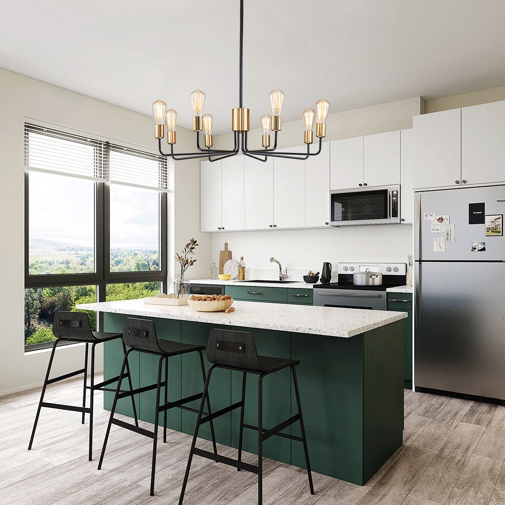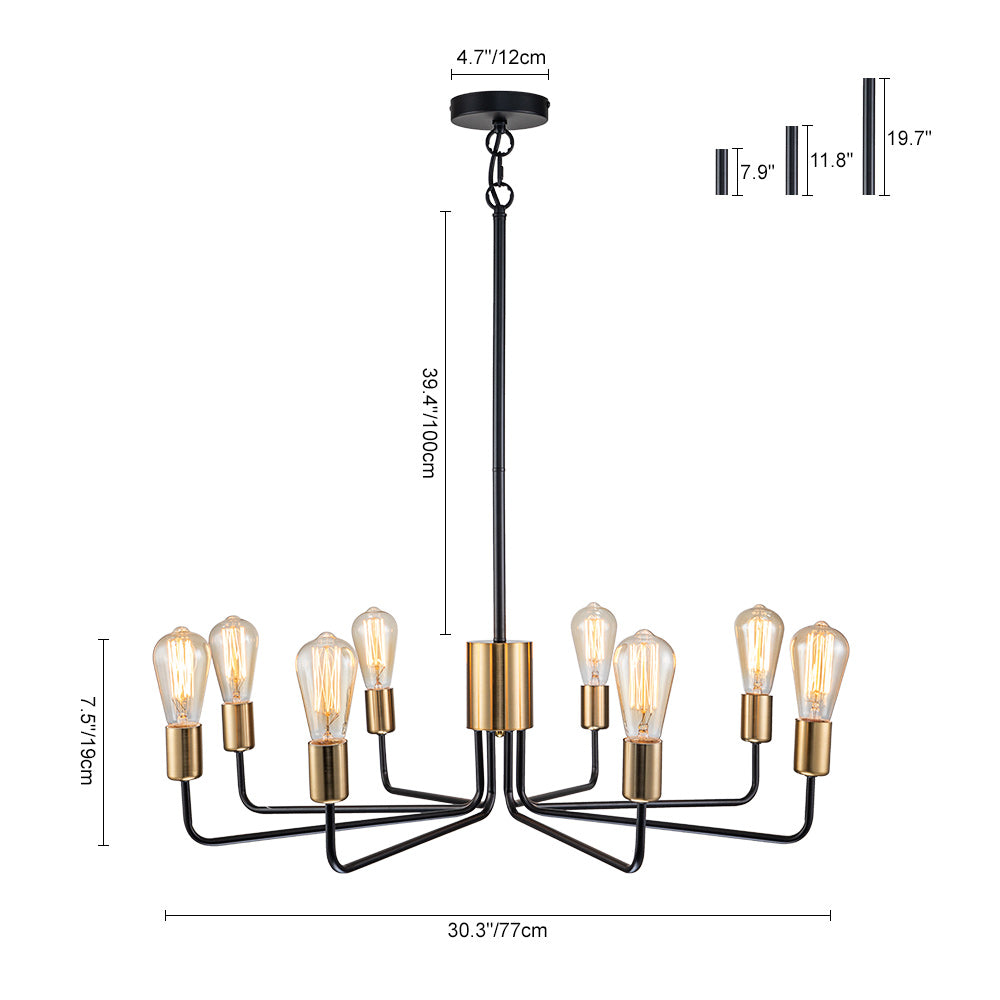 Perinteisen kynttelikkösuunnittelun innoittamana tässä 8-kevyisessä sputnik-kruunussa on kahdeksan mustaa, siroa ylöspäin suuntautuvaa vartta, jotka ulottuvat keskipylväästä. Messingillä viimeistelty, varsien yläosassa on kahdeksan sylinterimäistä kantaa E26-keskikantaisille polttimoille (ei sisälly toimitukseen). Paljas polttimomuotoilu lisää teollista tunnelmaa tähän mustaan messingiseen lineaariseen kattokruunuun. Moderni vuosisadan puolivälissä ja vintagessa tämä 8-valon kynttilätyylinen sputnik-kattokruunu on täydellinen levittämään kirkasta valaistusta keittiösaarekesi, ruokasaliin, olohuoneeseen, eteiseen ja makuuhuoneeseen.Tiedot