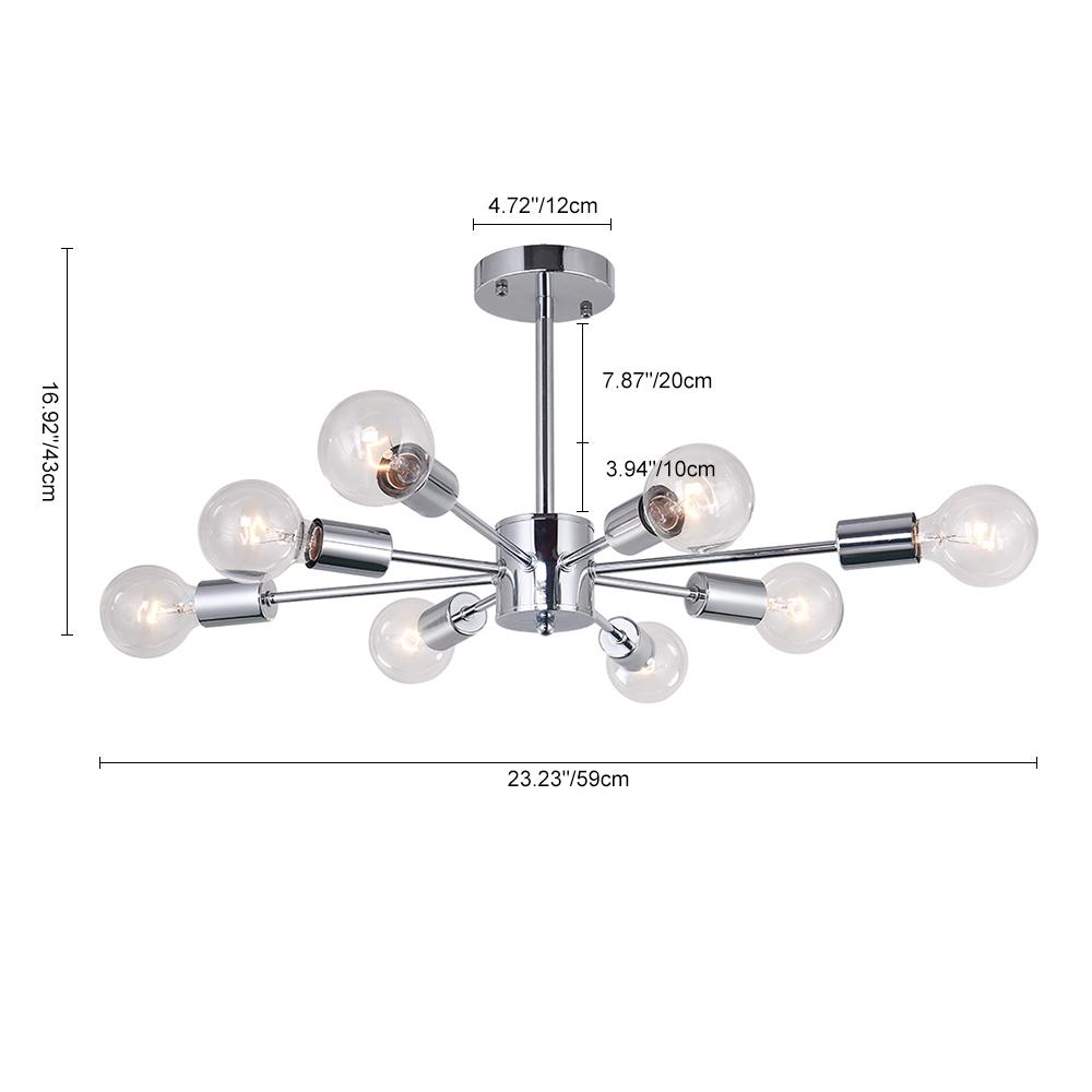 Tämä retro-sputnik-designin inspiroima tyylikäs puoliksi upotettava kattovalaisin tuo kotiisi modernin vuosisadan puolivälin vivahteen. Kiillotettu kromipinnoite, tämä sputnik-tyylinen kattokruunu heijastaa kahdeksan ohutta suoraa vartta, joiden päässä on sylinteriholkit. Tämä kromikattovalaisin sallii keskipitkän E26/E27-polttimot (ei sisälly toimitukseen), joten se on rohkea valinta mihin tahansa moderniin ja nykyaikaiseen sisustukseen. Suosittelemme tämän kromin kattovalaisimen asentamista ruokailuhuoneeseen, olohuoneeseen, makuuhuoneeseen ja eteiseen.Detail