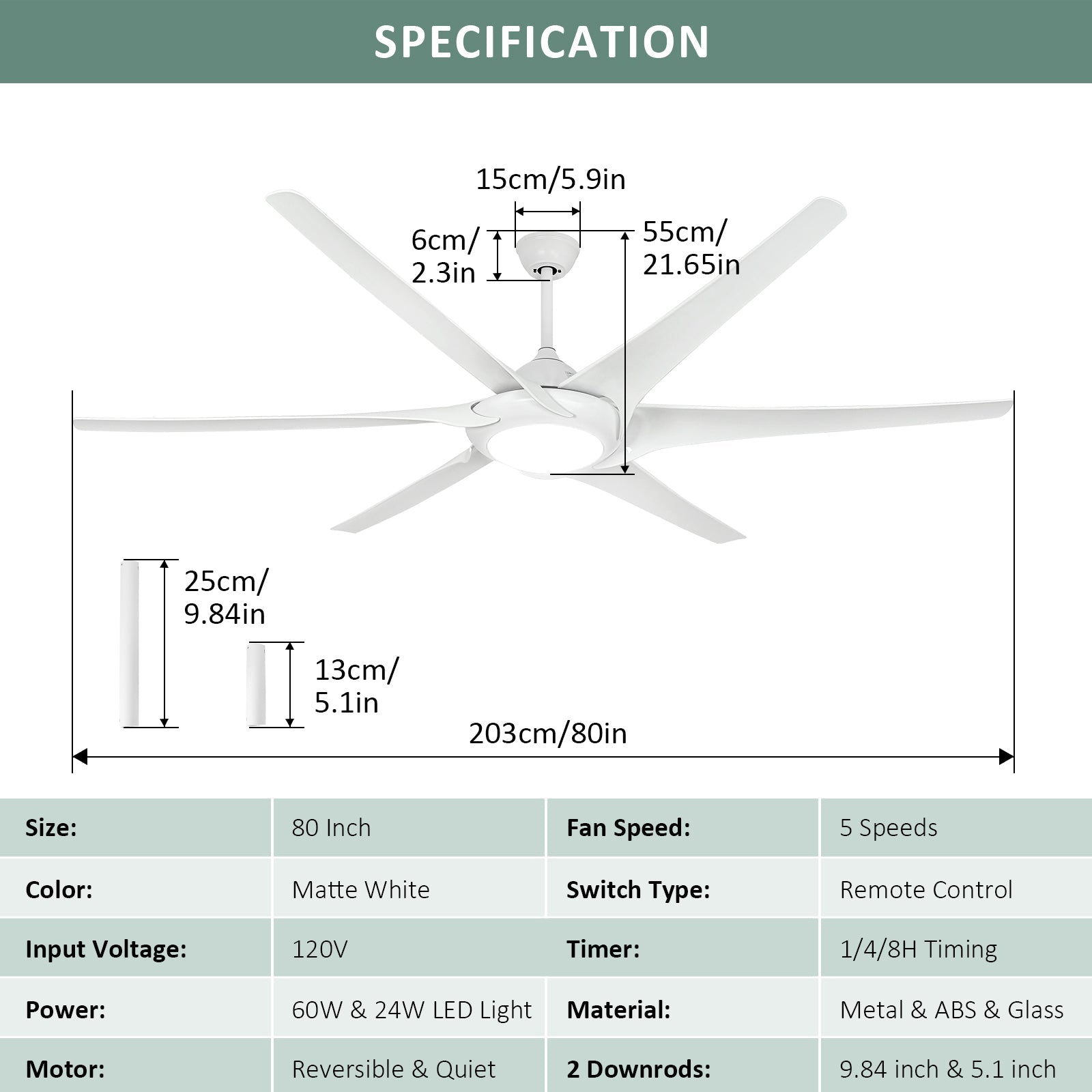 Depuley 80" suuri käännettävä kattotuuletin 24 W:n modernilla himmennettävällä LED-valolla, 6 terää, 5 vaihdetta, 3 väriä vaihdettava, 1/2/4/8h ajastin, ennakkomyynti