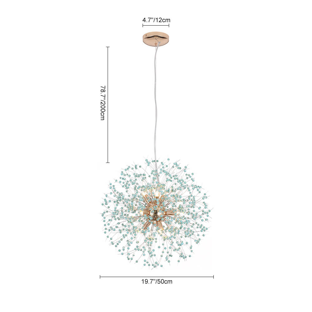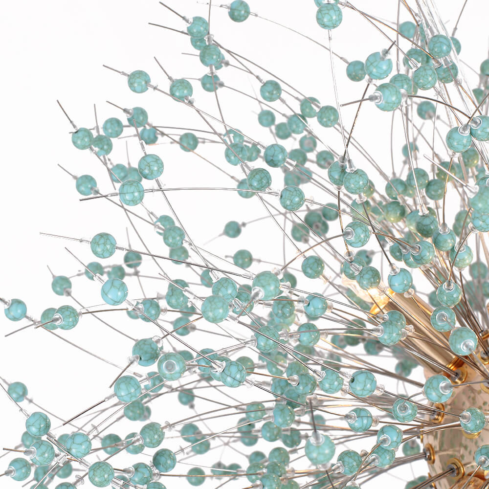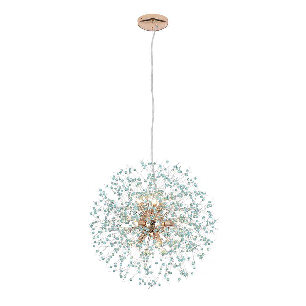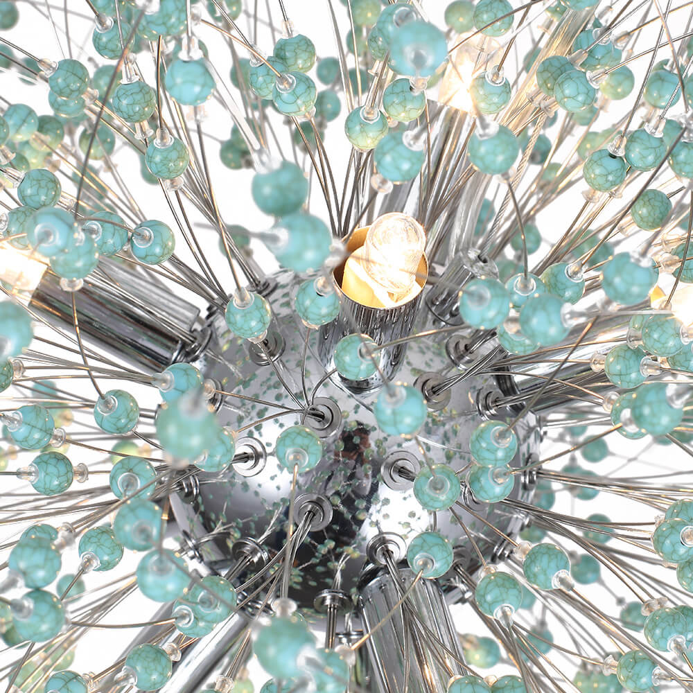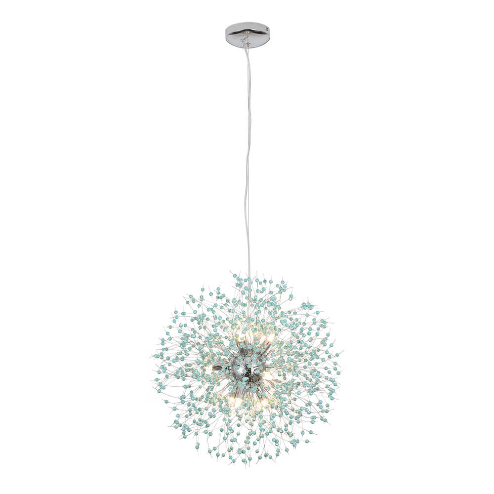 Tämä ilotulituskruunu on saanut inspiraationsa siroista voikukkasuunnittelusta, ja sitä korostavat turkoosit helmet, jotka tuovat tyylikkään boheemin tunnelman. Yhdeksän G9-polttimoa (ei sisällä) on turkoosinsinisten helmien välissä luoden lämmintä tunnelmavaloa. Kiillotettu messinki/kromi täydentää tämän turkoosin helmivalaisimen ilmettä ja tarjoaa nykyaikaisen vaikutelman. Tämä 9 vaaleansininen voikukan ilotulituskattokruunu rikkoo perinteisen suunnittelun ja tarjoaa eklektisen ja eksoottisen vaikutelman parantamaan olohuonettasi, makuuhuonettasi, ruokailutilaasi ja sisäänkäyntiäsi.Tiedot
