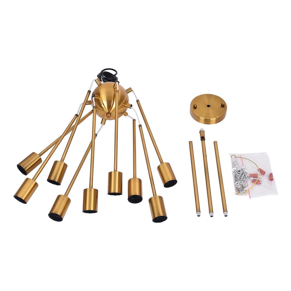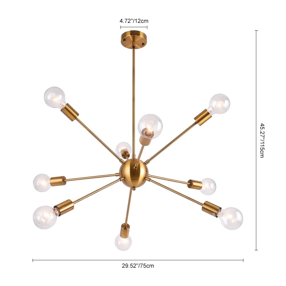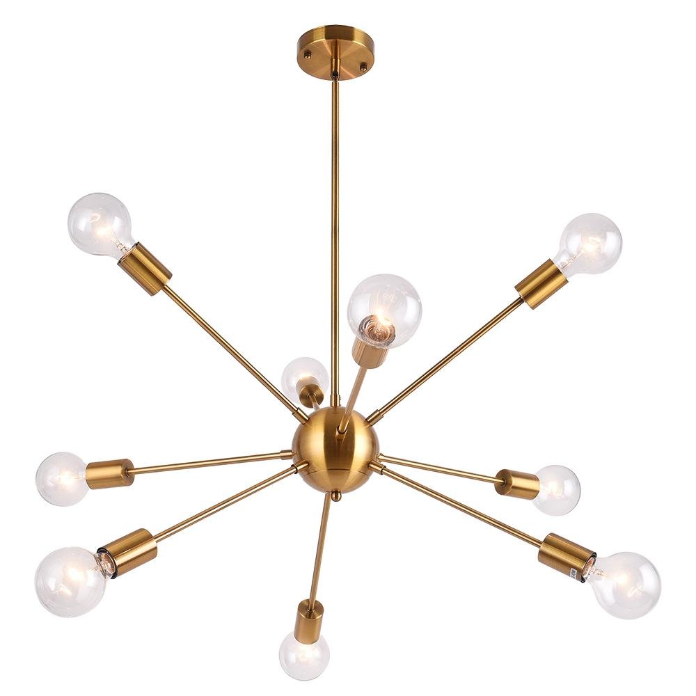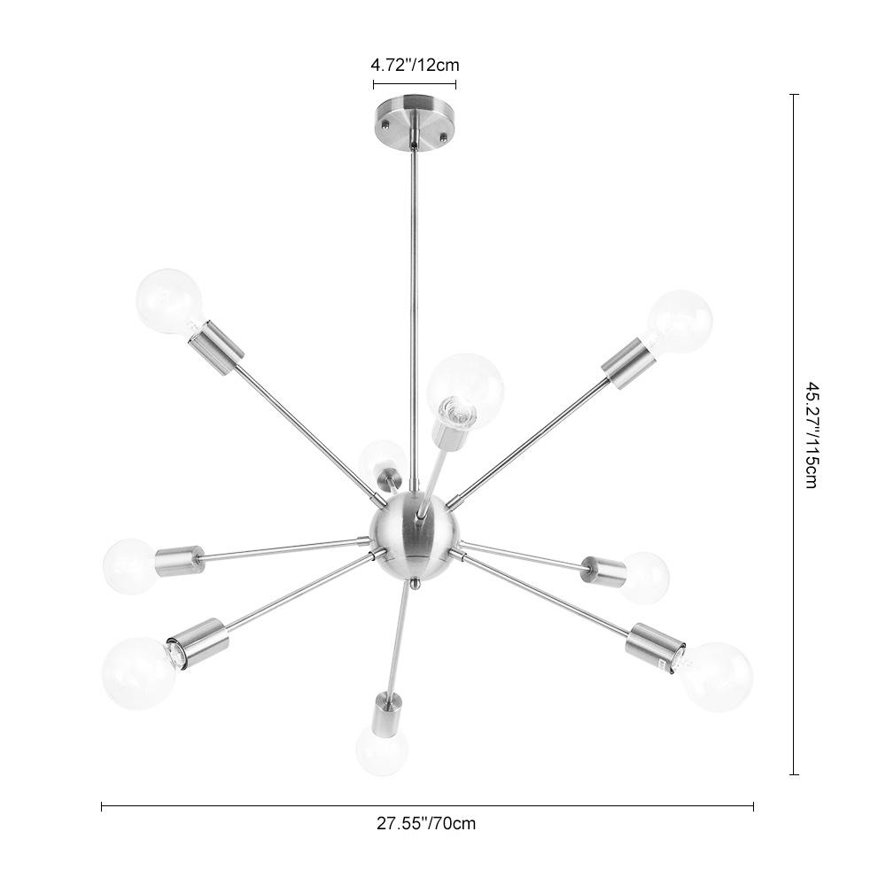 Ripusta vuosisadan puolivälin sputnik-valaisin olohuoneeseen, ruokailuhuoneeseen, makuuhuoneeseen tai eteiseen luodaksesi klassista loistoa moderniin estetiikkaasi. Tässä sputnik-valaisimessa on pallokeskus, joka hajottaa yhdeksän suoraa vartta eri kulmissa retro-asennetta varten. Jokaisen varren päässä on keskikokoinen E26/E27-polttimo (ei sisälly) 40 W:iin asti. Tämä 9 valon kattokruunu on yhteensopiva himmenninkytkimen ja himmennettävien lamppujen kanssa (molemmat eivät sisälly toimitukseen), joten voit vaimentaa valaistusta mielesi mukaan. Mukana oleva alatanko on säädettävä, jotta voit sijoittaa tämän vuosisadan puolivälin kattokruunun sekä korkeaan että matalaan kattoon. Tämä 45 cm (29,52 tuumaa) x 115 cm (45,2 cm) leveä 9-kevyt sputnik-valaisin luo keskipisteen sisustuksellesi.Detail