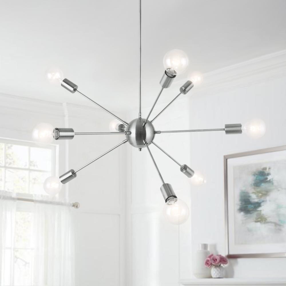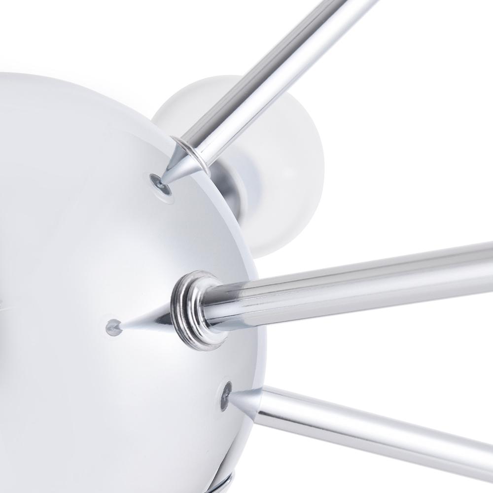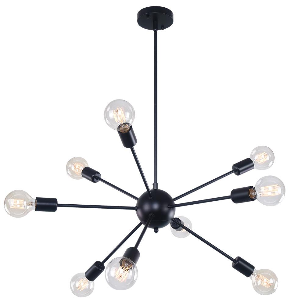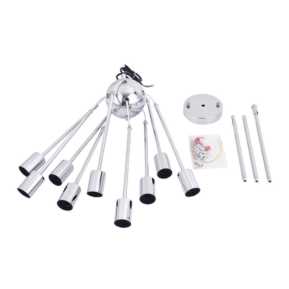 Ripusta vuosisadan puolivälin sputnik-valaisin olohuoneeseen, ruokailuhuoneeseen, makuuhuoneeseen tai eteiseen luodaksesi klassista loistoa moderniin estetiikkaasi. Tässä sputnik-valaisimessa on pallokeskus, joka hajottaa yhdeksän suoraa vartta eri kulmissa retro-asennetta varten. Jokaisen varren päässä on keskikokoinen E26/E27-polttimo (ei sisälly) 40 W:iin asti. Tämä 9 valon kattokruunu on yhteensopiva himmenninkytkimen ja himmennettävien lamppujen kanssa (molemmat eivät sisälly toimitukseen), joten voit vaimentaa valaistusta mielesi mukaan. Mukana oleva alatanko on säädettävä, jotta voit sijoittaa tämän vuosisadan puolivälin kattokruunun sekä korkeaan että matalaan kattoon. Tämä 45 cm (29,52 tuumaa) x 115 cm (45,2 cm) leveä 9-kevyt sputnik-valaisin luo keskipisteen sisustuksellesi.Detail