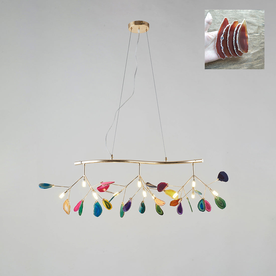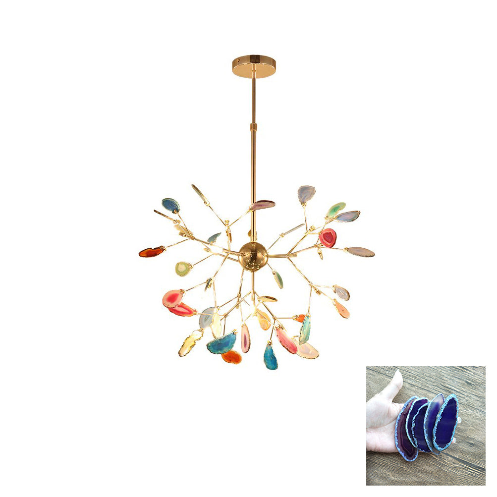 Rohkea ja värikäs Agate Flake -kattokruunu on katseenvangitsija kotisi tai toimistosi keskipiste. Kaunis yksivärinen tai -sävyinen onyksi roikkuu herkissä kullatuissa käsivarsissa luoden ainutlaatuisen ja tyylikkään ilmeen.
