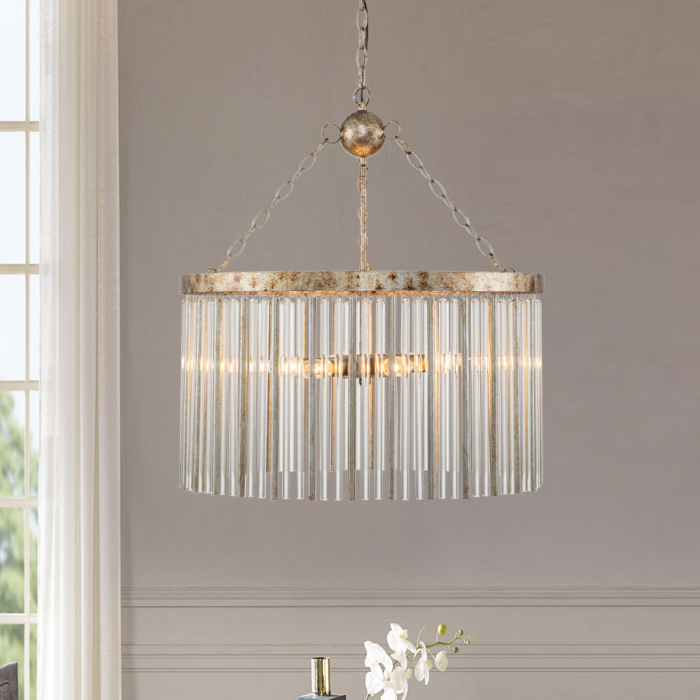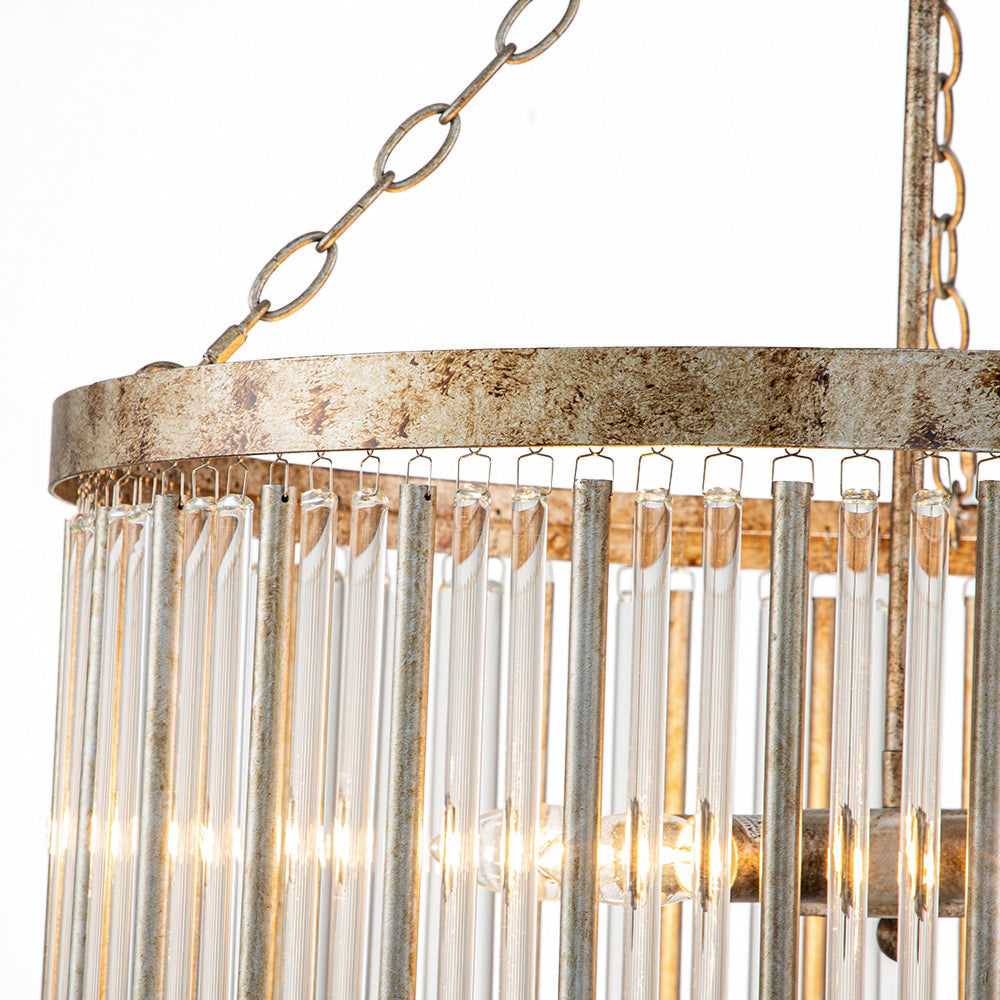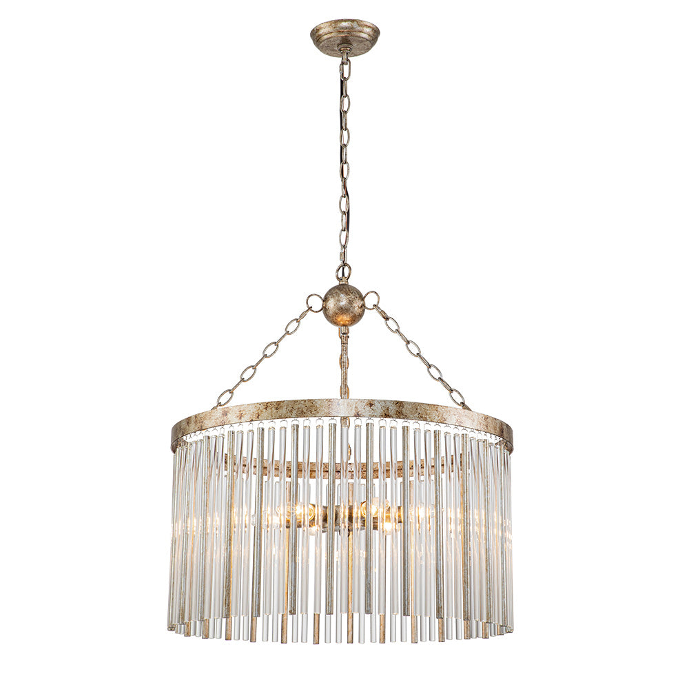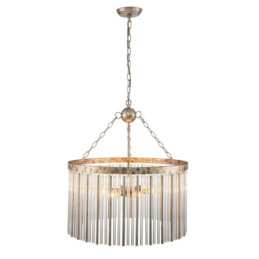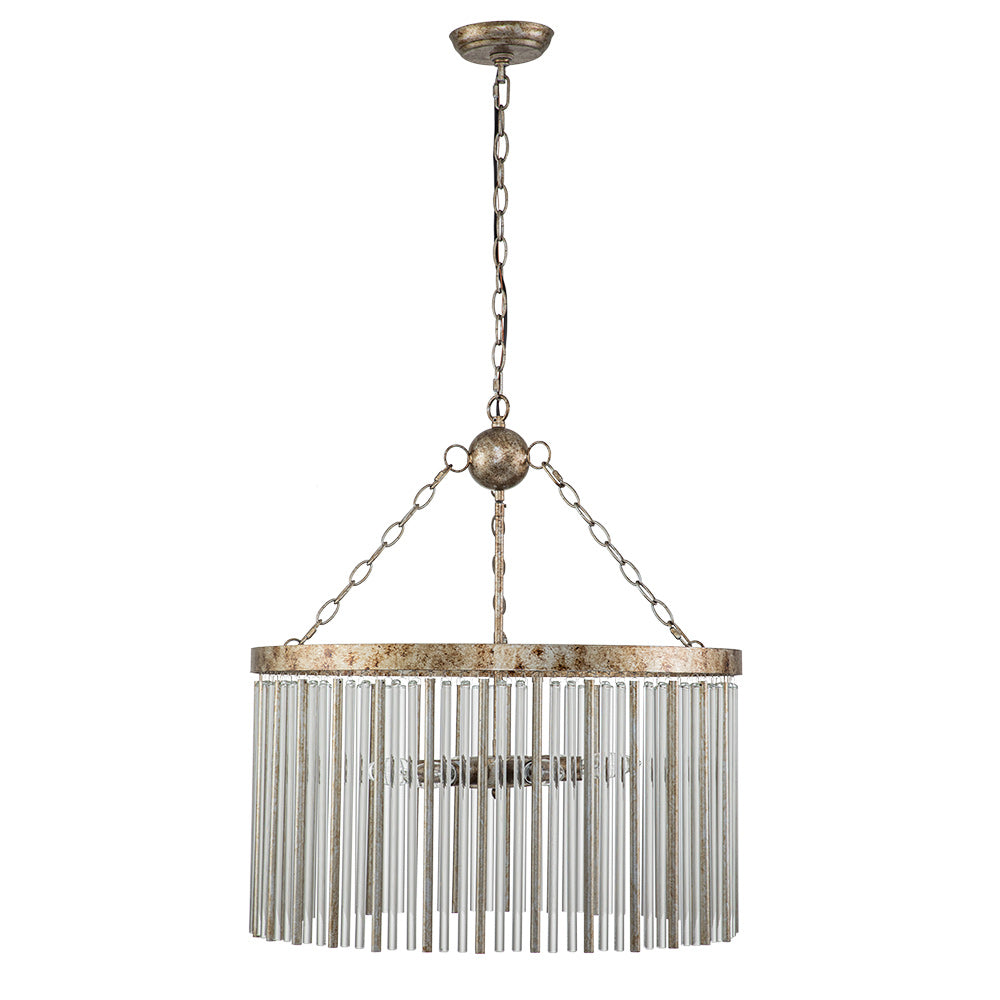 Tämä kattokruunu toimitetaan rummun muotoisessa kehyksessä, jossa on useita kirkkaita kristallikorosteltuja lasitankoja, jotka luovat tyylikkään tyylikkään ilmeen. Sisällä on kuusi E12/E14-pohjaista polttimoa (ei sisällä), jotka valaisevat hämmästyttävän kimaltelevaa vaikutusta lasitankojen läpi, kun ne sytytetään. Aged hopea -viimeistely lisää nuhjuisen tyylikkään kosketuksen tähän hapsuiseen lasikruunuun. Tuloksena on hienostunut kristalliriipus, joka tarjoaa loistavan keskustelupalstan ruokailutilaan, olohuoneeseen, eteiseen tai eteiseen.Detail