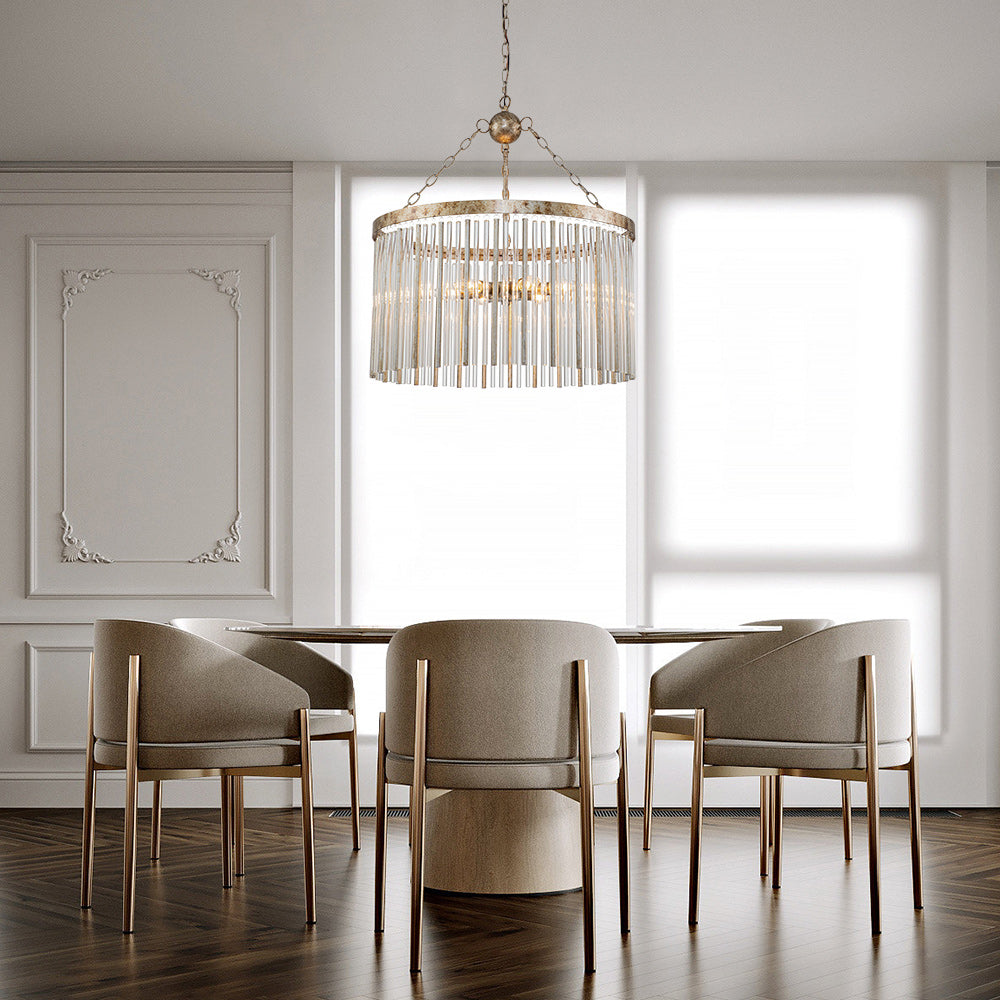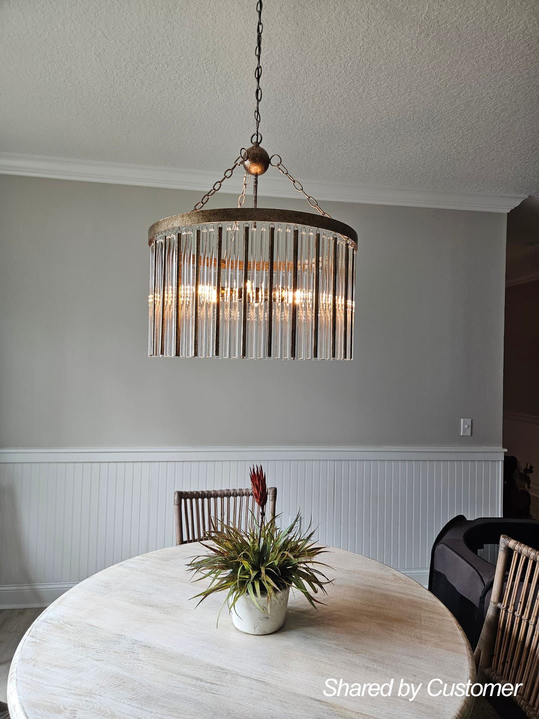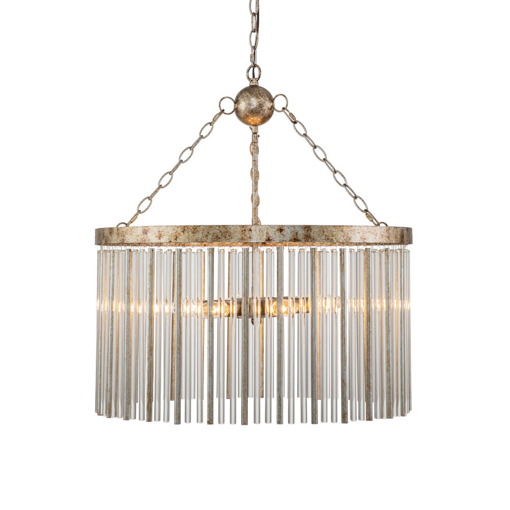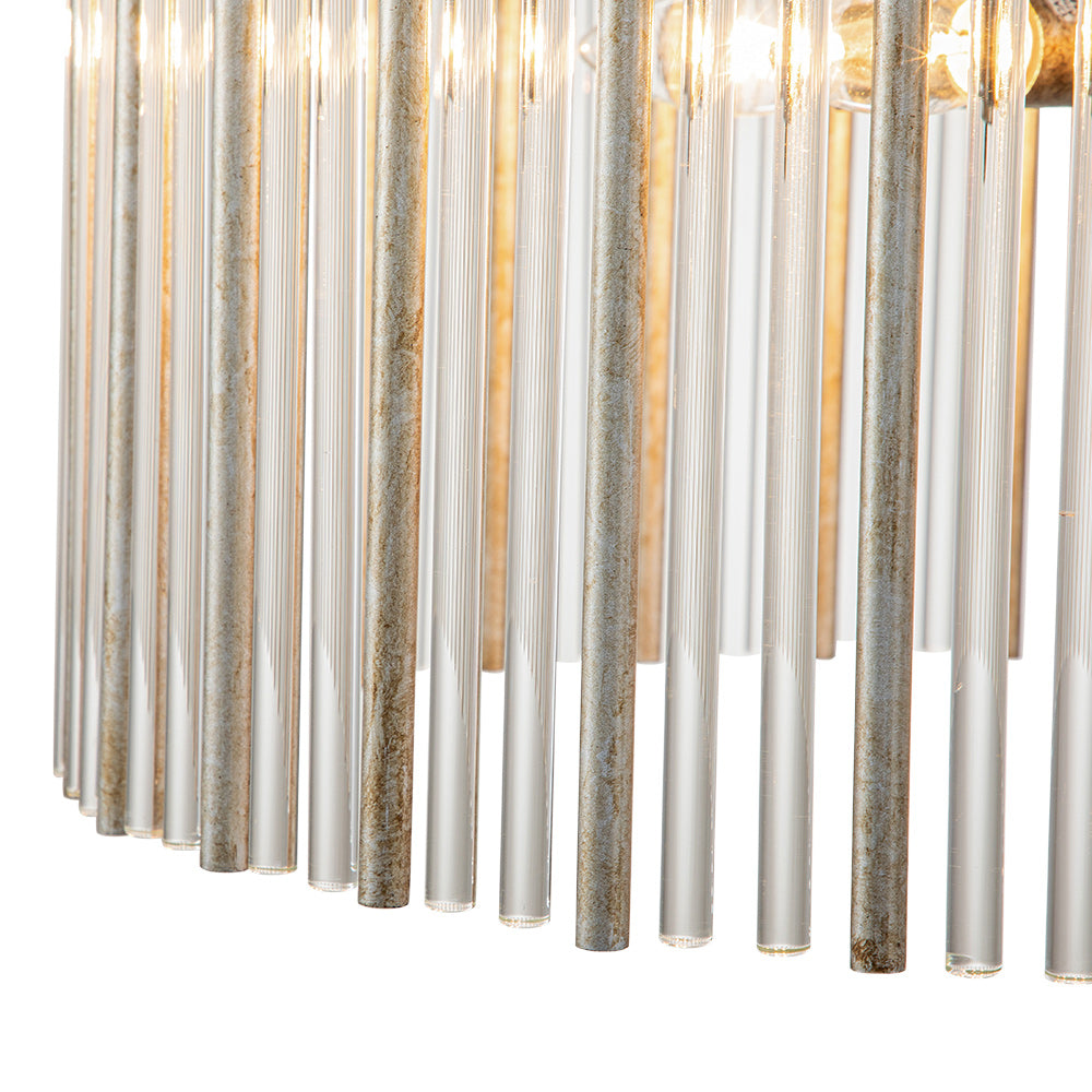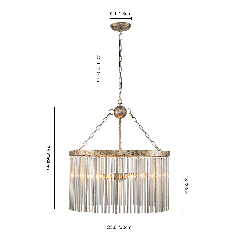 Tämä kattokruunu toimitetaan rummun muotoisessa kehyksessä, jossa on useita kirkkaita kristallikorosteltuja lasitankoja, jotka luovat tyylikkään tyylikkään ilmeen. Sisällä on kuusi E12/E14-pohjaista polttimoa (ei sisällä), jotka valaisevat hämmästyttävän kimaltelevaa vaikutusta lasitankojen läpi, kun ne sytytetään. Aged hopea -viimeistely lisää nuhjuisen tyylikkään kosketuksen tähän hapsuiseen lasikruunuun. Tuloksena on hienostunut kristalliriipus, joka tarjoaa loistavan keskustelupalstan ruokailutilaan, olohuoneeseen, eteiseen tai eteiseen.Detail
